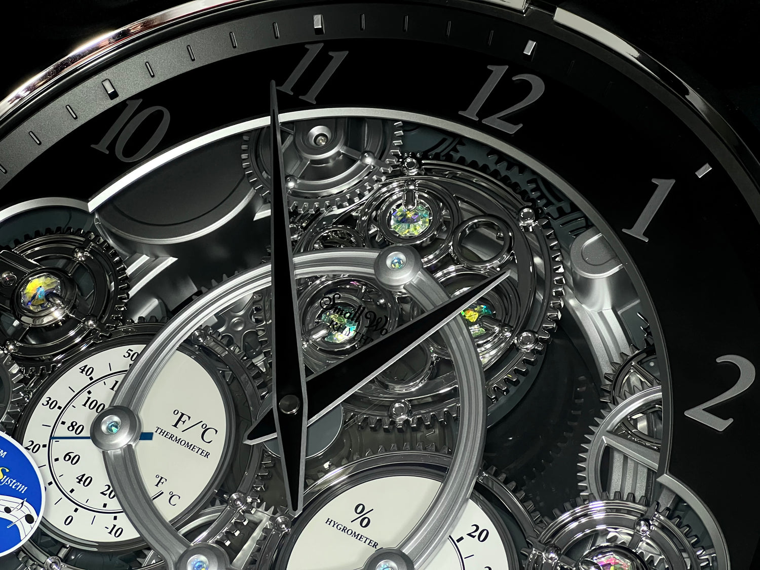 Rhythm's "Gadget" Magic Motion clocks have a spectacular motion…watch as the decorative gears and chapter ring rotate along with one of 30 beautiful melodies. They also feature a functional thermometer and hygrometer. Available in two color variations!