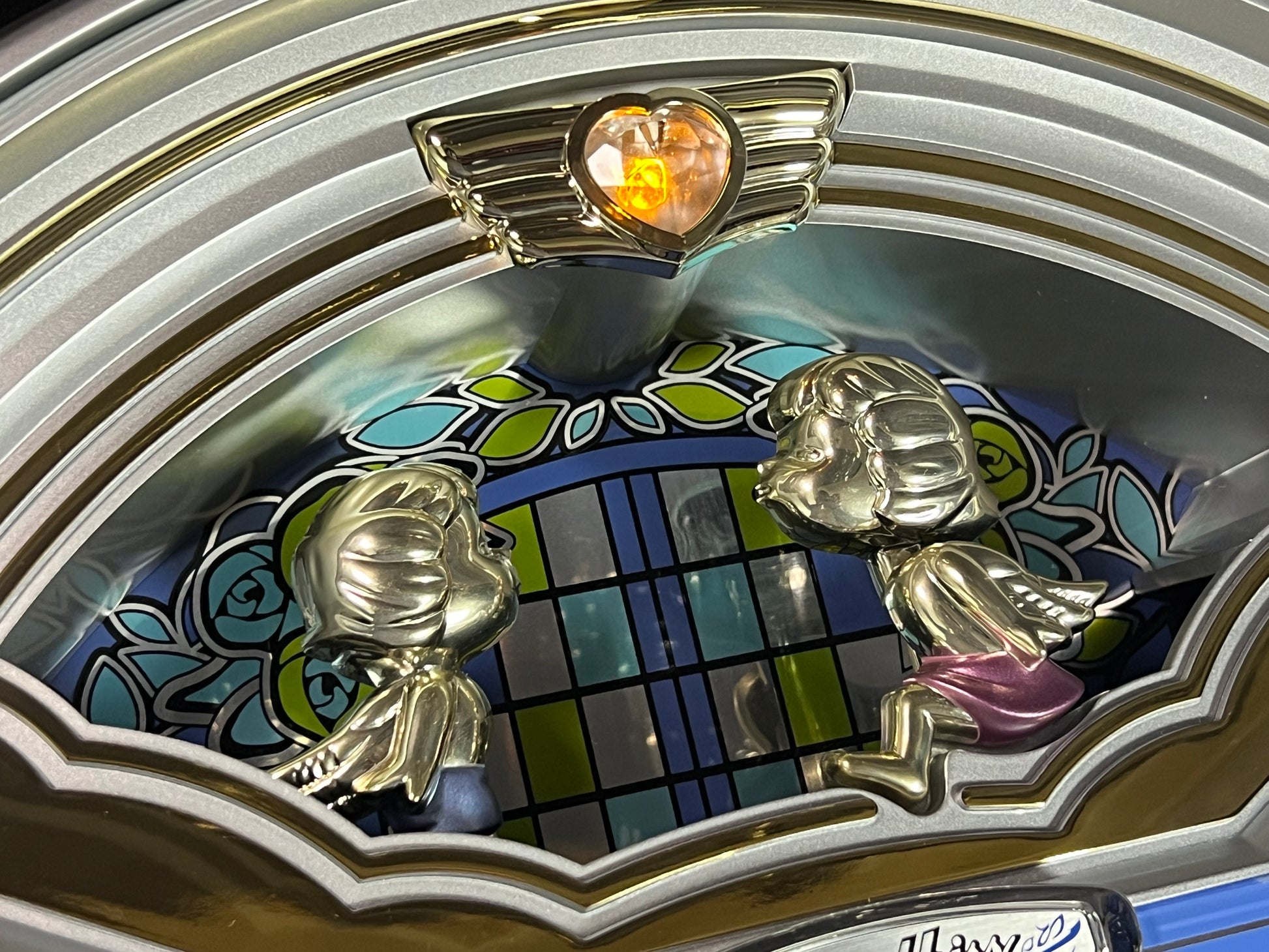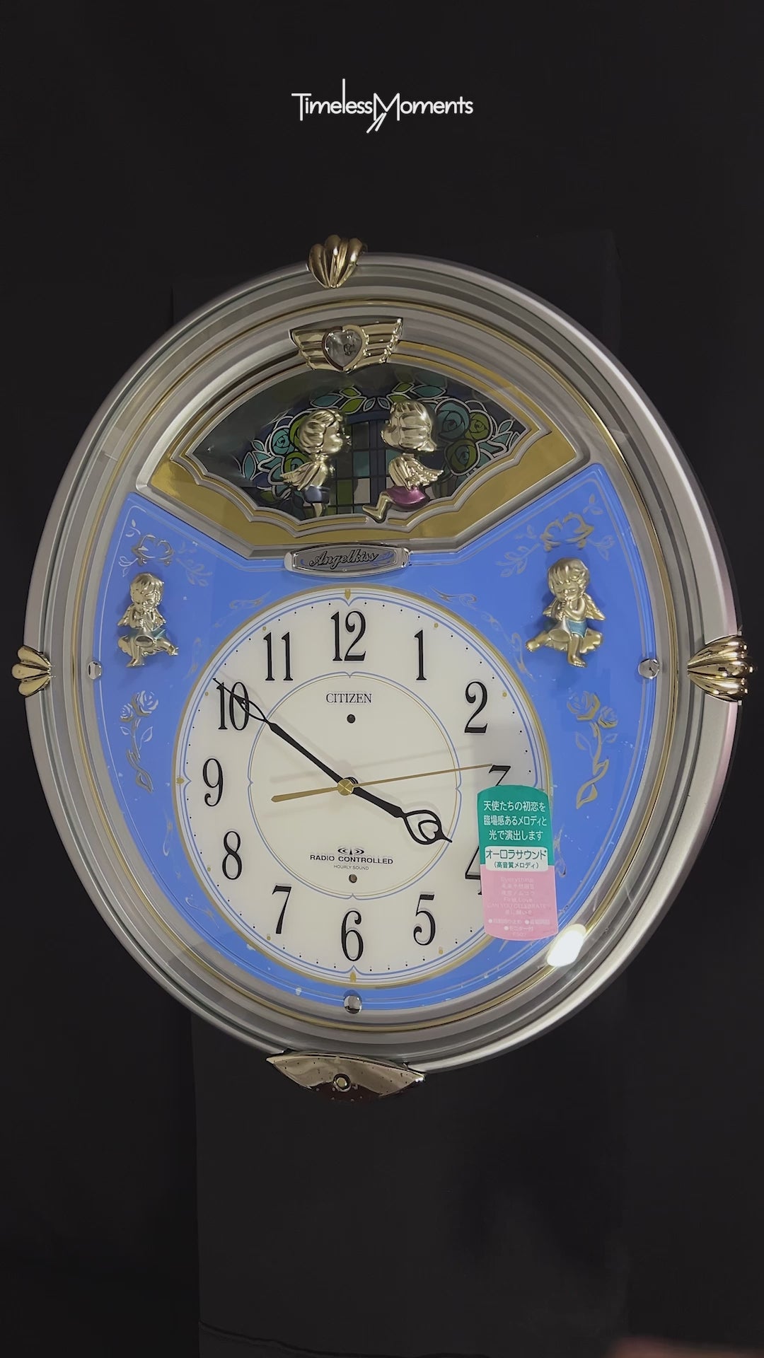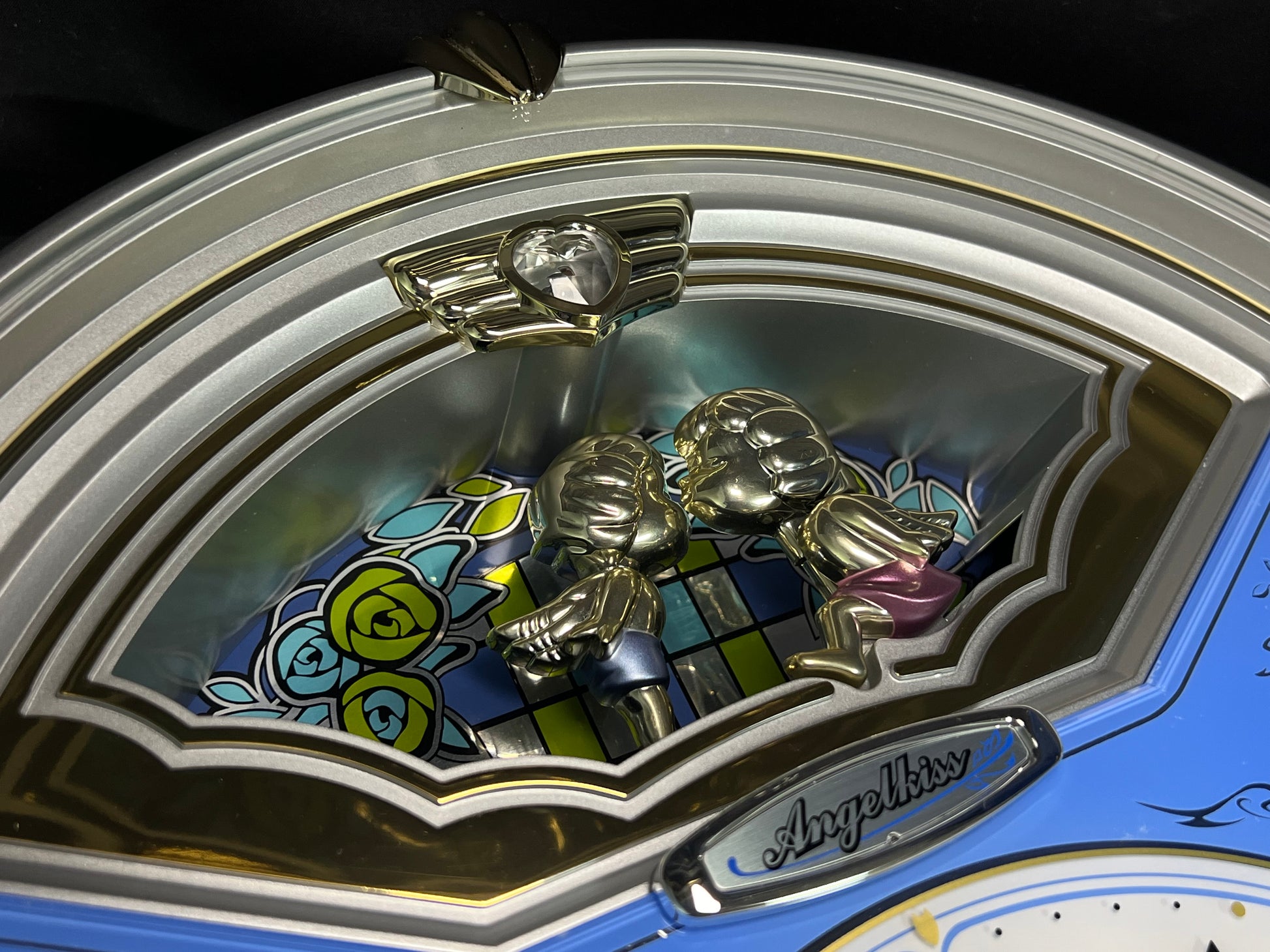 Experience the intimacy of Citizen’s “Angel Kiss” decorative wall clock. It was one of the very first radio-controlled musical clocks released in Japan. A nearly identical version was also released in the USA for a short time with different melodies and a standard quartz movement. The clock has a charming, continuously-moving pendulum with an adorable cherub that leans in to “kiss” the other as the two smaller ones on the dial swing back and forth. The LED light inside of the heart crystal just above the delightful stained glass design flashes along with each of the 6 J-pop melodies as they play. This was also one of the first musical clocks to receive Rhythm’s signature “Clarion Tone System” (CTS) sound (known as “Aurora” sound in Japan). The clock is housed under a convex glass.