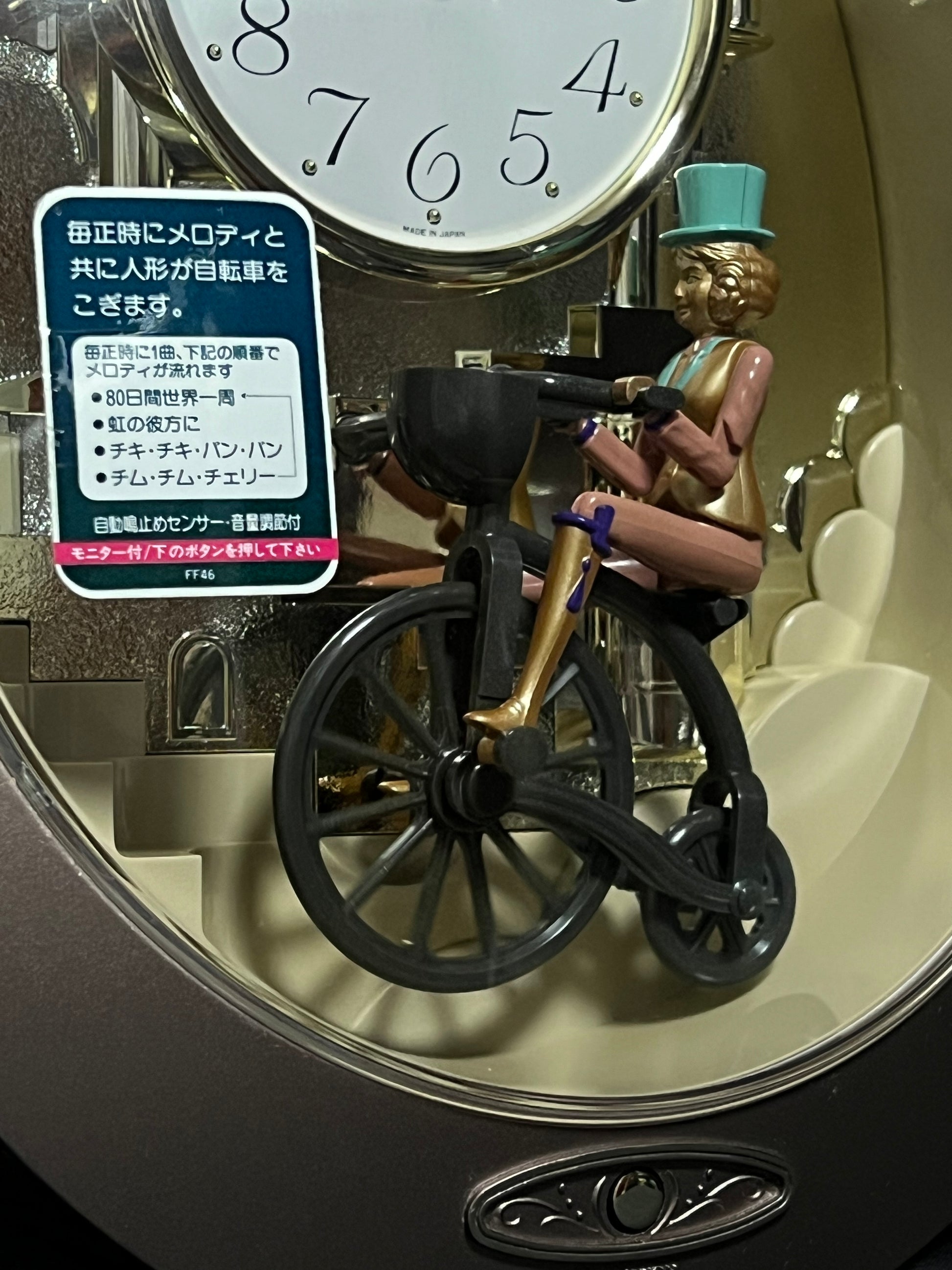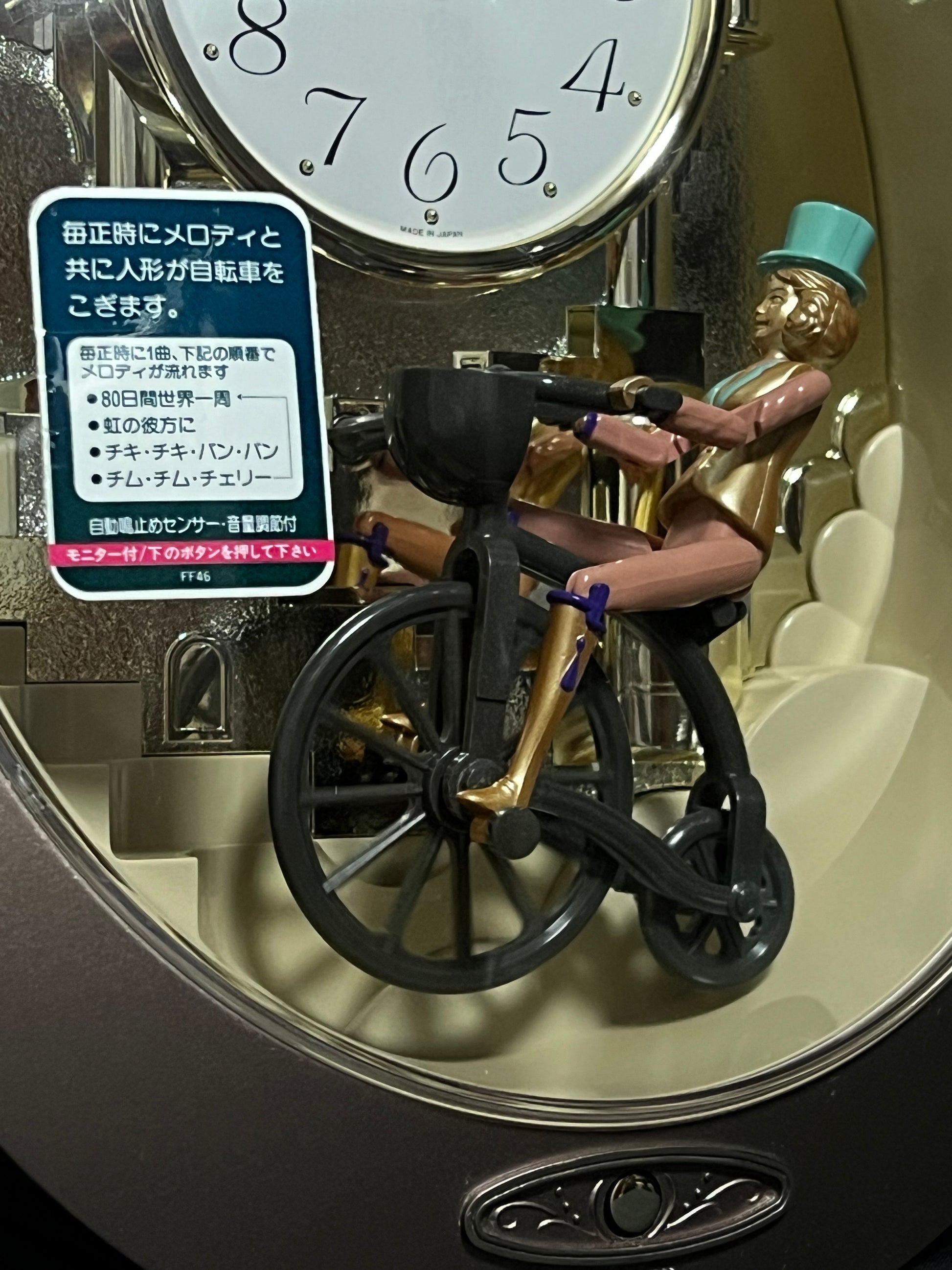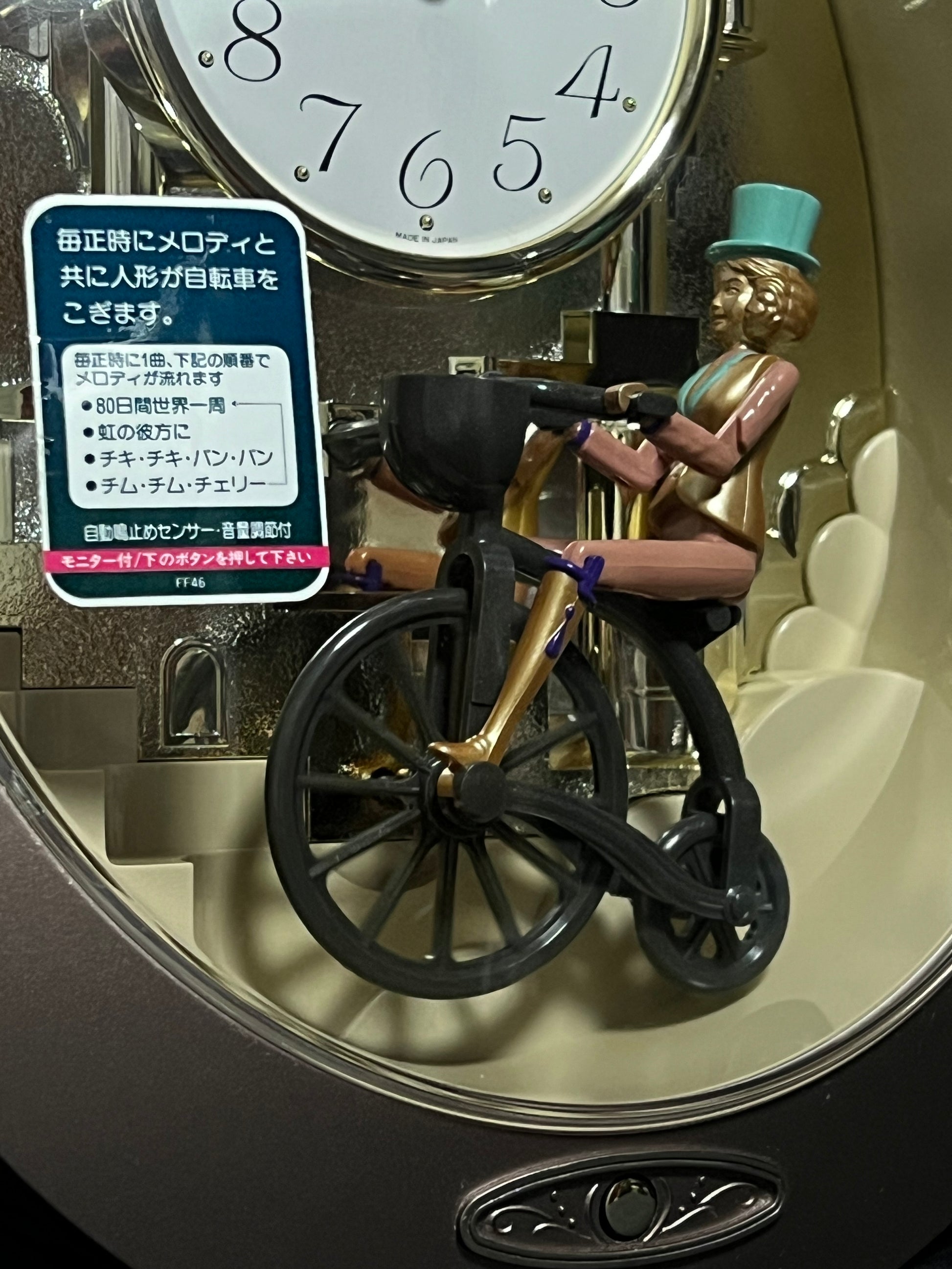 Rhythm's "Small World Wind Story 3" (also known as "Bicycle Mantel") is a playful vintage mantel clock that will take you on a journey every hour. It has a fun, quirky motion in a compact size perfect for a mantel, shelf, or even a desk. It is uncommon for a mantel clock to have moving figures and motion like this one does. This model was sold in the United States for a short time in the 1990s, but it has become very difficult to find. While the music plays, the bicycle wheel rotates as the bicyclist "rides" it...their arms, legs, and body move! It's such an interesting and captivating motion, and it also features some popular themes from older Disney movies.