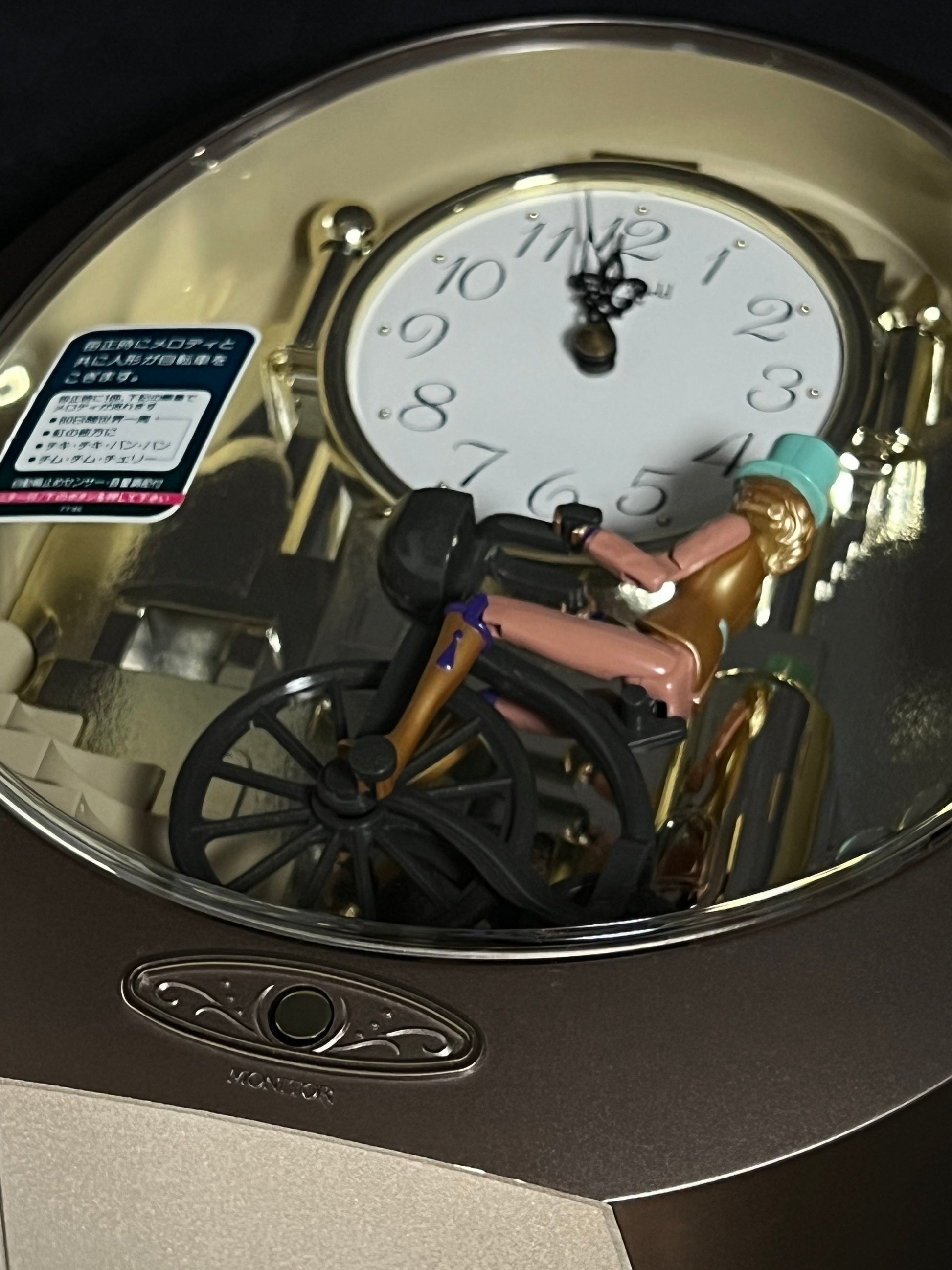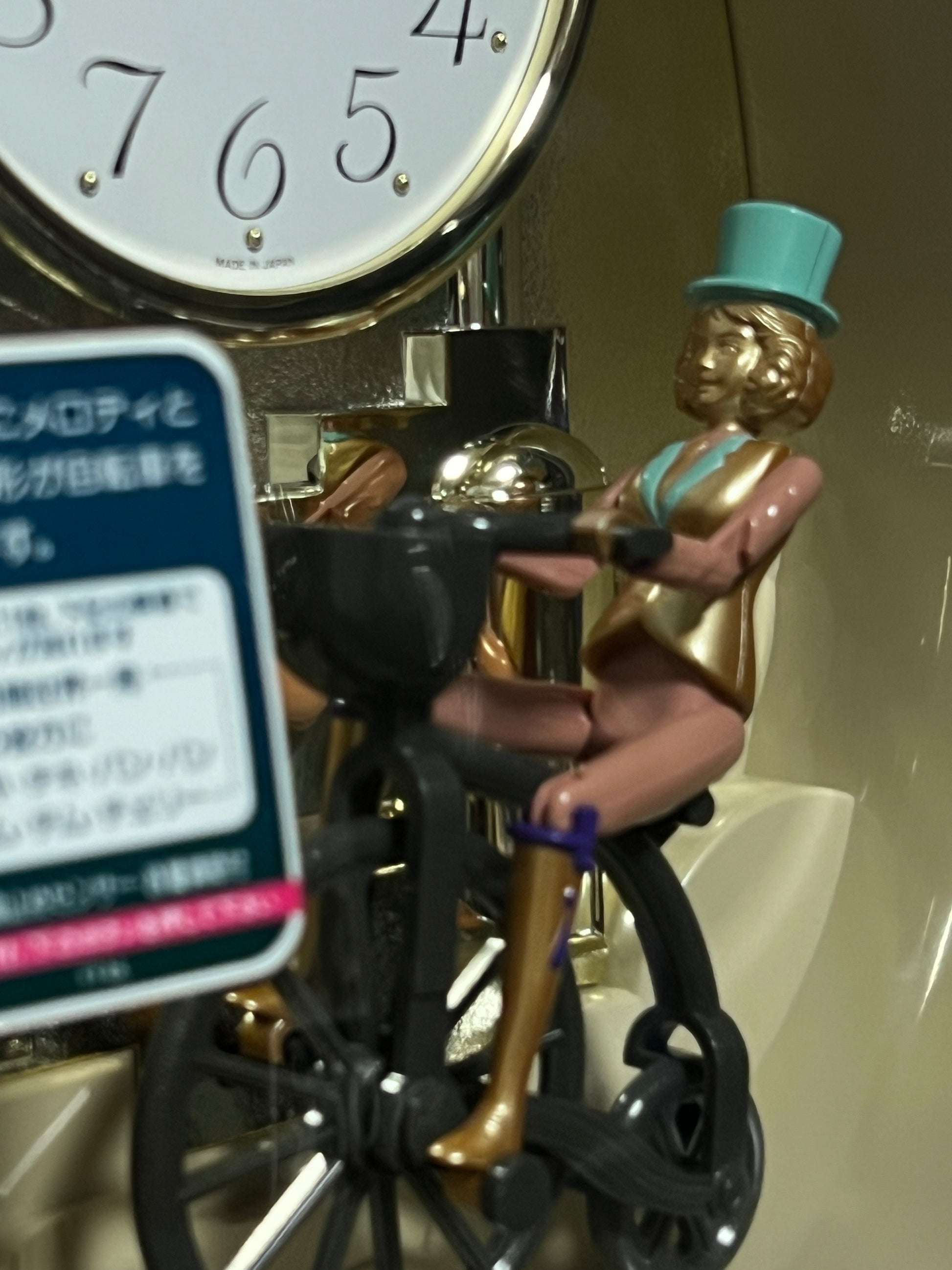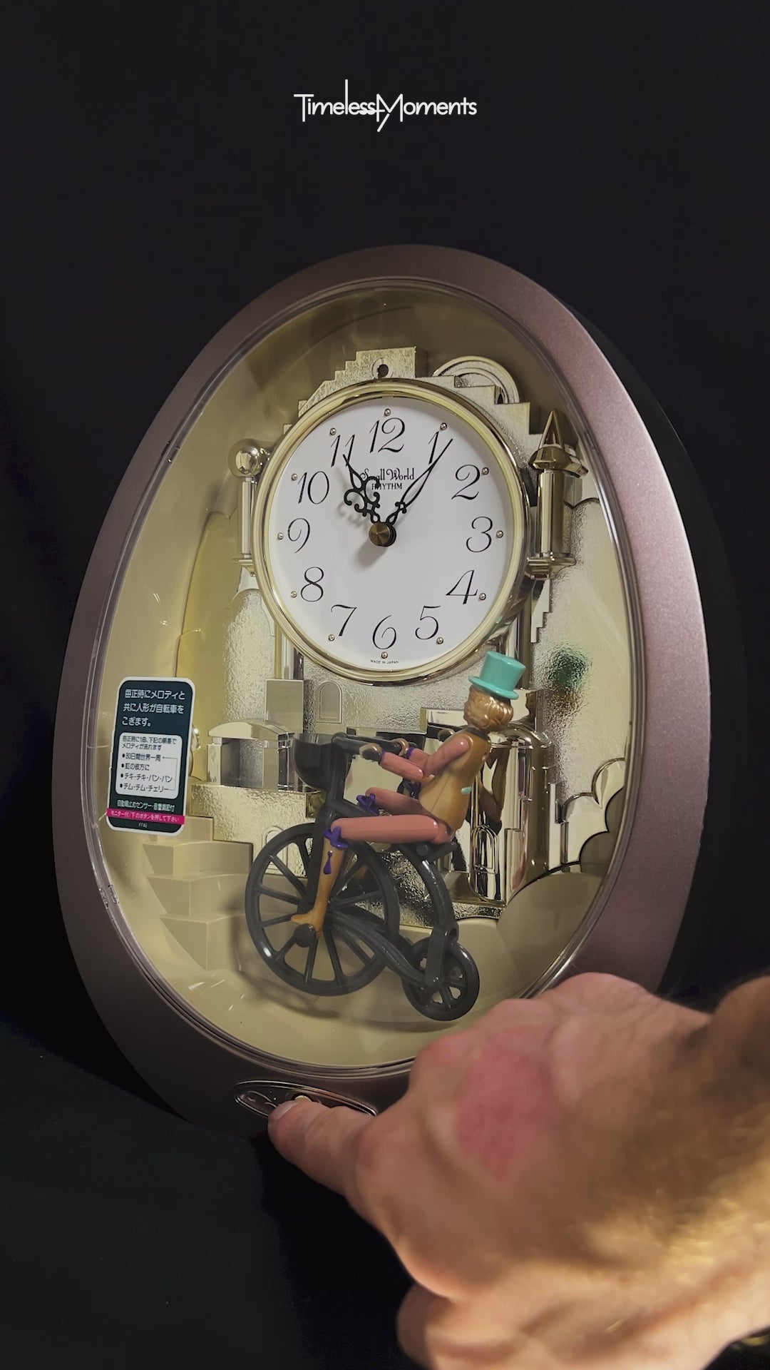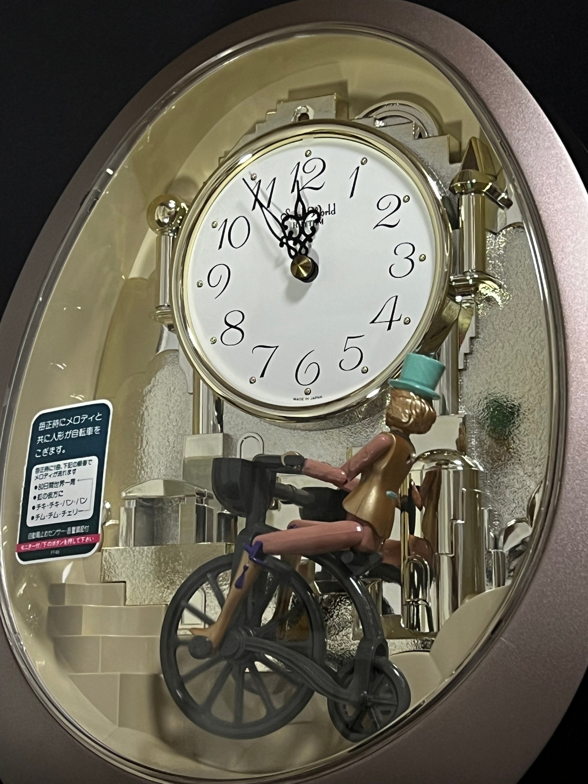 Rhythm's "Small World Wind Story 3" (also known as "Bicycle Mantel") is a playful vintage mantel clock that will take you on a journey every hour. It has a fun, quirky motion in a compact size perfect for a mantel, shelf, or even a desk. It is uncommon for a mantel clock to have moving figures and motion like this one does. This model was sold in the United States for a short time in the 1990s, but it has become very difficult to find. While the music plays, the bicycle wheel rotates as the bicyclist "rides" it...their arms, legs, and body move! It's such an interesting and captivating motion, and it also features some popular themes from older Disney movies.