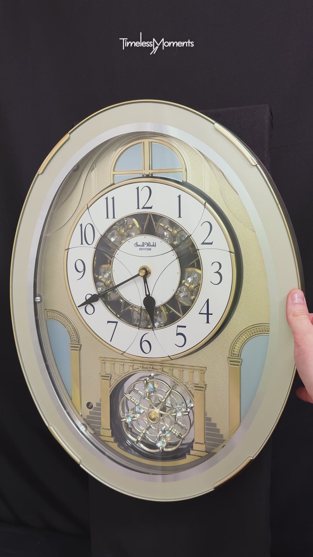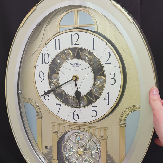 Introducing this brilliant timepiece from Rhythm: the “CTS Brilliance” Magic Motion clock. It was released in 2005 as a follow-up to the success of the “Tri-Cracker” clock, but with an upgraded melody list and a brand-new look. The “CTS Brilliance” swaps out the original version’s hot air balloons for Swarovski crystal decorations and the city skyline for a simplistic cathedral-like atmosphere. At the top of the hour, the partially-transparent dial slides apart into three pieces, and the Swarovski crystal decorations rotate along. The ornamental wheel below the face, which is also adorned with Swarovski crystals, rotates continuously. “CTS Brilliance” plays your choice of 12 well-known melodies, including hits like “My Way” and “Bridge Over Troubled Water”, or 3 Christmas melodies.