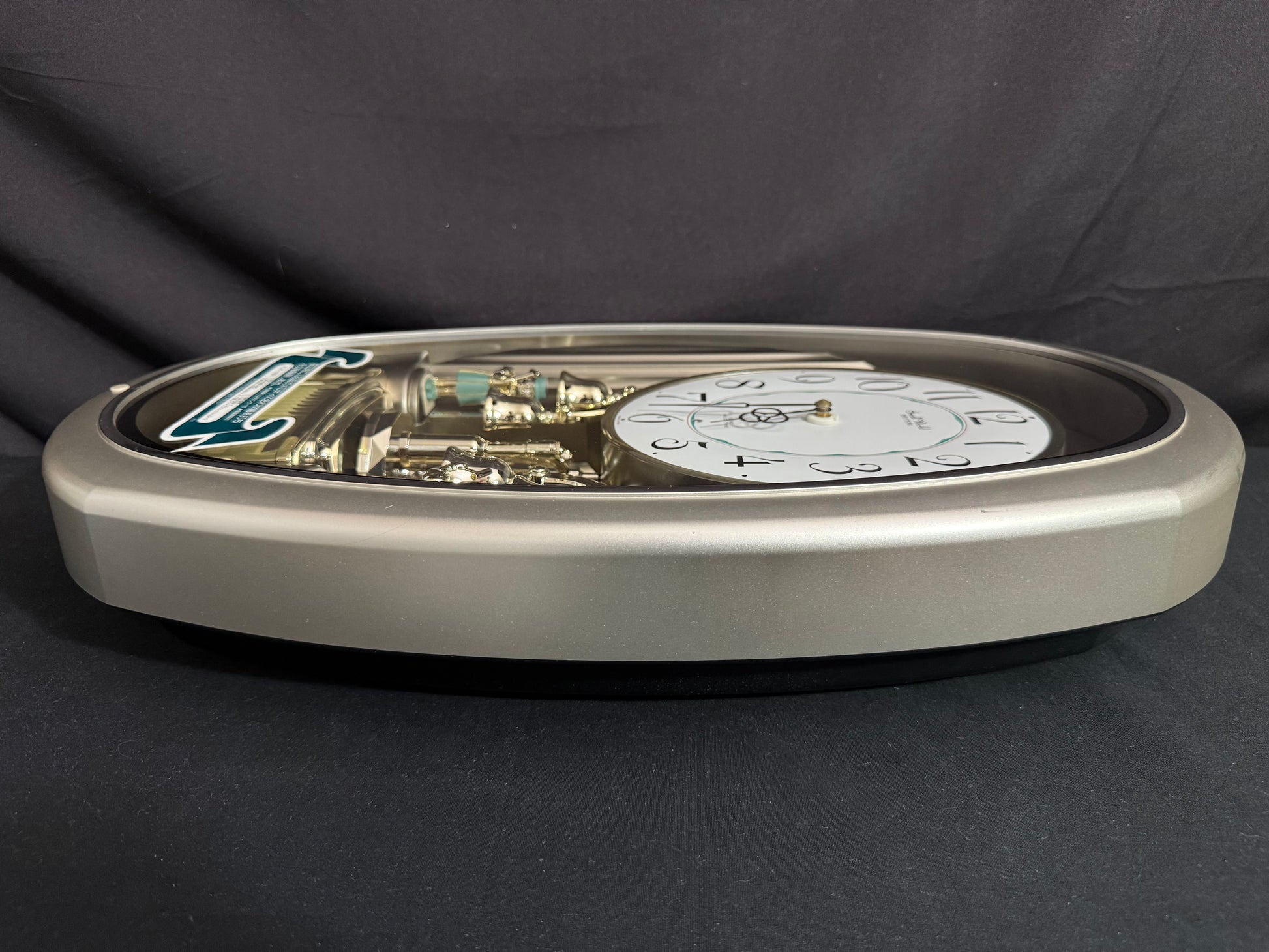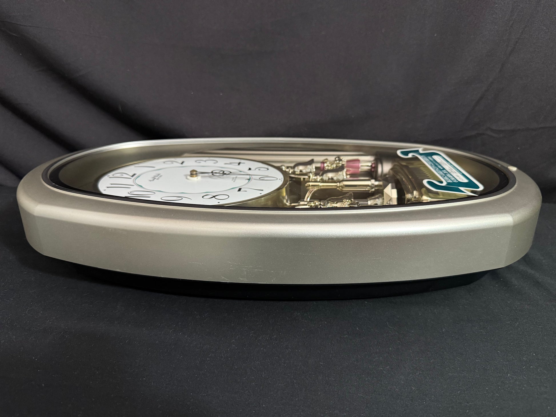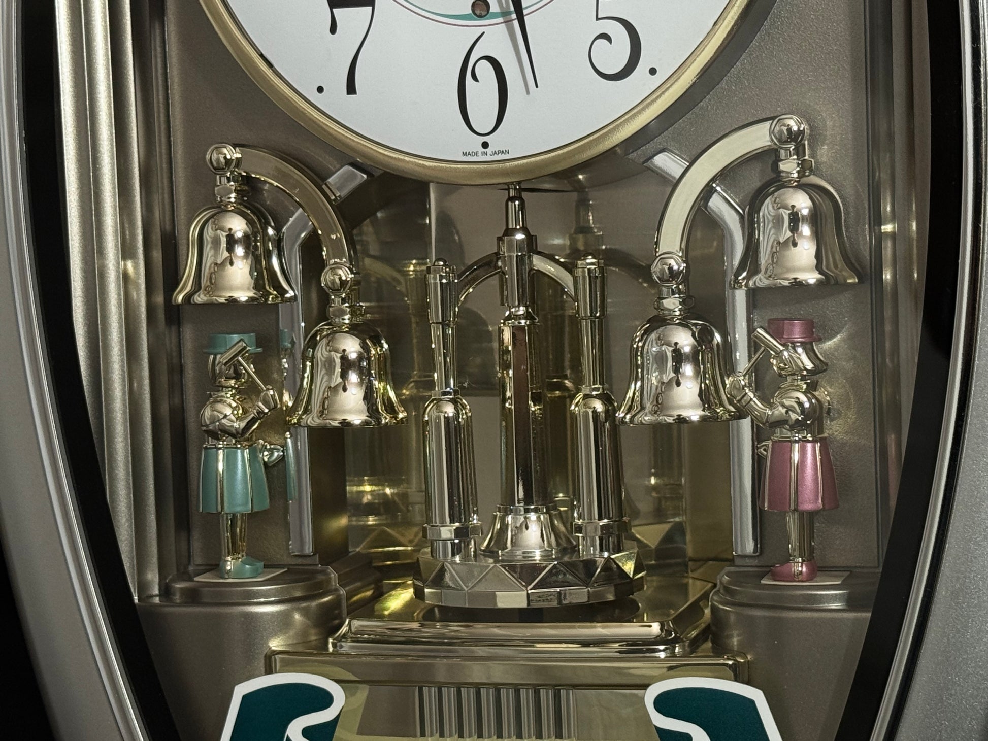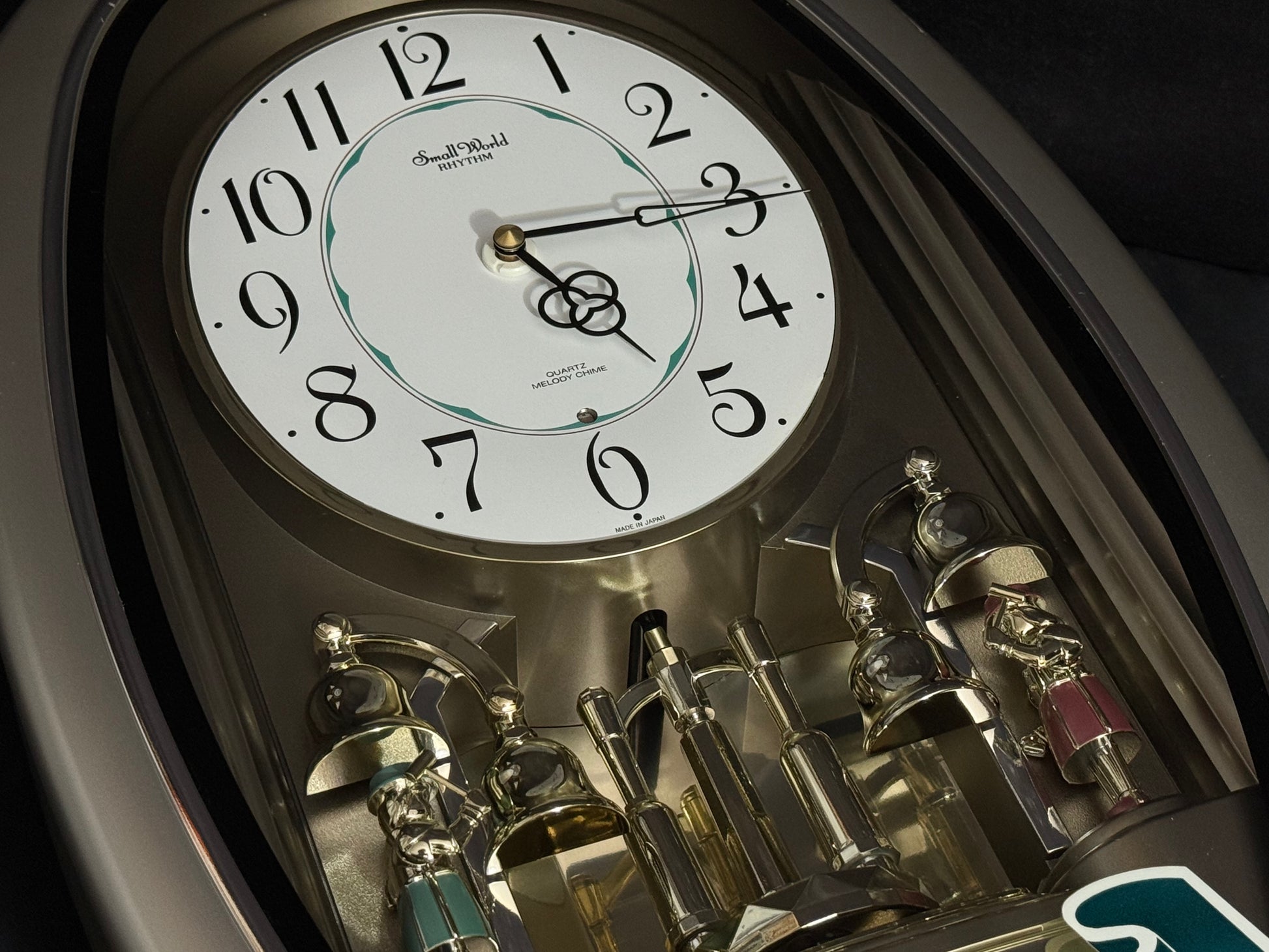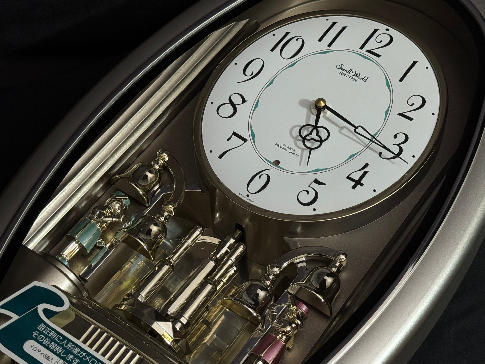Count the hours along with the vintage “Small World Mènèt 3N” Magic Motion clock from Rhythm. Sometimes nicknamed "Champagne Ringers", this model released exclusively in Japan in the late '90s alongside its more-commonly found counterpart, known in the United States as the "Golden Ringers". As a member of Rhythm’s Mènèt series, the “Mènèt 3N” features two golden ringers that “strike” the bells along to one of six classical melodies, and then count the hour afterwards in Rhythm's striking FM sound. The decorative rotary pendulum between the ringers rotates continuously ahead of a gold-mirrored backdrop. It features a plastic frame with a demonstration button on the bottom front to enjoy the hourly sound and motion at any time.