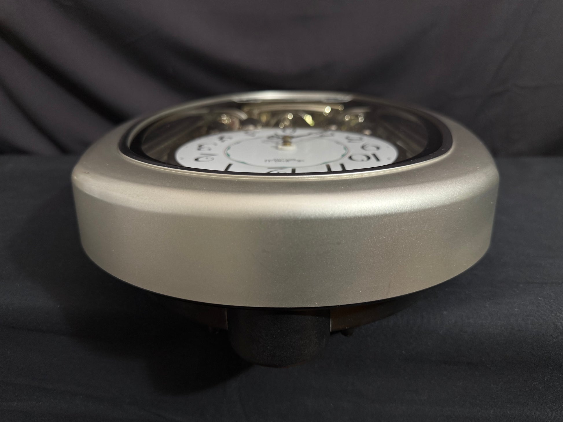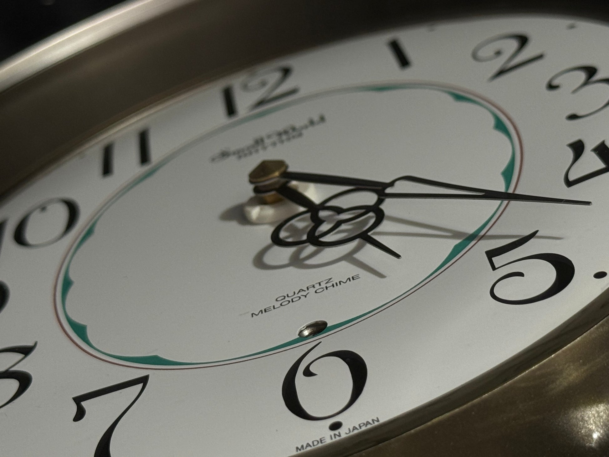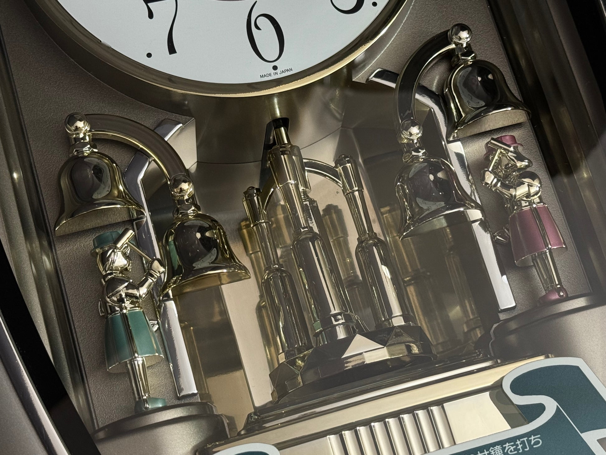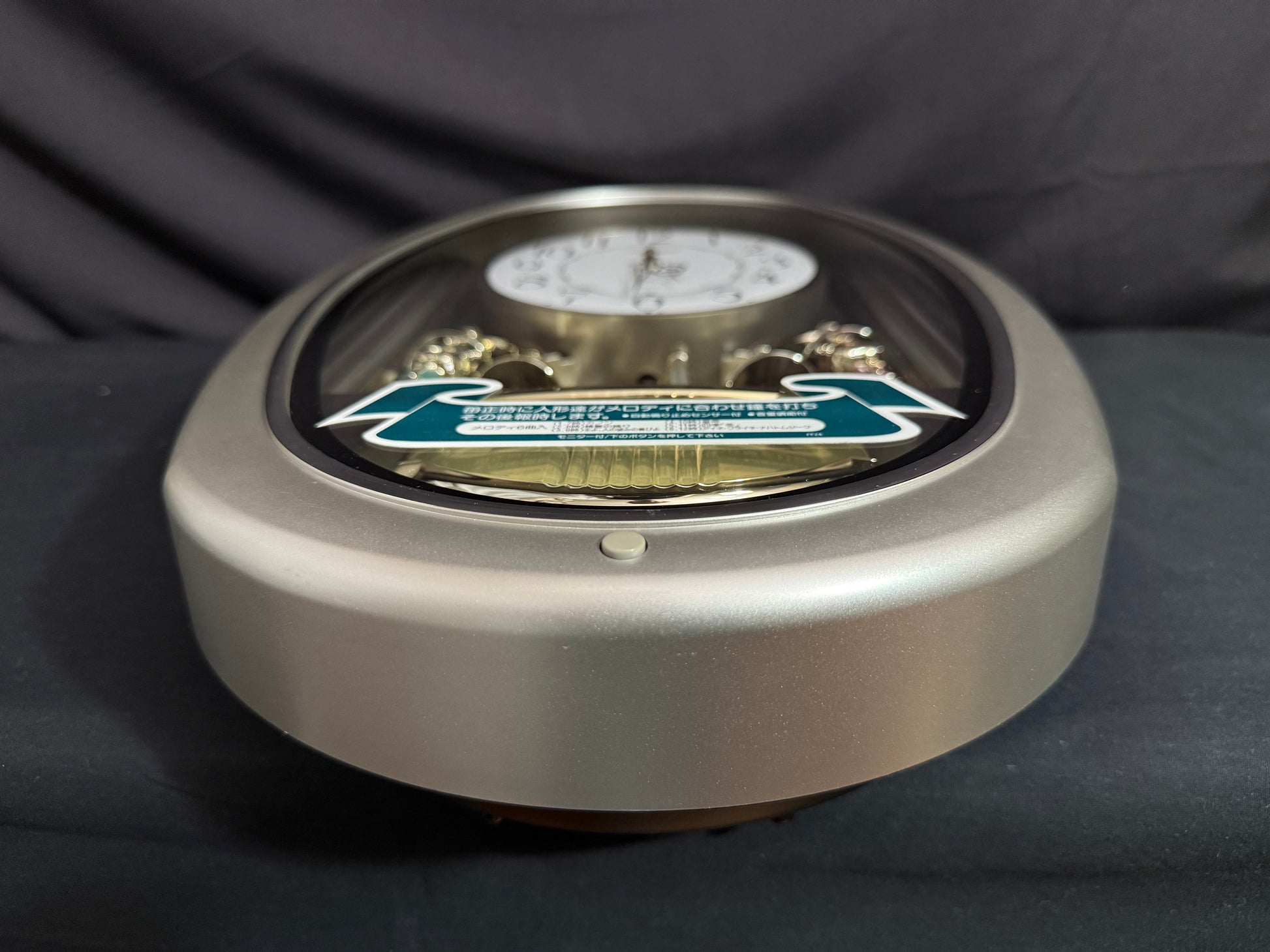 Count the hours along with the vintage “Small World Mènèt 3N” Magic Motion clock from Rhythm. Sometimes nicknamed "Champagne Ringers", this model released exclusively in Japan in the late '90s alongside its more-commonly found counterpart, known in the United States as the "Golden Ringers". As a member of Rhythm’s Mènèt series, the “Mènèt 3N” features two golden ringers that “strike” the bells along to one of six classical melodies, and then count the hour afterwards in Rhythm's striking FM sound. The decorative rotary pendulum between the ringers rotates continuously ahead of a gold-mirrored backdrop. It features a plastic frame with a demonstration button on the bottom front to enjoy the hourly sound and motion at any time.