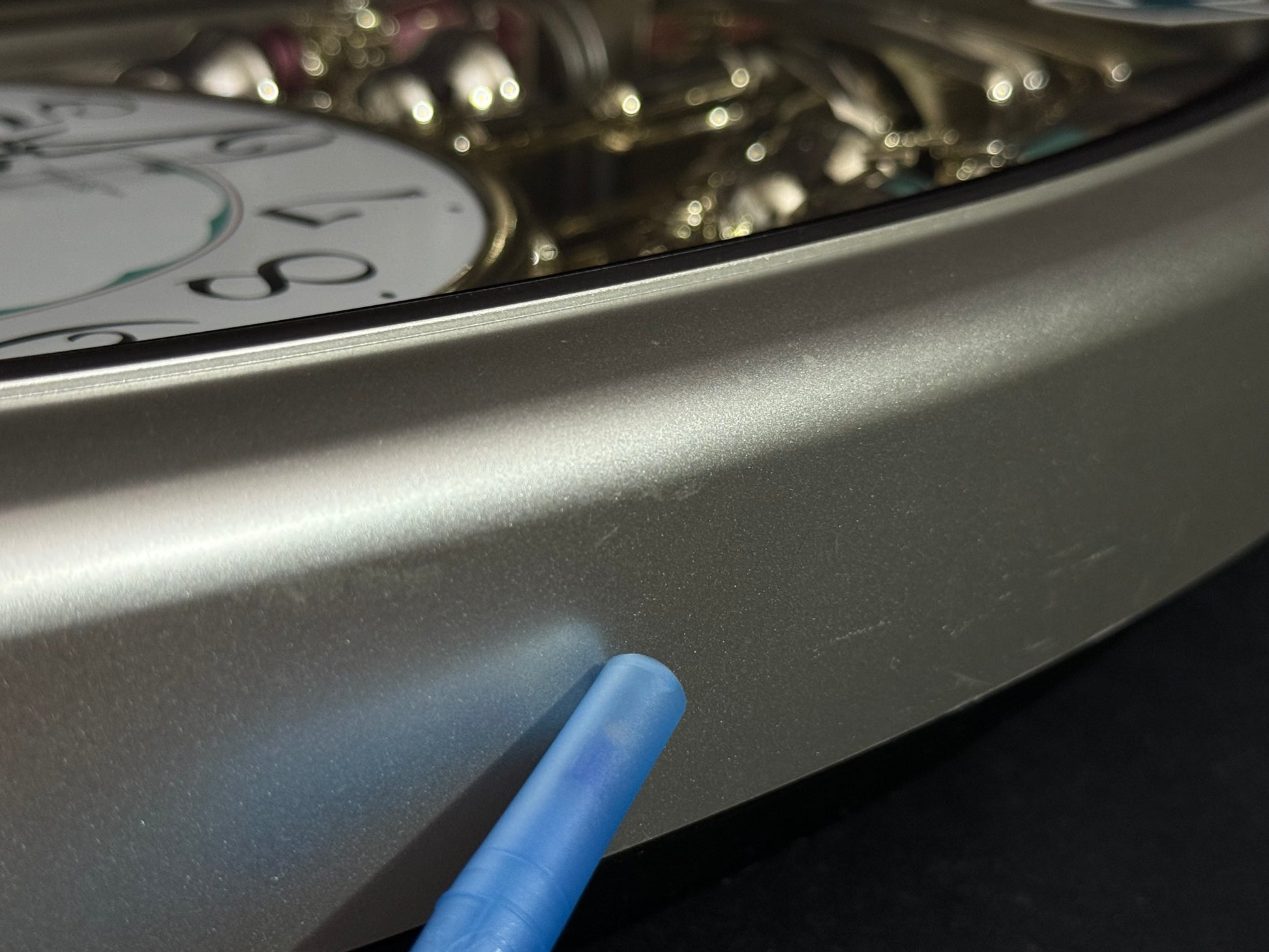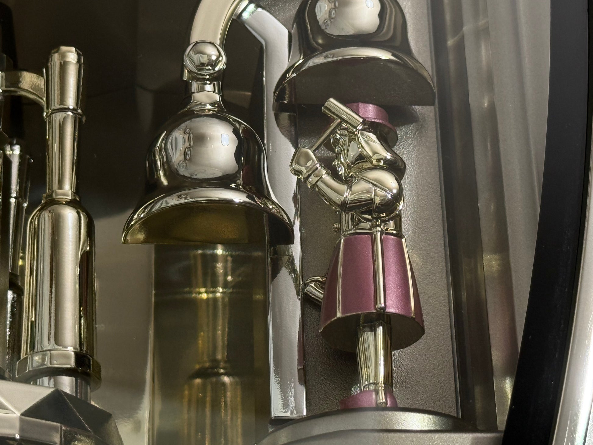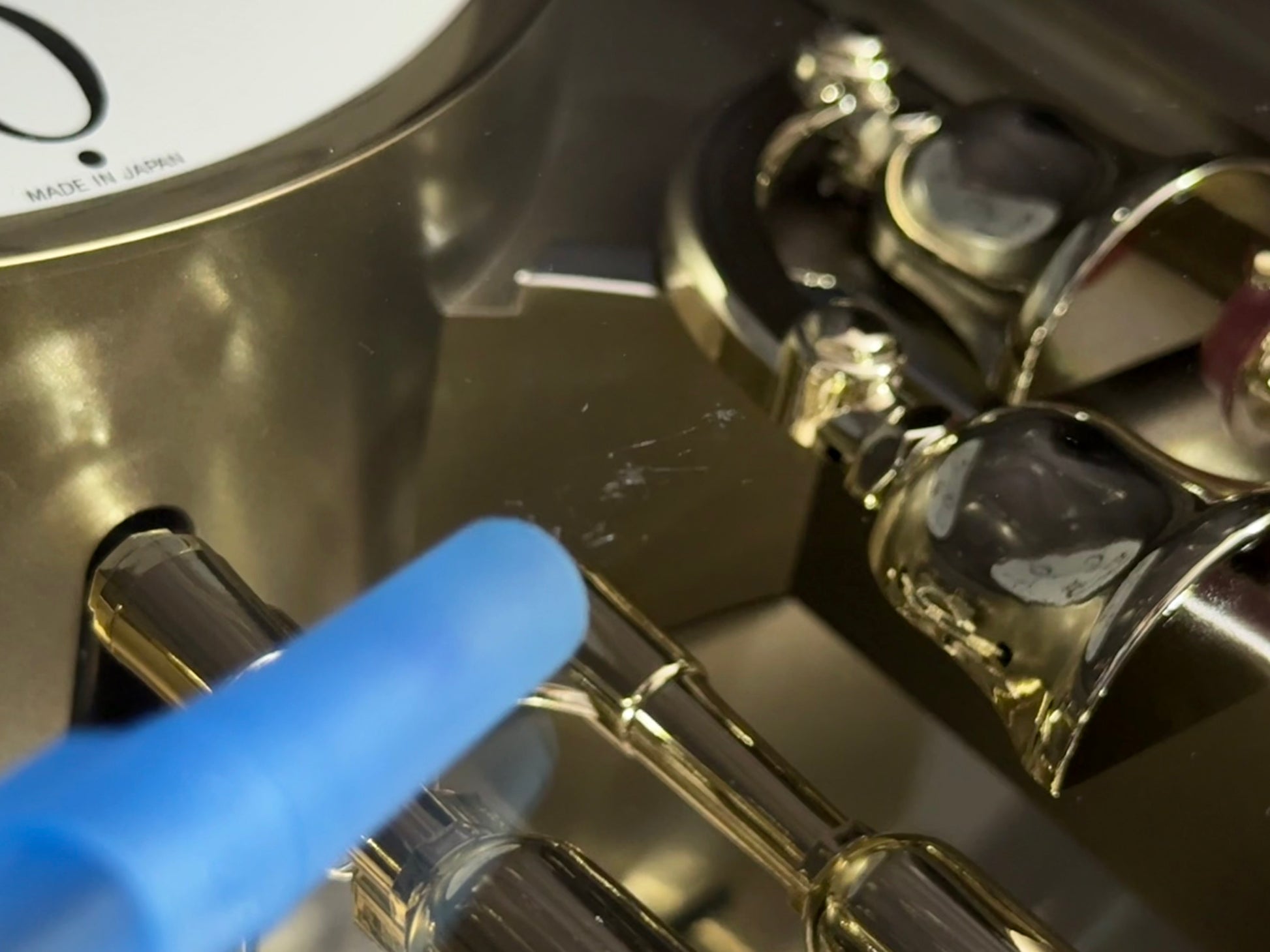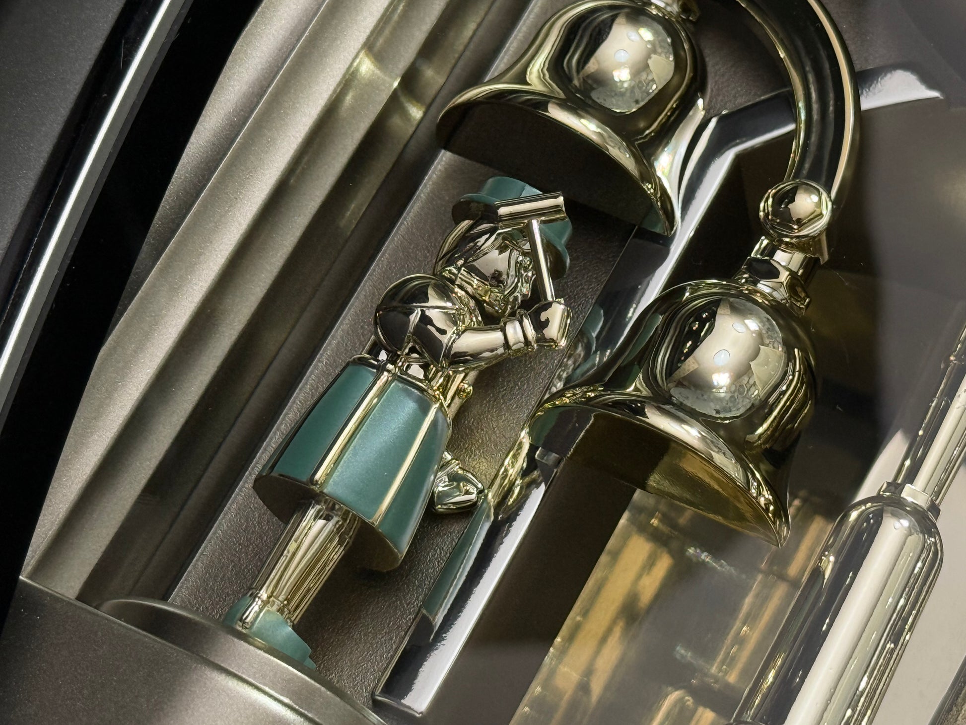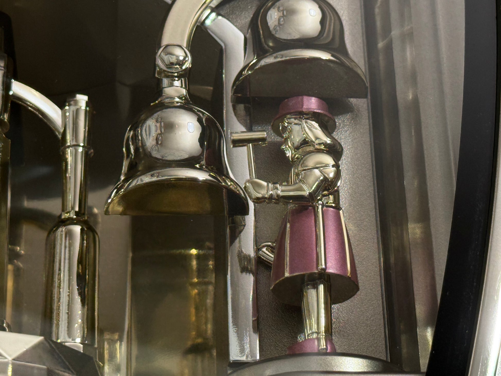 Count the hours along with the vintage “Small World Mènèt 3N” Magic Motion clock from Rhythm. Sometimes nicknamed "Champagne Ringers", this model released exclusively in Japan in the late '90s alongside its more-commonly found counterpart, known in the United States as the "Golden Ringers". As a member of Rhythm’s Mènèt series, the “Mènèt 3N” features two golden ringers that “strike” the bells along to one of six classical melodies, and then count the hour afterwards in Rhythm's striking FM sound. The decorative rotary pendulum between the ringers rotates continuously ahead of a gold-mirrored backdrop. It features a plastic frame with a demonstration button on the bottom front to enjoy the hourly sound and motion at any time.