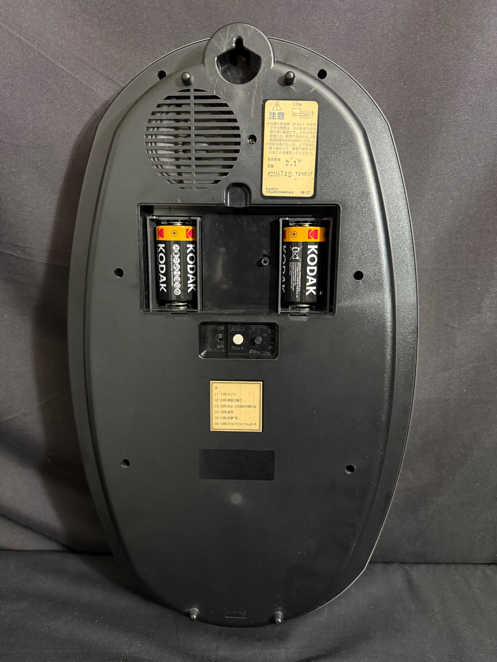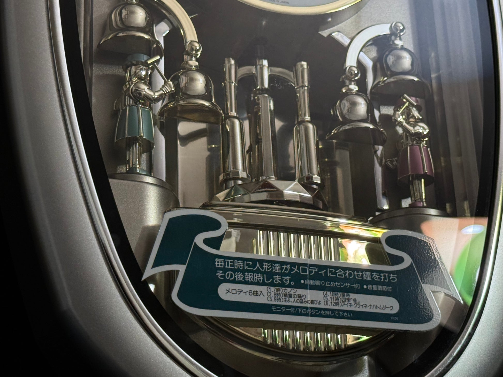 - On/off switch to turn hourly music on or off