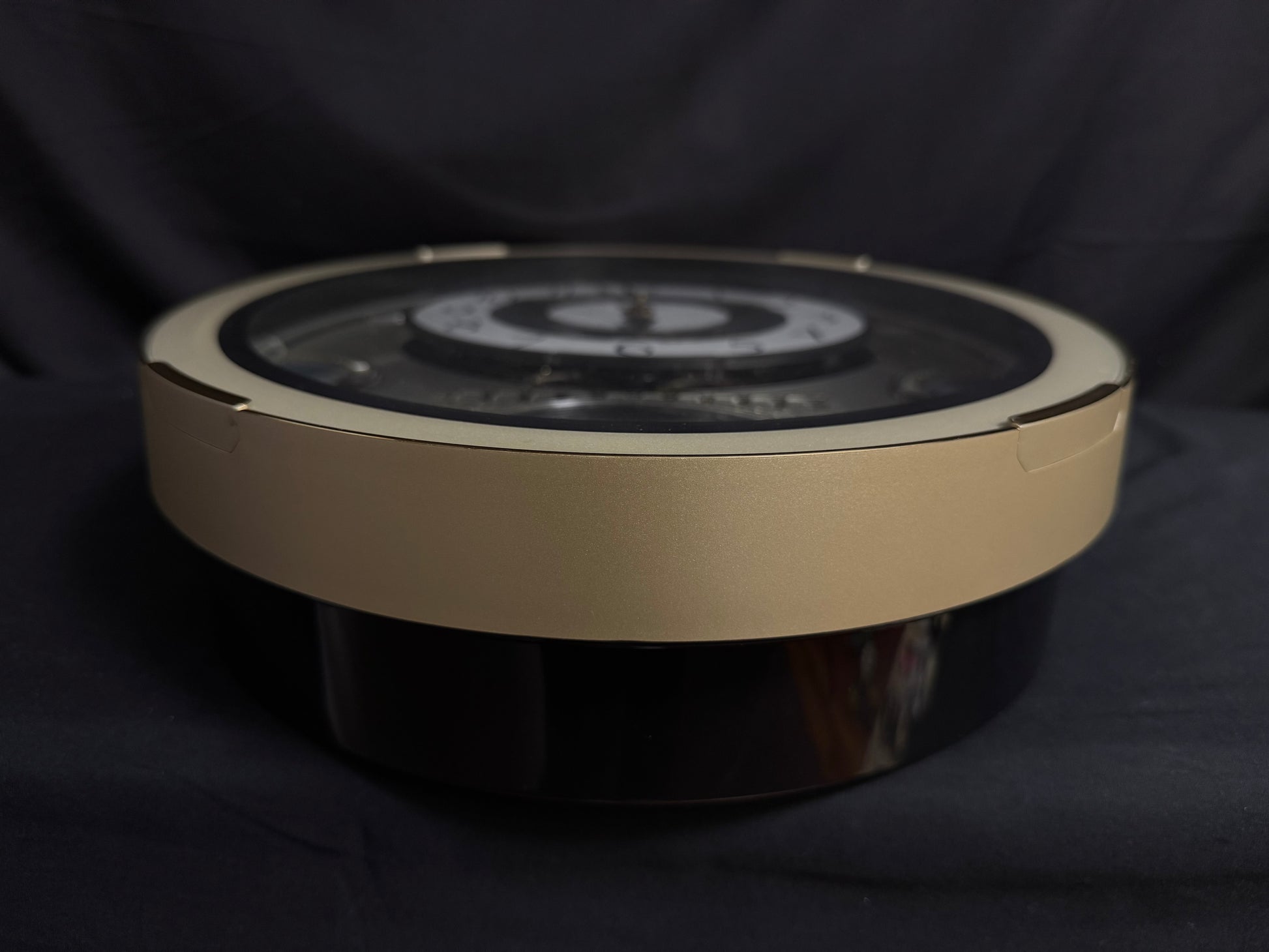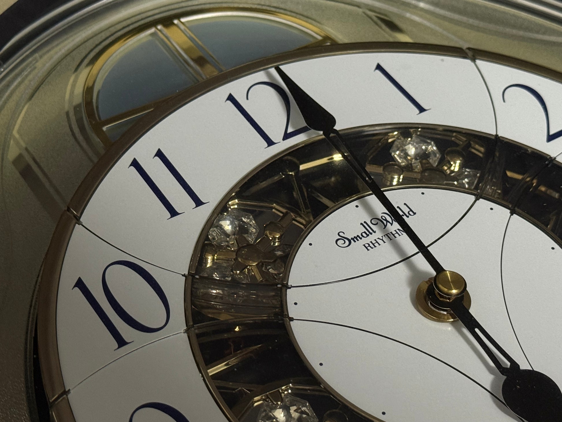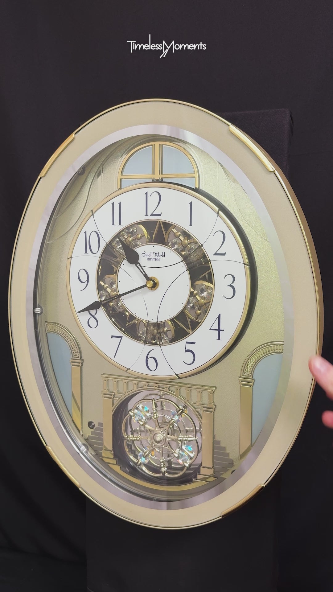This is Rhythm’s “Classic Brilliance” magic motion clock. It was released in 2009 as an updated version of the popular “CTS Brilliance” and “Tri-Cracker” clocks, with a cathedral-like theme and a champagne-colored case. Similar to the “Tri-Cracker” models, the dial slides apart into three pieces, revealing multiple rotating Swarovski crystal decorations that rotate naturally. The ornamental wheel below the face, which is also adorned with Swarovski crystals, rotates continuously. The clock plays a total of 16 melodies, split into two sections: 12 classical melodies, and 4 Christmas songs.