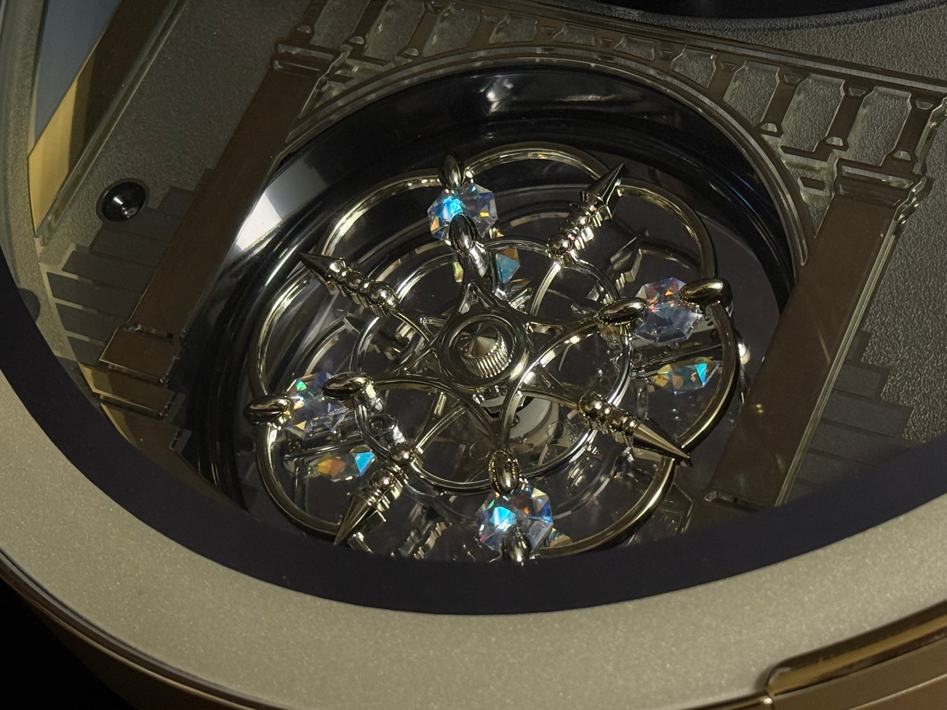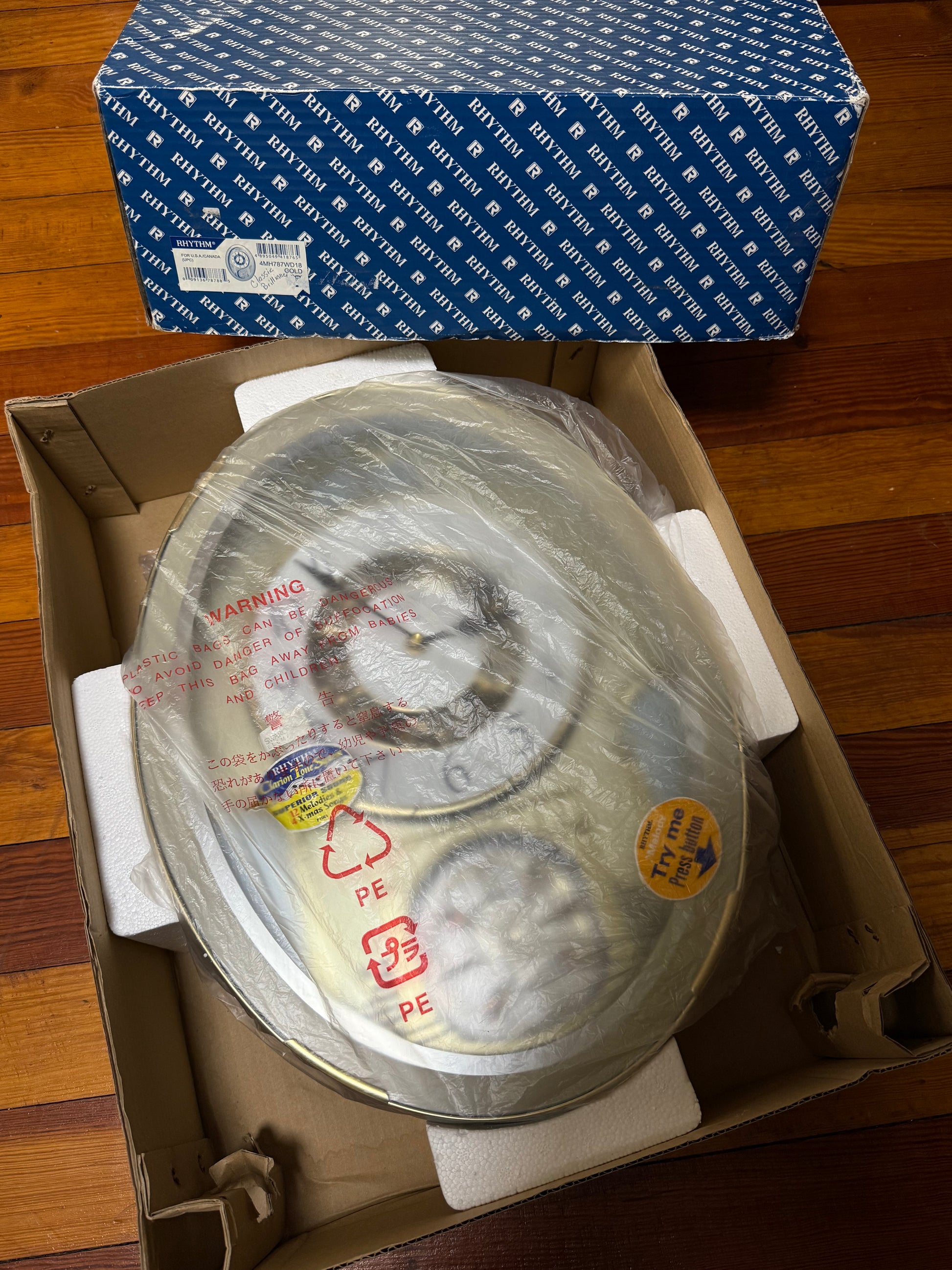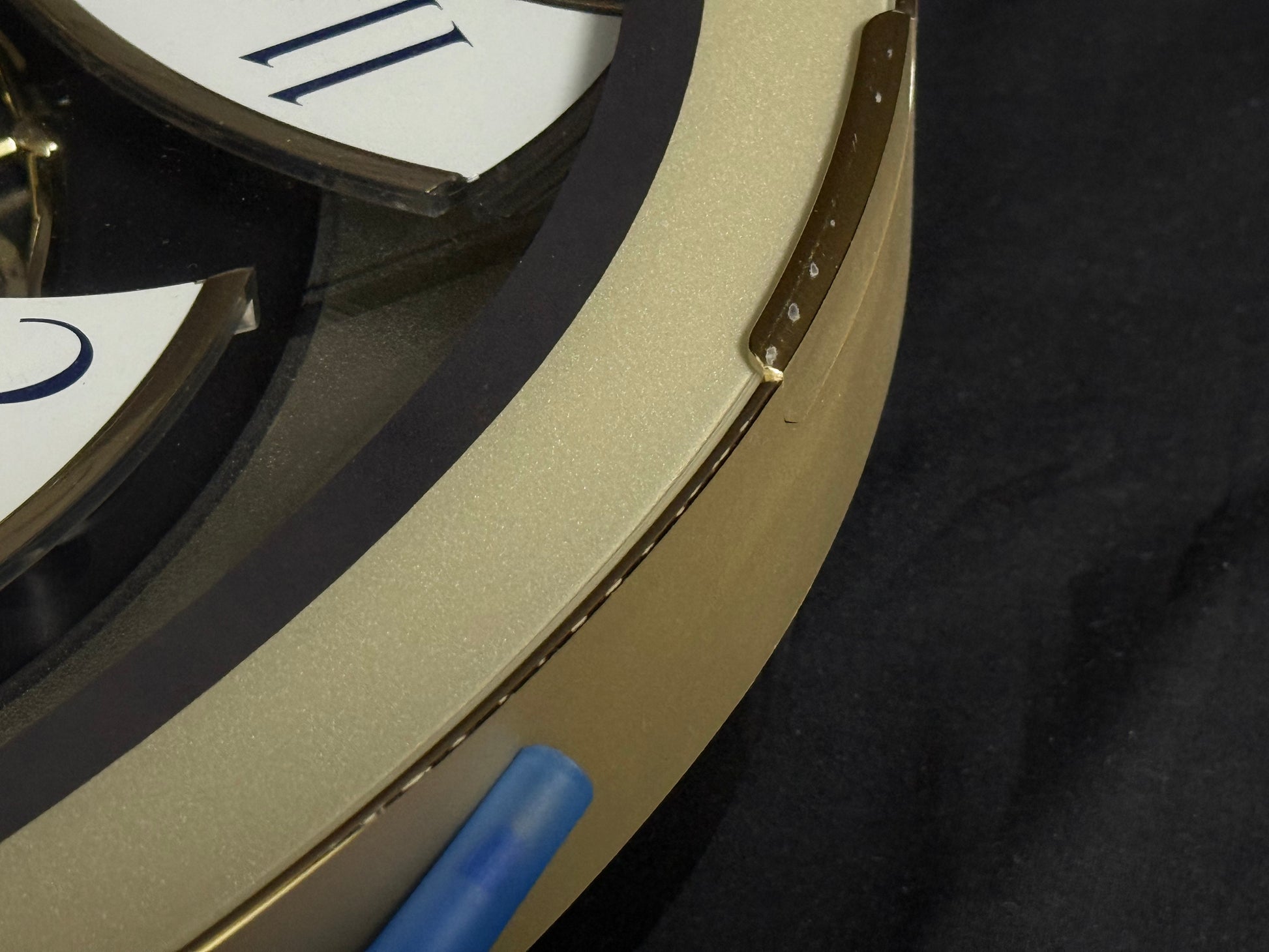 This is Rhythm’s “Classic Brilliance” magic motion clock. It was released in 2009 as an updated version of the popular “CTS Brilliance” and “Tri-Cracker” clocks, with a cathedral-like theme and a champagne-colored case. Similar to the “Tri-Cracker” models, the dial slides apart into three pieces, revealing multiple rotating Swarovski crystal decorations that rotate naturally. The ornamental wheel below the face, which is also adorned with Swarovski crystals, rotates continuously. The clock plays a total of 16 melodies, split into two sections: 12 classical melodies, and 4 Christmas songs.