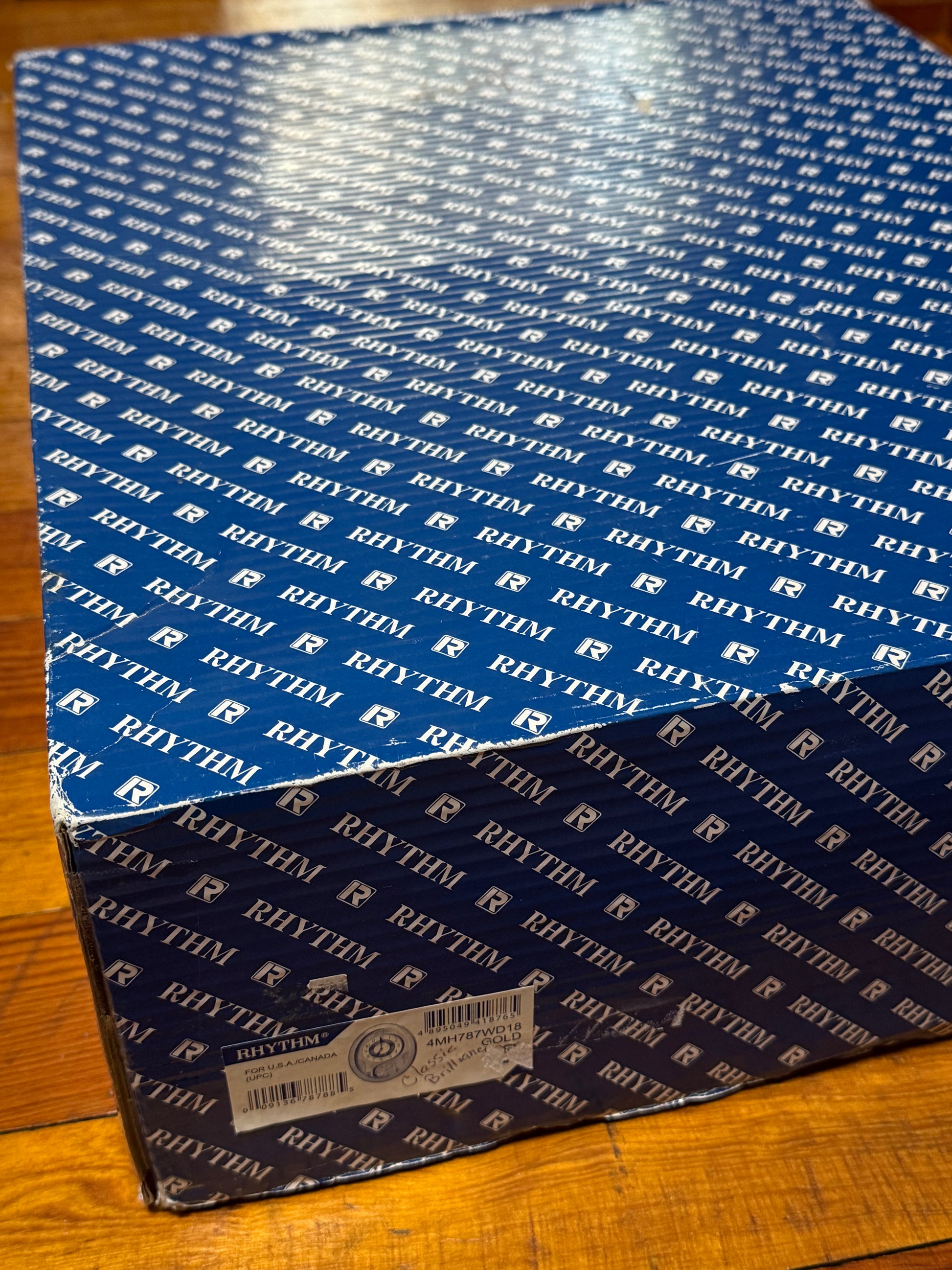 Notes: This piece is in excellent condition with minimal imperfections. There are some small scuffs around the case (as shown in the photos), but they aren't noticeable unless pointed out. After taking our initial photos, I discovered the clock’s original stickers inside of the original box with its paperwork (as shown in the last few images). The clock works, moves, and sounds just like new! It will be shipped double boxed inside of the original box.