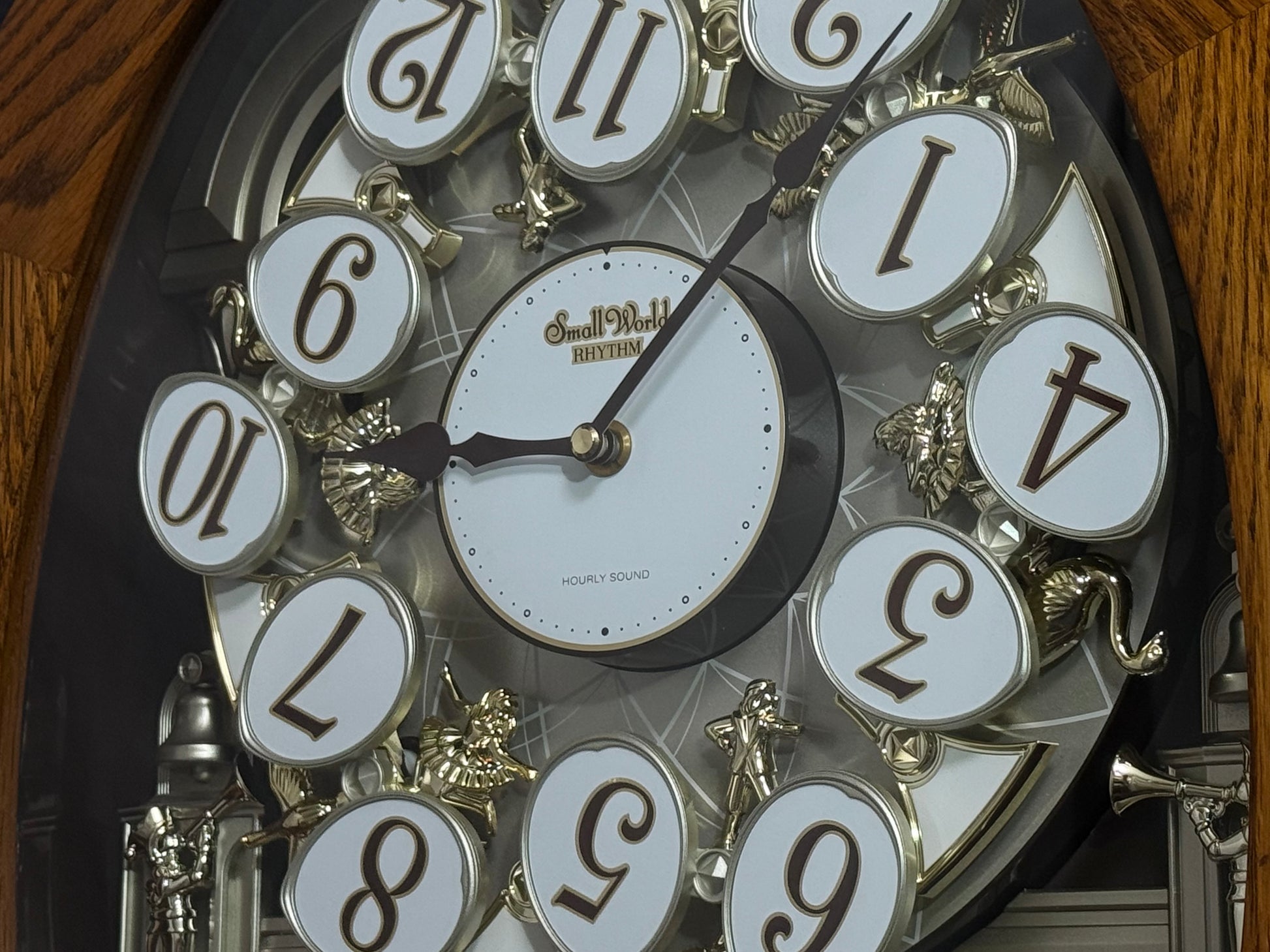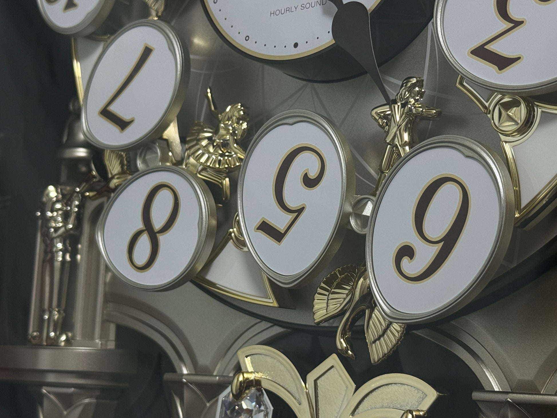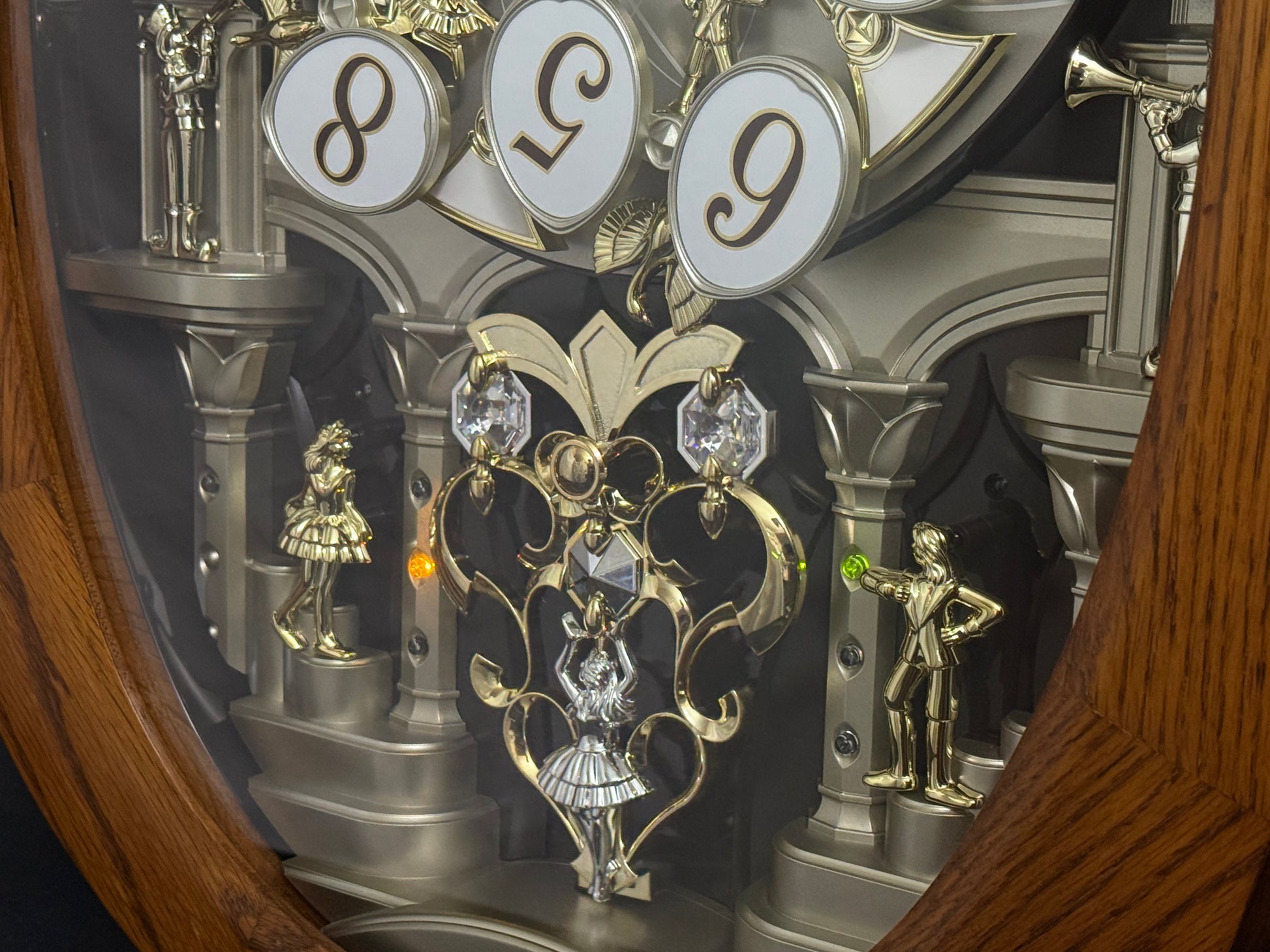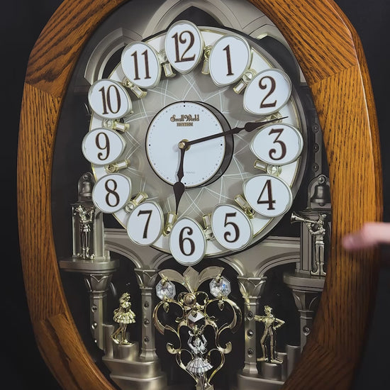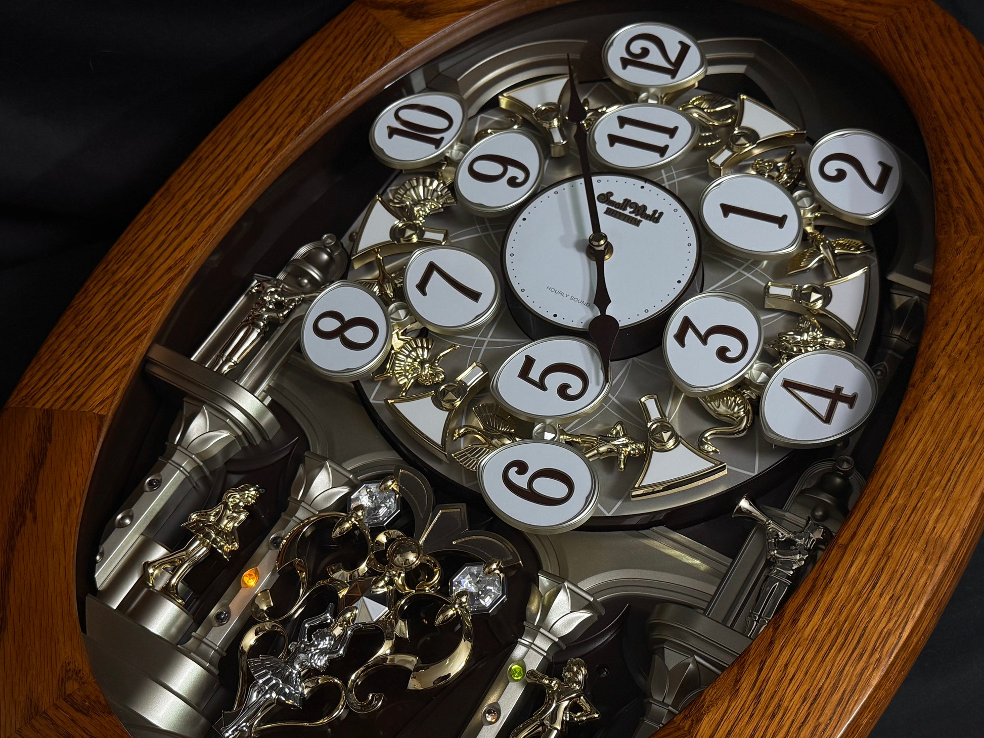 This Rhythm Magic Motion clock will truly leave you wanting an encore. The “SSS Encore” is a true masterpiece, and it is considered to be one of the most iconic timepieces ever produced by Rhythm. It is adored by both music lovers and clocks enthusiasts around the world, with some collectors even claiming that the “SSS Encore” is their favorite piece in their entire collection. It was released in 2007 and was the founding member of the signature “Encore” series, which features a distinct dial shape and motion. As the hour approaches, the clock’s numbers come to life and rotate in pairs, revealing elegant figurines beneath. They rotate towards the center of the clock as the lights flash along to one of the 18 magnificent melodies. What makes this model so special is the superior sound of the music. “Super Symphonic Sound” (SSS) truly brings the symphony to your home as it is Rhythm’s most realistic sound featuring brass and string instruments, vibrant synthesizers, and even percussion. Models with SSS are very hard-to-find as they were only produced for about 3 years. They had to be quickly discontinued after Rhythm’s famous copyright dispute in 2008. With its medium oak wood frame, the “SSS Encore” is sure to be an eye-catching addition to your decor.
