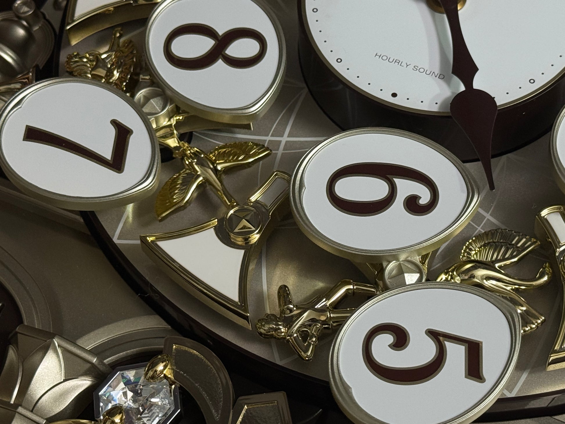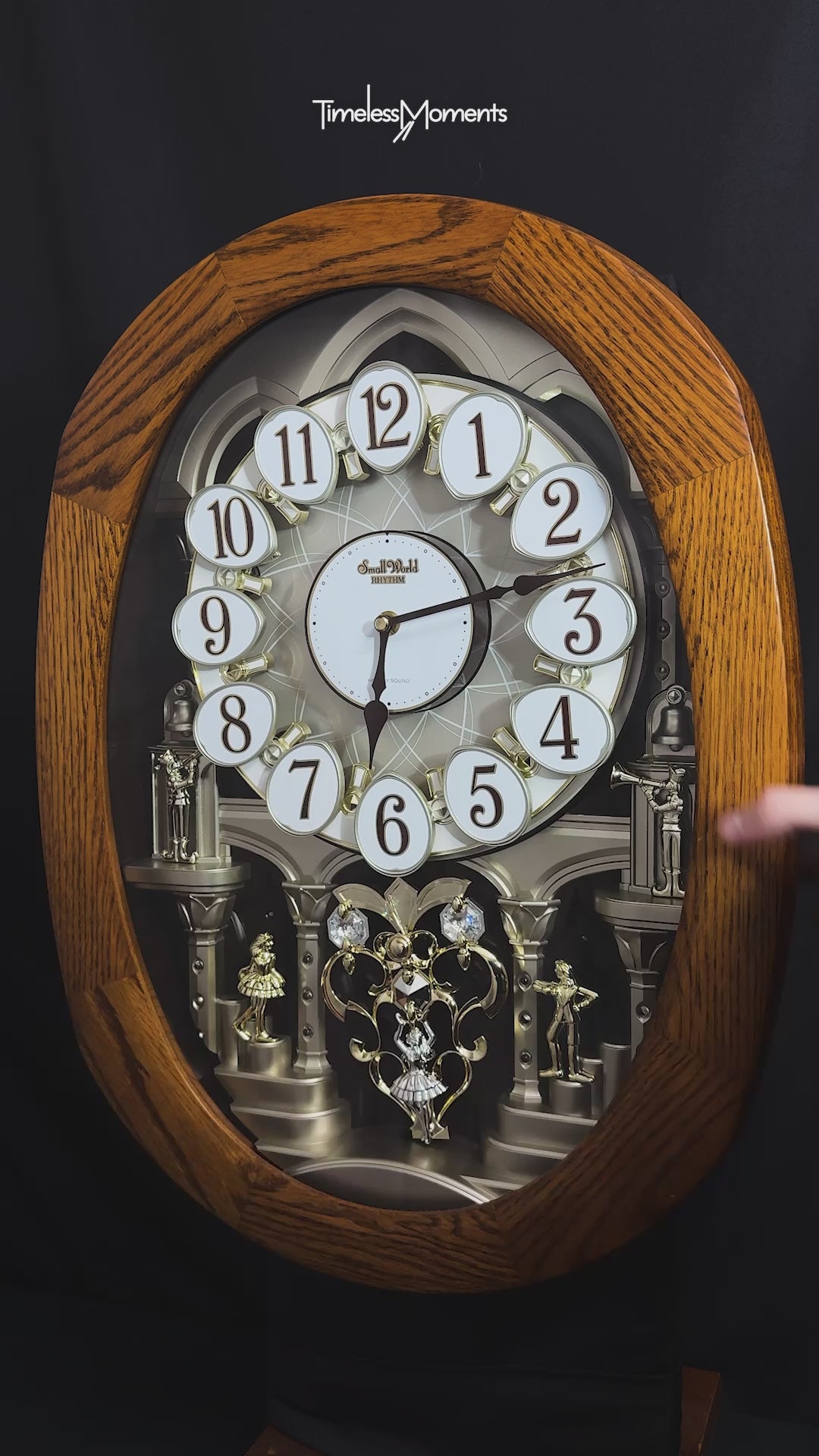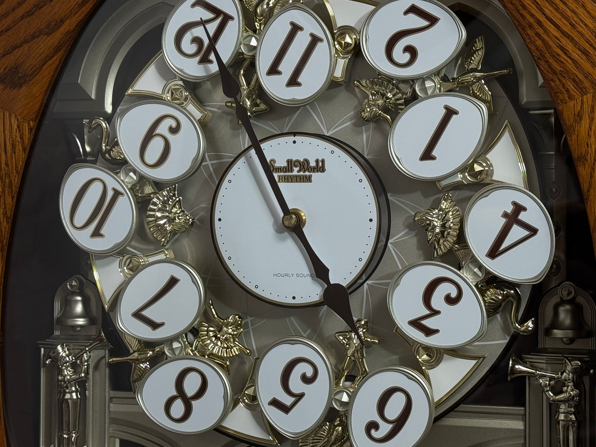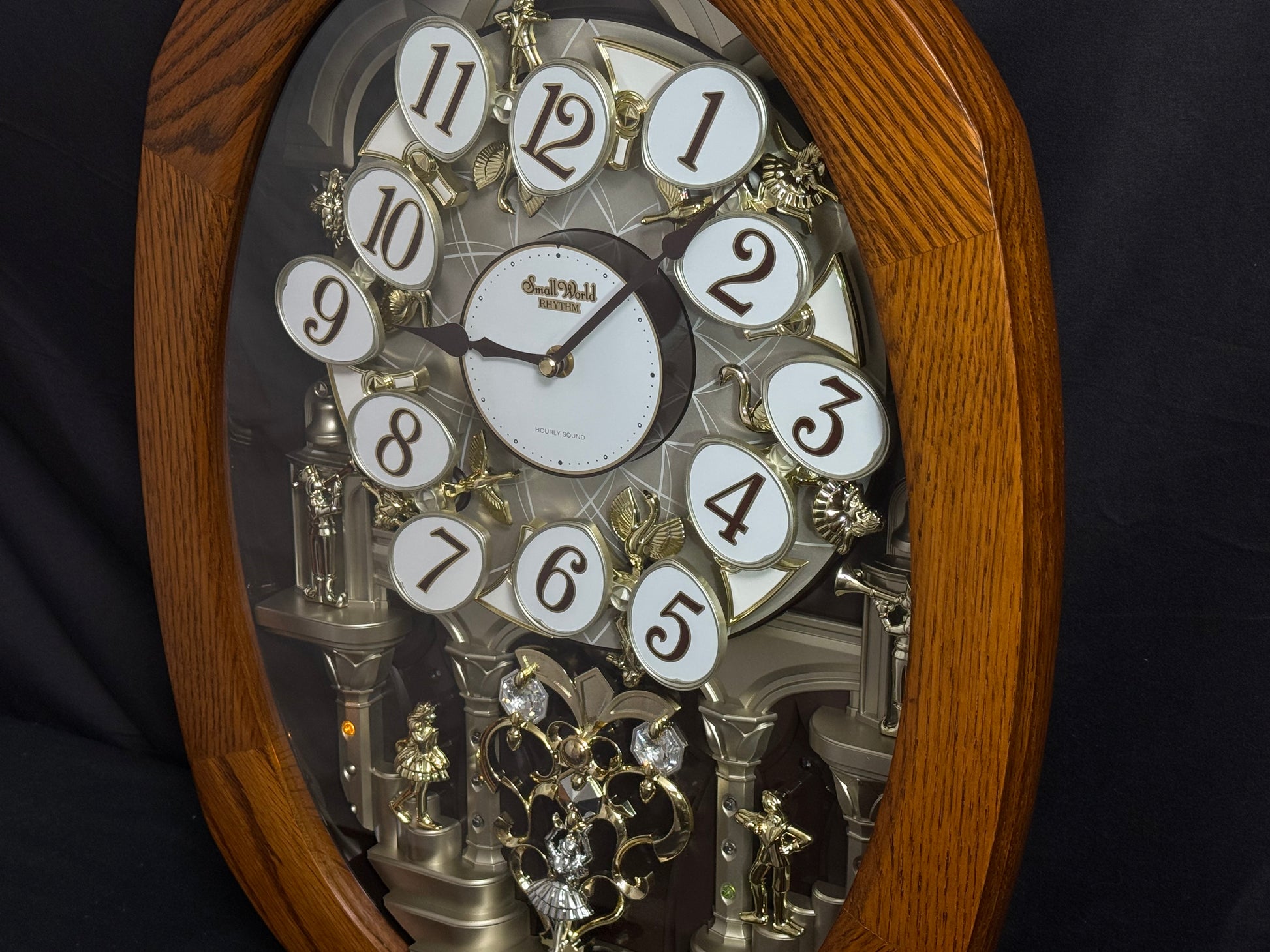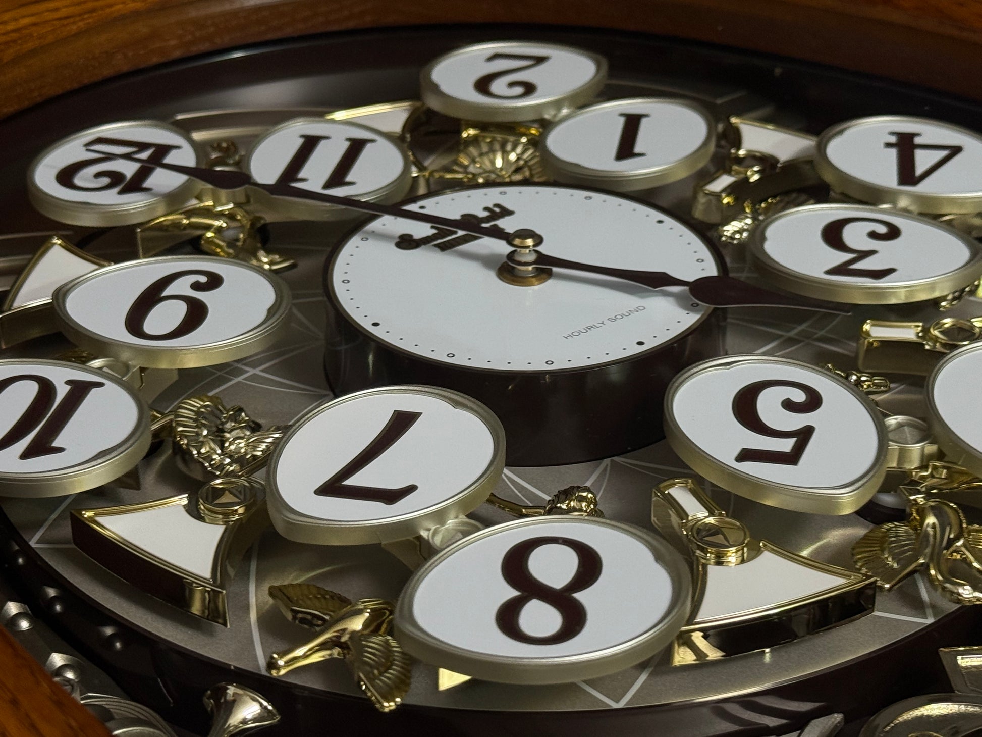 This Rhythm Magic Motion clock will truly leave you wanting an encore. The “SSS Encore” is a true masterpiece, and it is considered to be one of the most iconic timepieces ever produced by Rhythm. It is adored by both music lovers and clocks enthusiasts around the world, with some collectors even claiming that the “SSS Encore” is their favorite piece in their entire collection. It was released in 2007 and was the founding member of the signature “Encore” series, which features a distinct dial shape and motion. As the hour approaches, the clock’s numbers come to life and rotate in pairs, revealing elegant figurines beneath. They rotate towards the center of the clock as the lights flash along to one of the 18 magnificent melodies. What makes this model so special is the superior sound of the music. “Super Symphonic Sound” (SSS) truly brings the symphony to your home as it is Rhythm’s most realistic sound featuring brass and string instruments, vibrant synthesizers, and even percussion. Models with SSS are very hard-to-find as they were only produced for about 3 years. They had to be quickly discontinued after Rhythm’s famous copyright dispute in 2008. With its medium oak wood frame, the “SSS Encore” is sure to be an eye-catching addition to your decor.