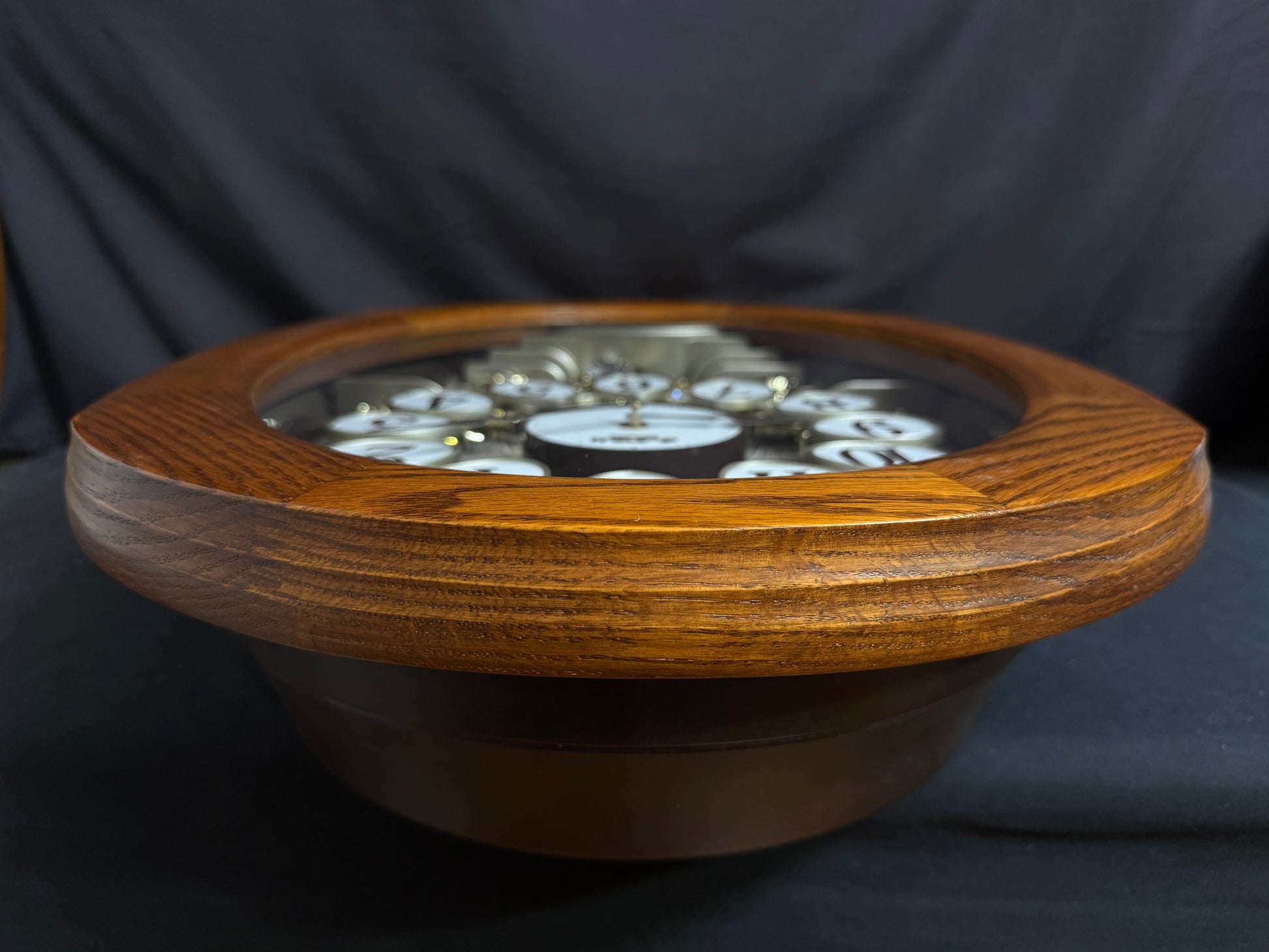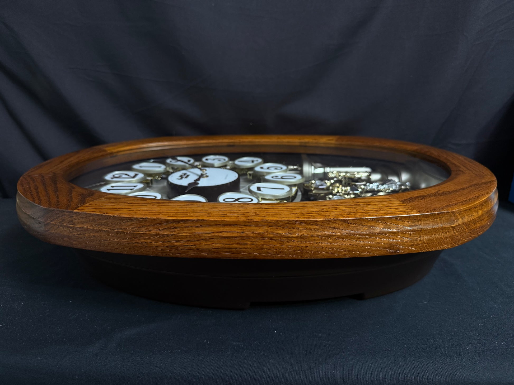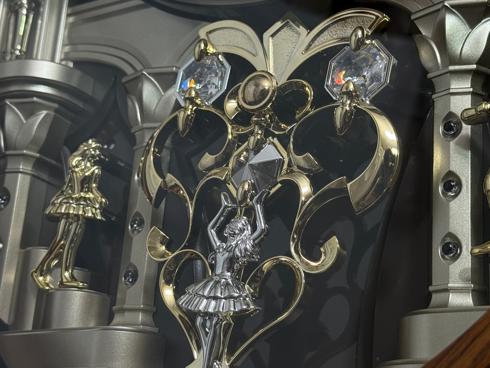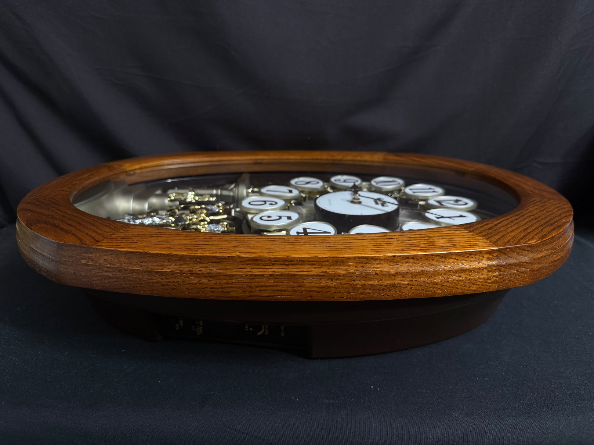 This Rhythm Magic Motion clock will truly leave you wanting an encore. The “SSS Encore” is a true masterpiece, and it is considered to be one of the most iconic timepieces ever produced by Rhythm. It is adored by both music lovers and clocks enthusiasts around the world, with some collectors even claiming that the “SSS Encore” is their favorite piece in their entire collection. It was released in 2007 and was the founding member of the signature “Encore” series, which features a distinct dial shape and motion. As the hour approaches, the clock’s numbers come to life and rotate in pairs, revealing elegant figurines beneath. They rotate towards the center of the clock as the lights flash along to one of the 18 magnificent melodies. What makes this model so special is the superior sound of the music. “Super Symphonic Sound” (SSS) truly brings the symphony to your home as it is Rhythm’s most realistic sound featuring brass and string instruments, vibrant synthesizers, and even percussion. Models with SSS are very hard-to-find as they were only produced for about 3 years. They had to be quickly discontinued after Rhythm’s famous copyright dispute in 2008. With its medium oak wood frame, the “SSS Encore” is sure to be an eye-catching addition to your decor.