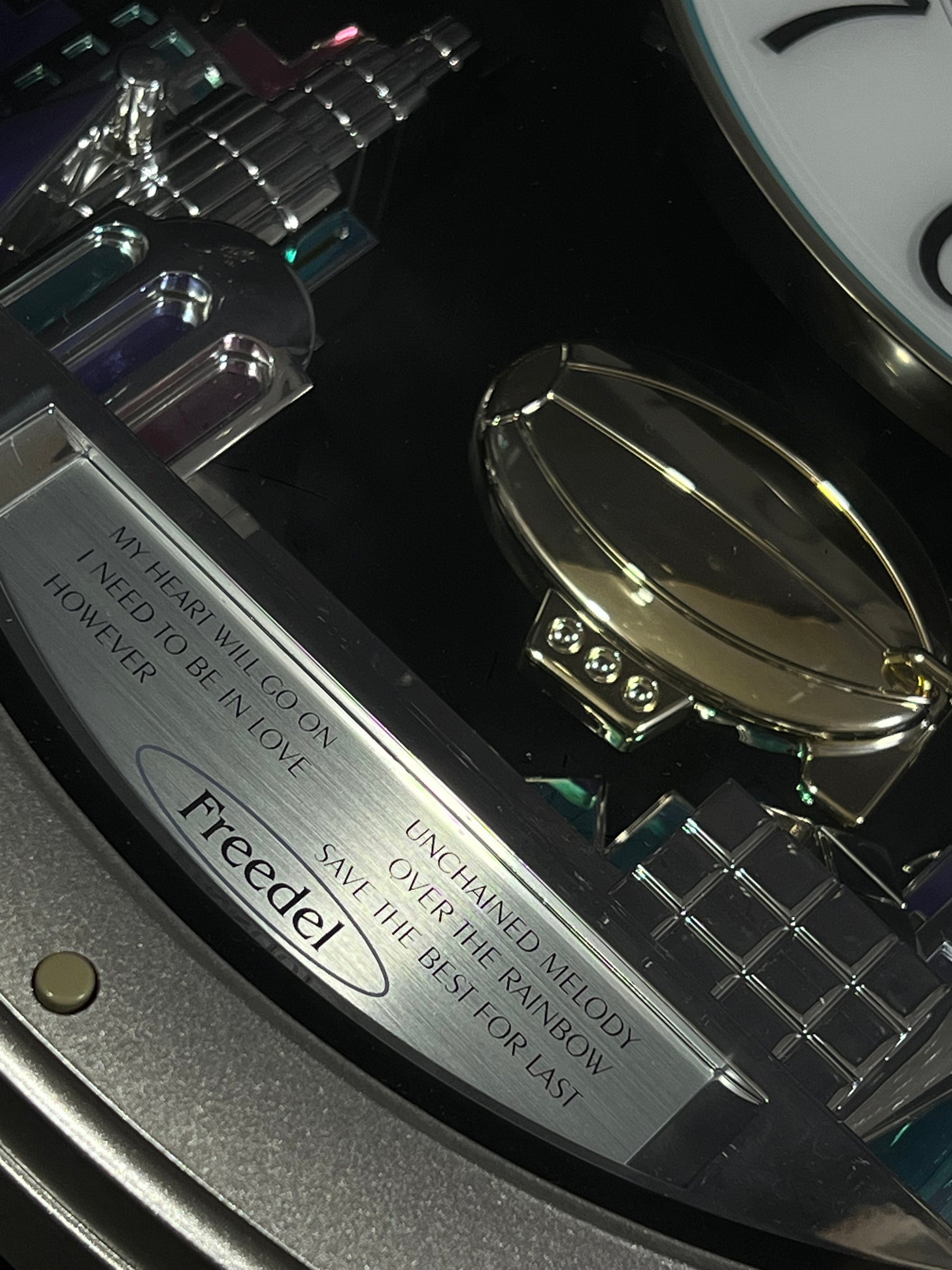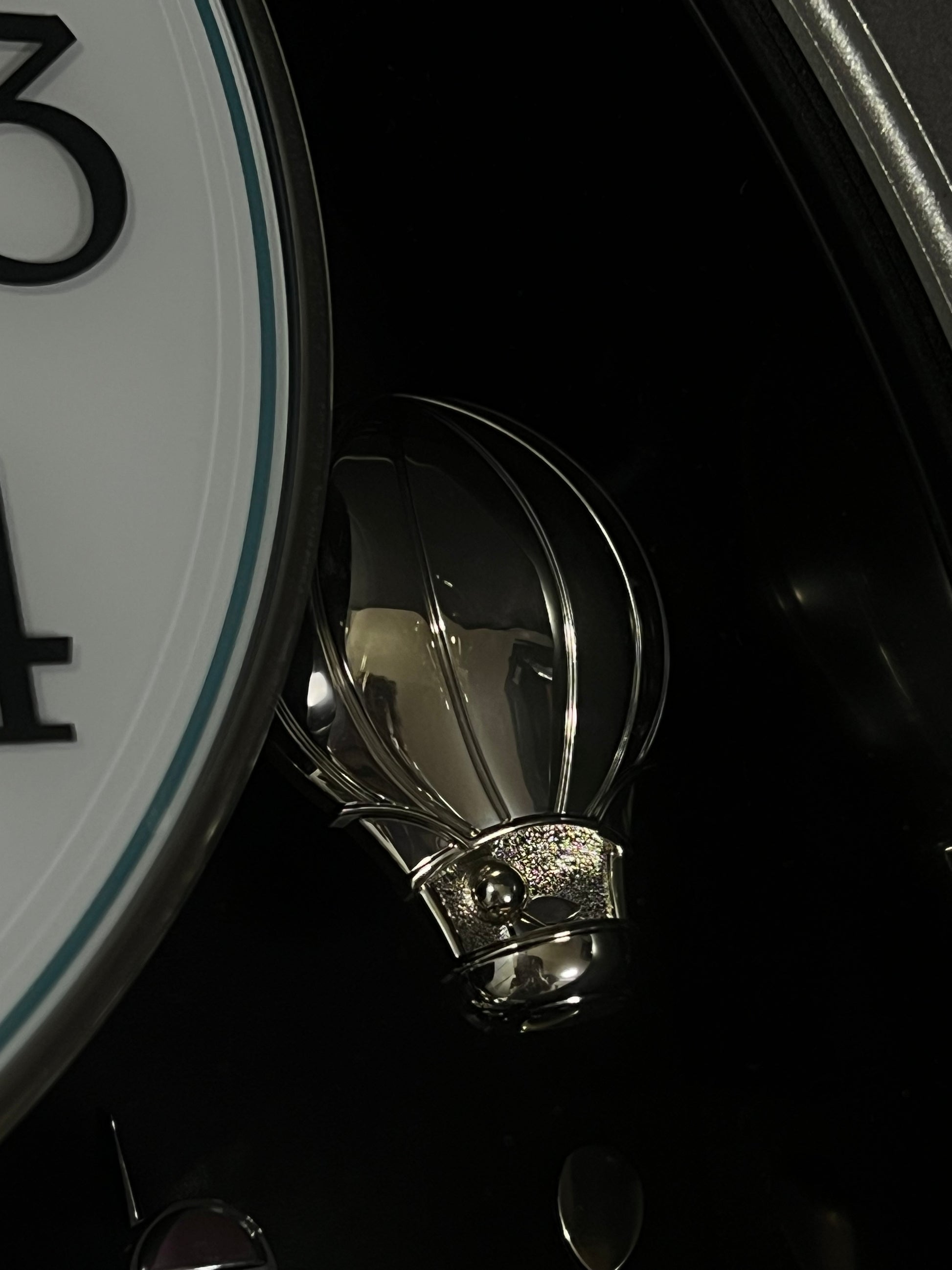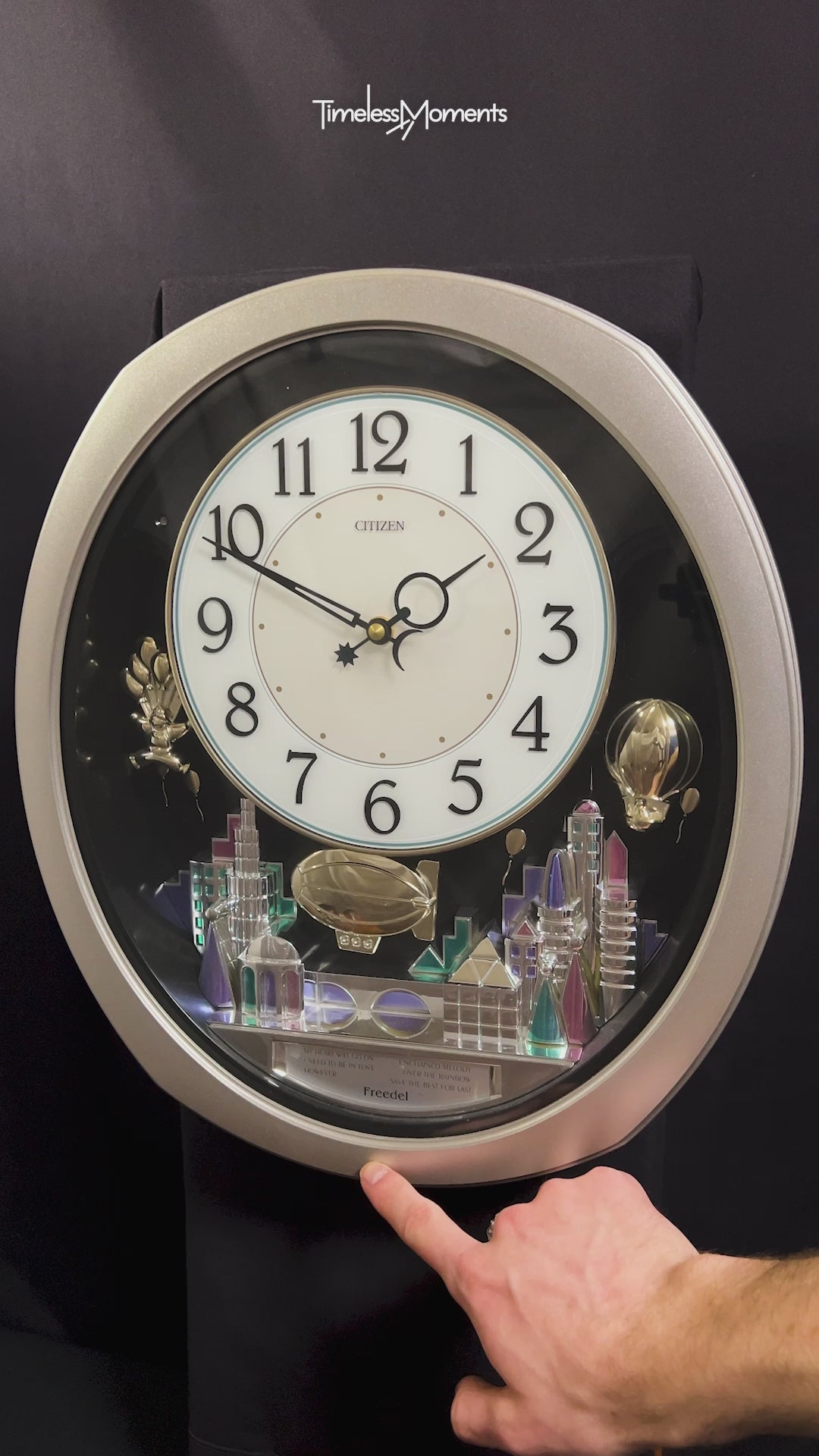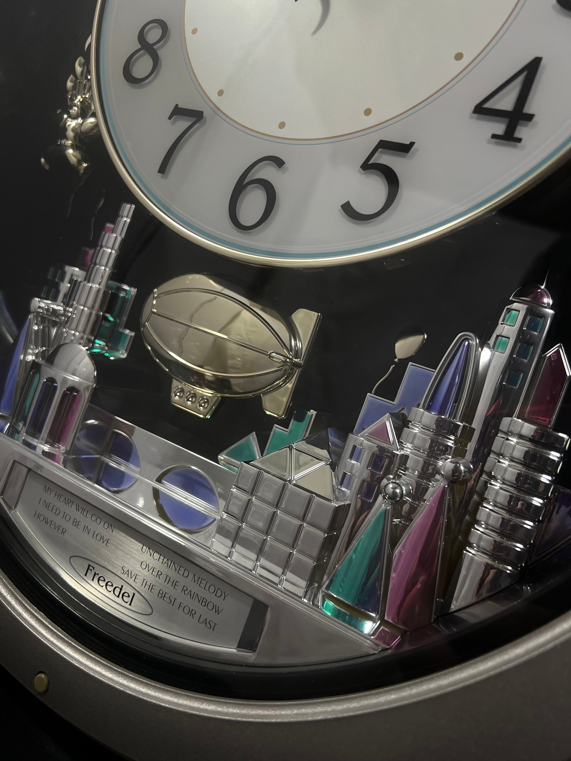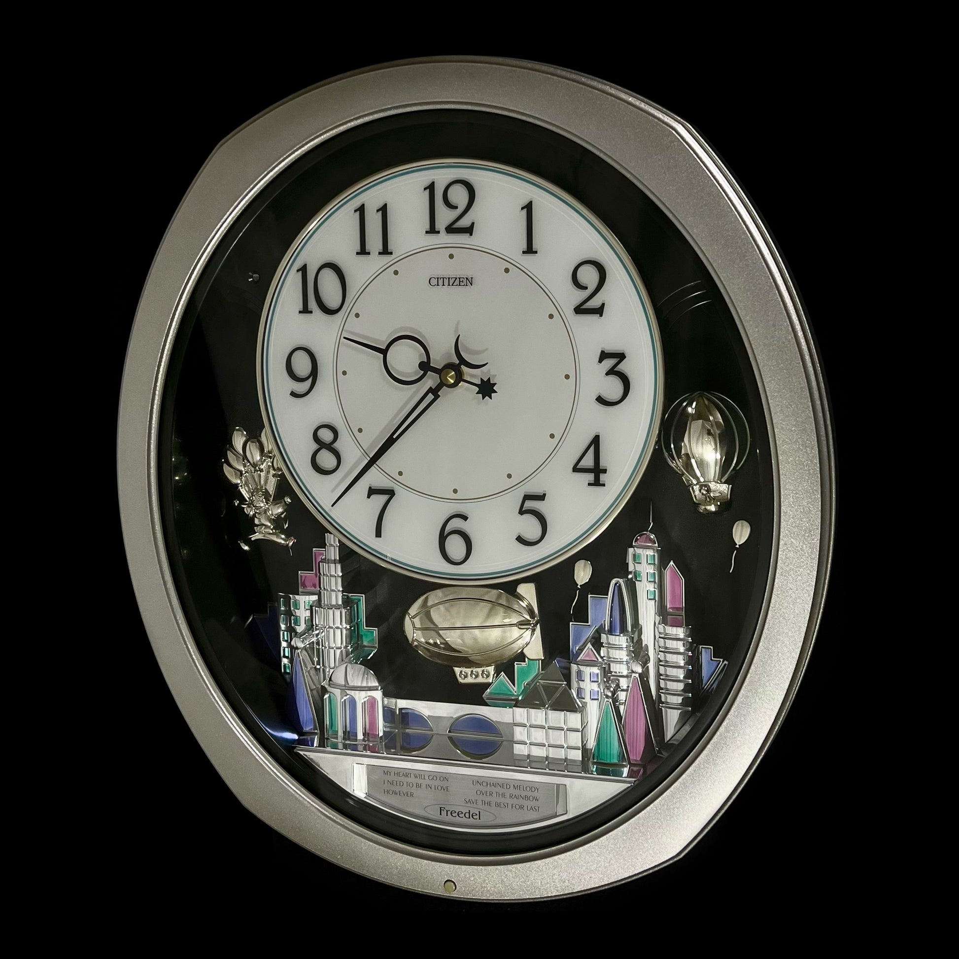 This is a collectible Citizen musical clock from Japan produced by Rhythm. The translation of the actual Japanese model name in English is “Freedel 763”. A similar Rhythm clock called “Joyful Land” exists today, but it does not feature Rhythm’s smooth Dynamic Wave Sound and the popular melodies (like “Unchained Melody”) that this clock plays. It also features a silver, 3-piece decorative pendulum that swings back and forth continuously.