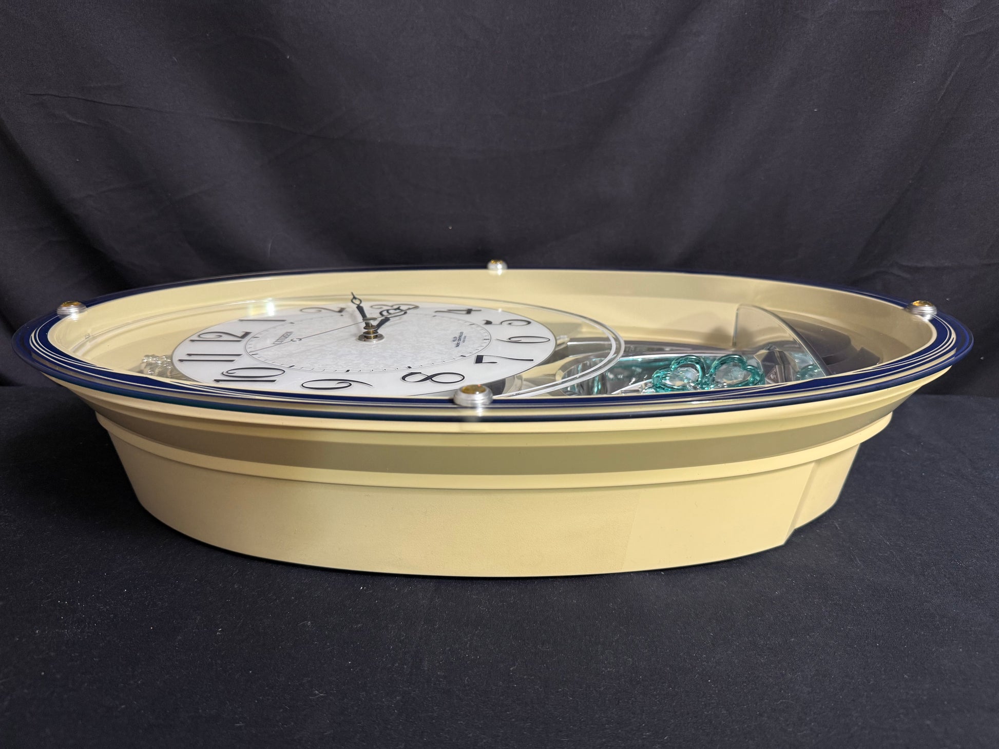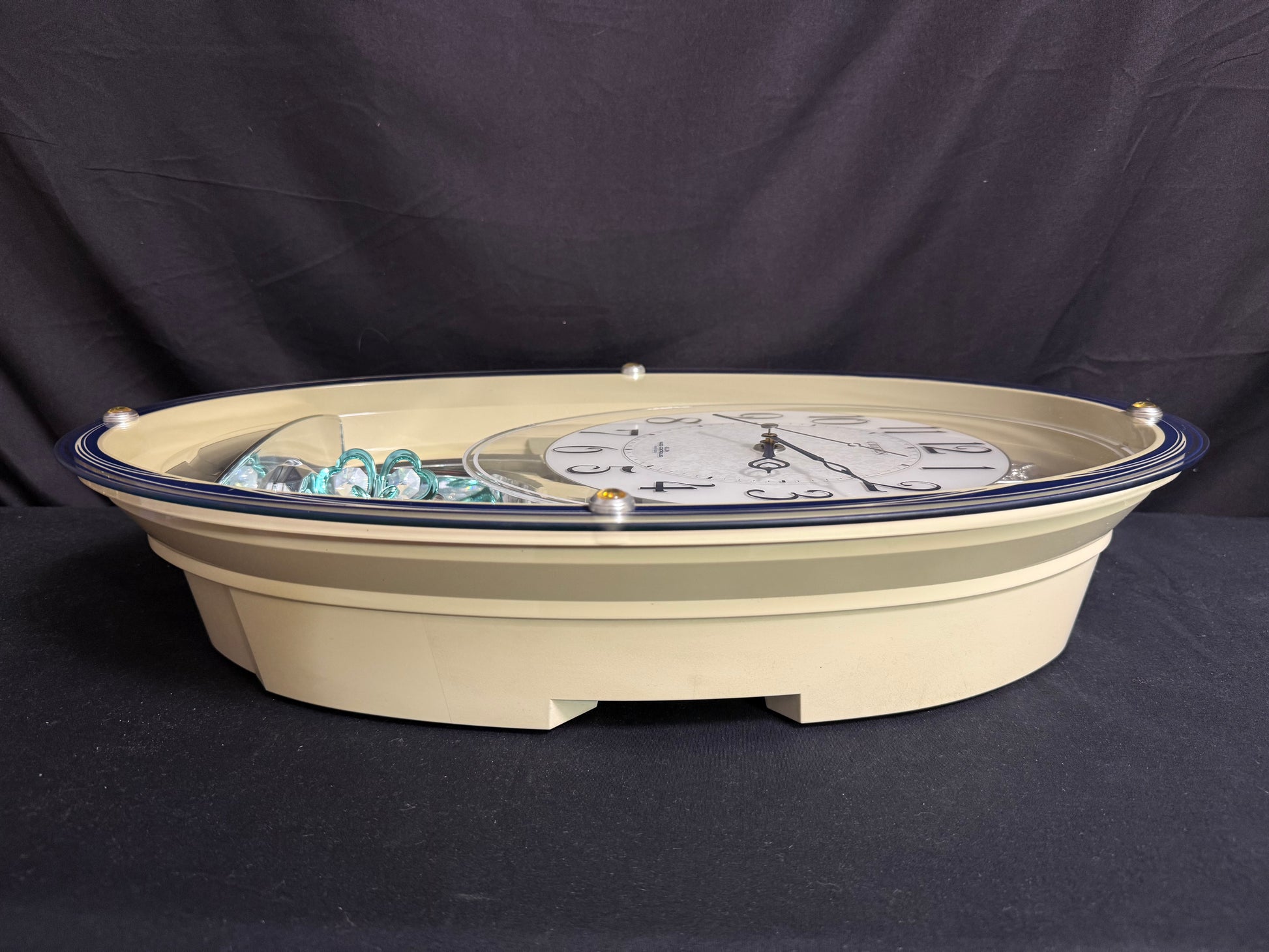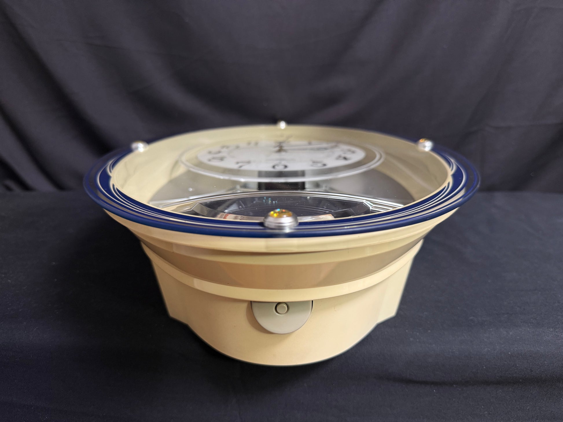 Notes: This is such a stunning piece, and it's nearly impossible to find here in the USA. There are a few small marks on the blue lineage underneath the dial, as pointed out in the photos. The left side of the clock's beige case is slightly faded from hanging in direct sunlight, so it is a bit darker than the right side. It isn't super noticeable once the clock is hung on the wall, but please look at the photos to compare the difference. Aside from that, this clock is in great used condition and still works like a charm. Watch the video for a demonstration!