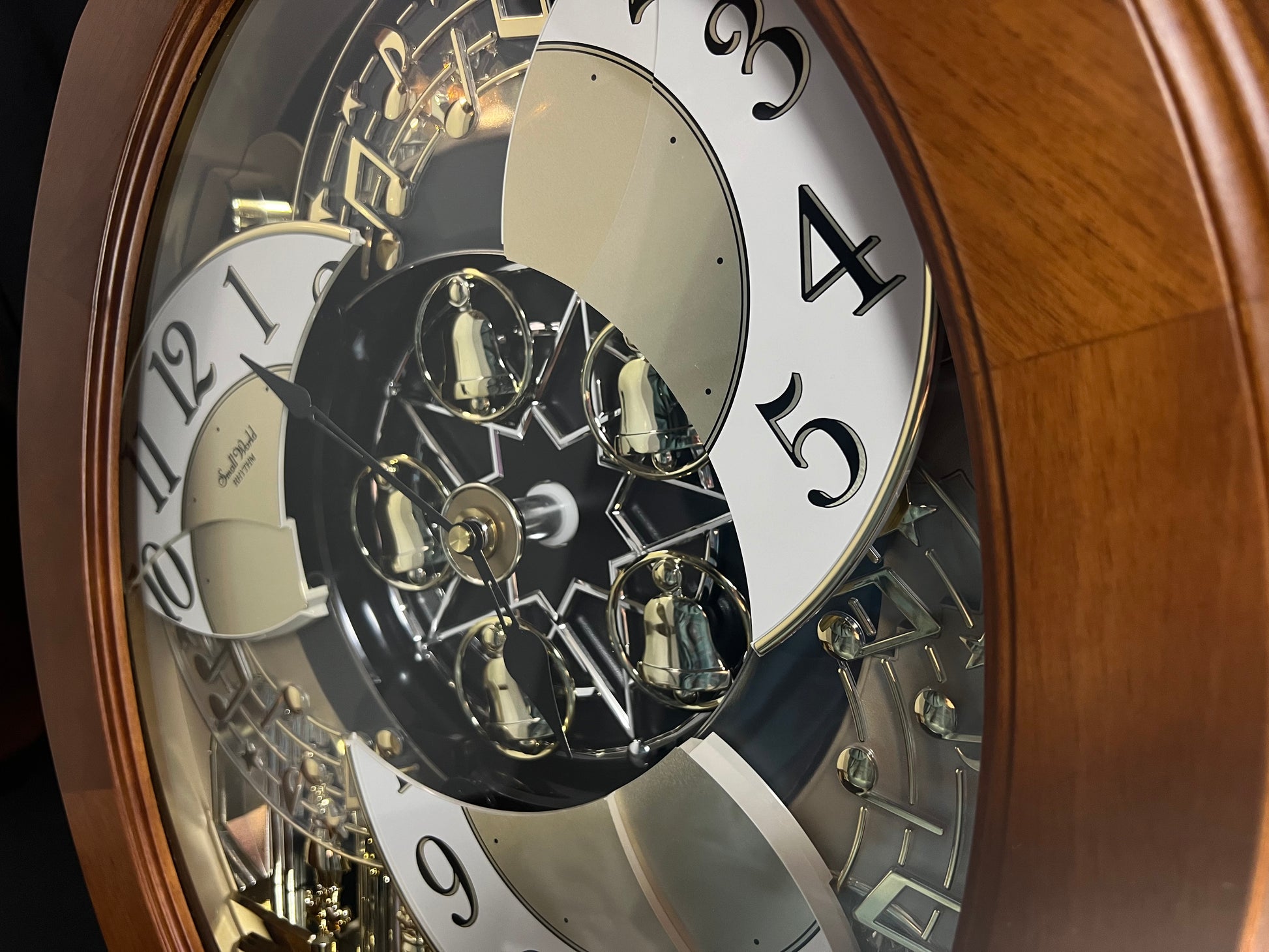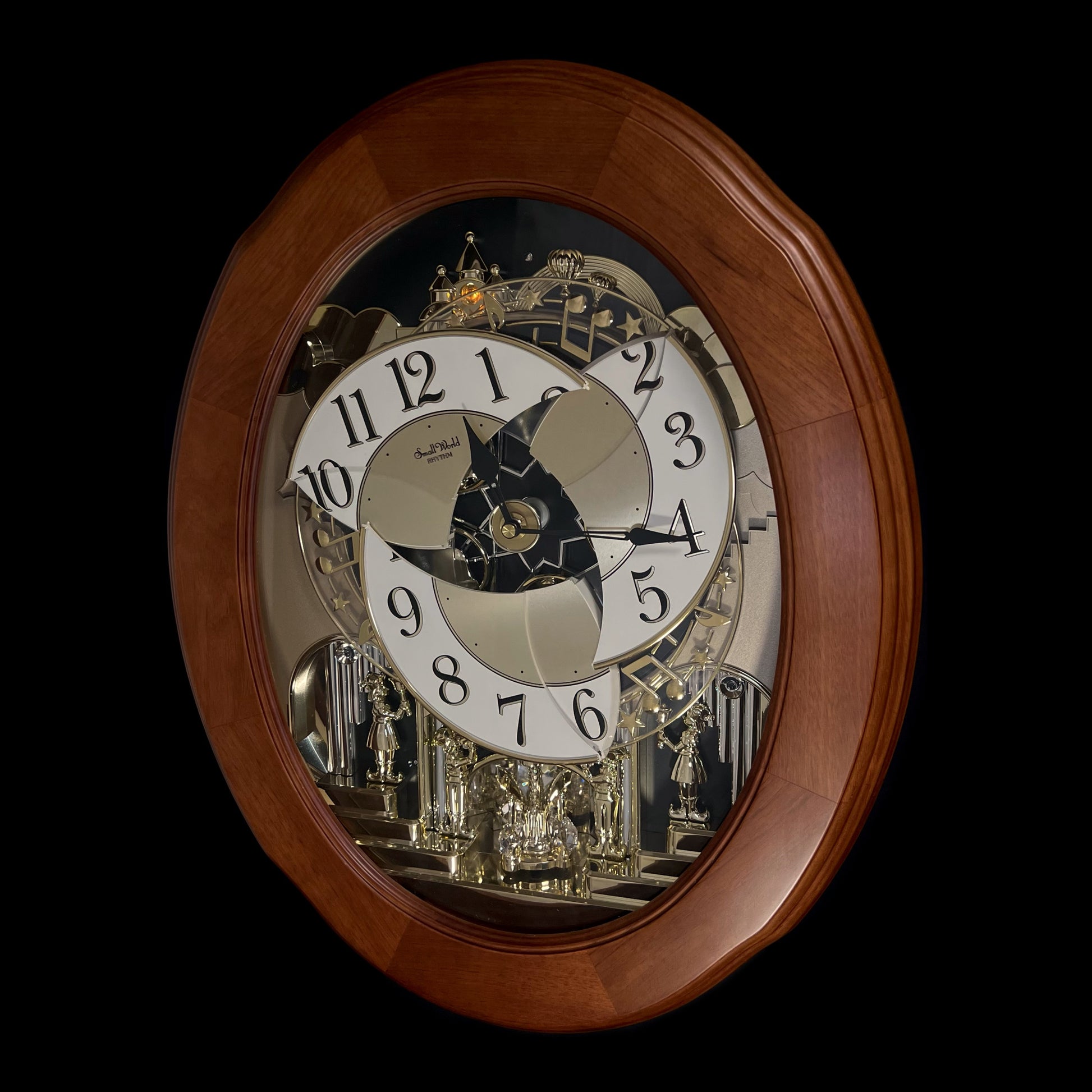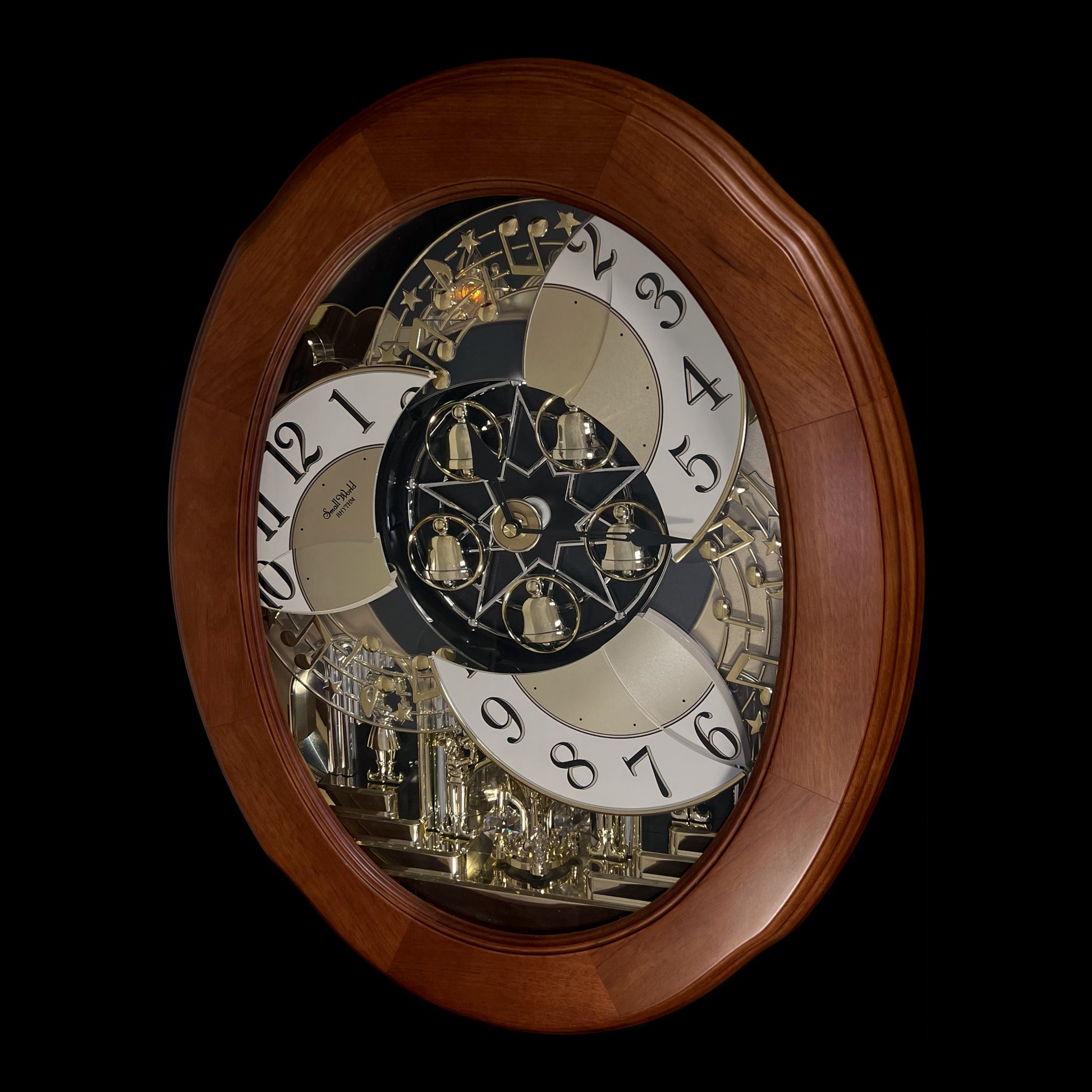 “Nostalgia Legend” was the follow-up to one of Rhythm’s most popular and best-selling Magic Motion clocks of all time: the “CTS Nostalgia.” This version was released in 2009 following their famous lawsuit with Paul Simon from Simon & Garfunkel. This version was quite a step up from the original since it featured double the melodies, bringing the total count to 18, with 6 being hits from one of the most legendary bands of all time: The Beatles. At the top of the hour or when the demonstration button is pressed, the golden dial comes to life and splits into three pieces, revealing rotating bells as various hits such as “Yesterday” and “Hey Jude” play in Rhythm’s signature CTS (Clarion Tone System) sound. Encased in a thick walnut frame, the “Nostalgia Legend” will bring harmony to your home.