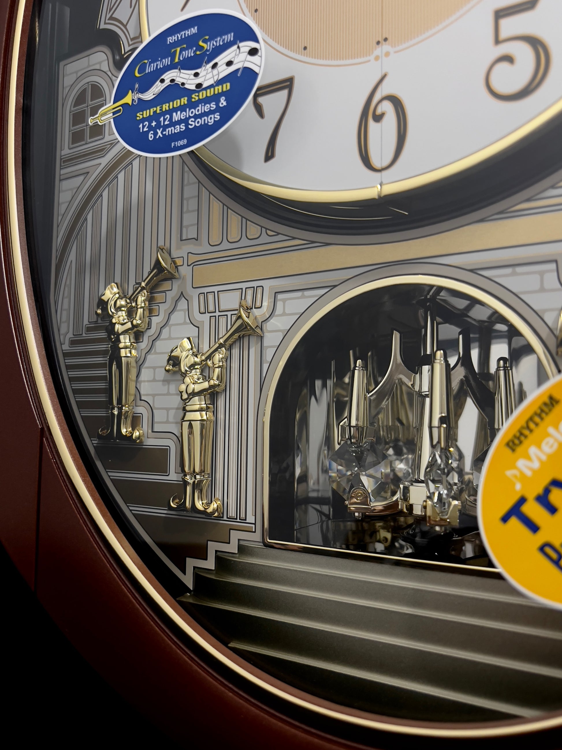 Come one, come all to this royal “Palacio.” This is one of the newest members of Rhythm’s world-renowned “Timecracker” series of Magic Motion clocks. At the top of the hour or when the demonstration button is pressed, the stunning golden dial splits into two pieces to introduce a splendid show of joyfulness with rotating figurines beneath. As the dial pieces rotate, the figurines accompany them. The elegance of this design is complimented with a continuously-rotating crystal pendulum, and the clock is wrapped in a metallic brown case.