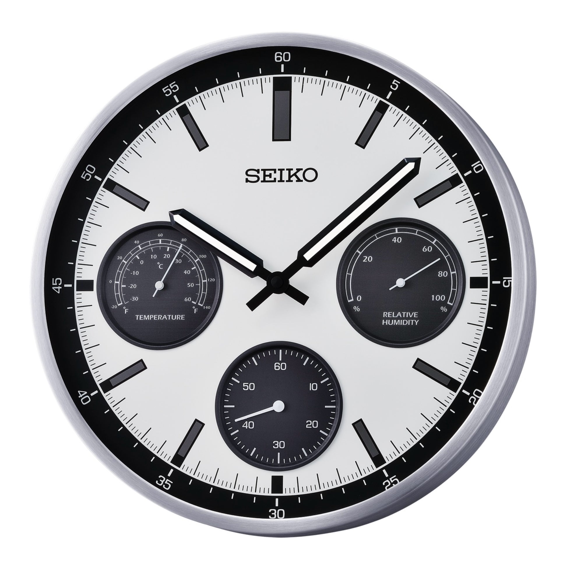 Seiko QXA823SLH "Silver Shelby Watch Dial" Luminous Metal Wall Clock with Thermometer, Hygrometer, & Seconds Dial