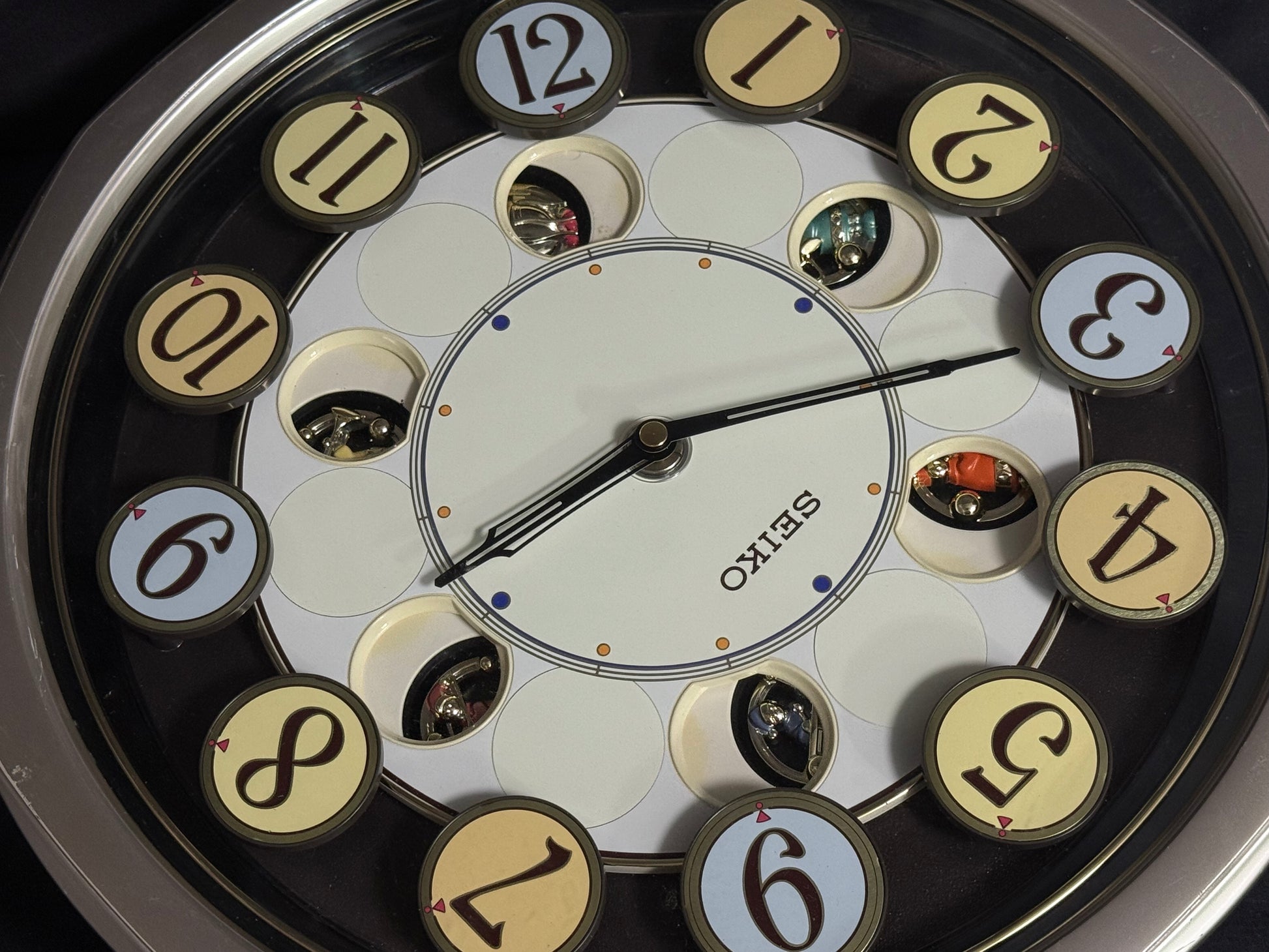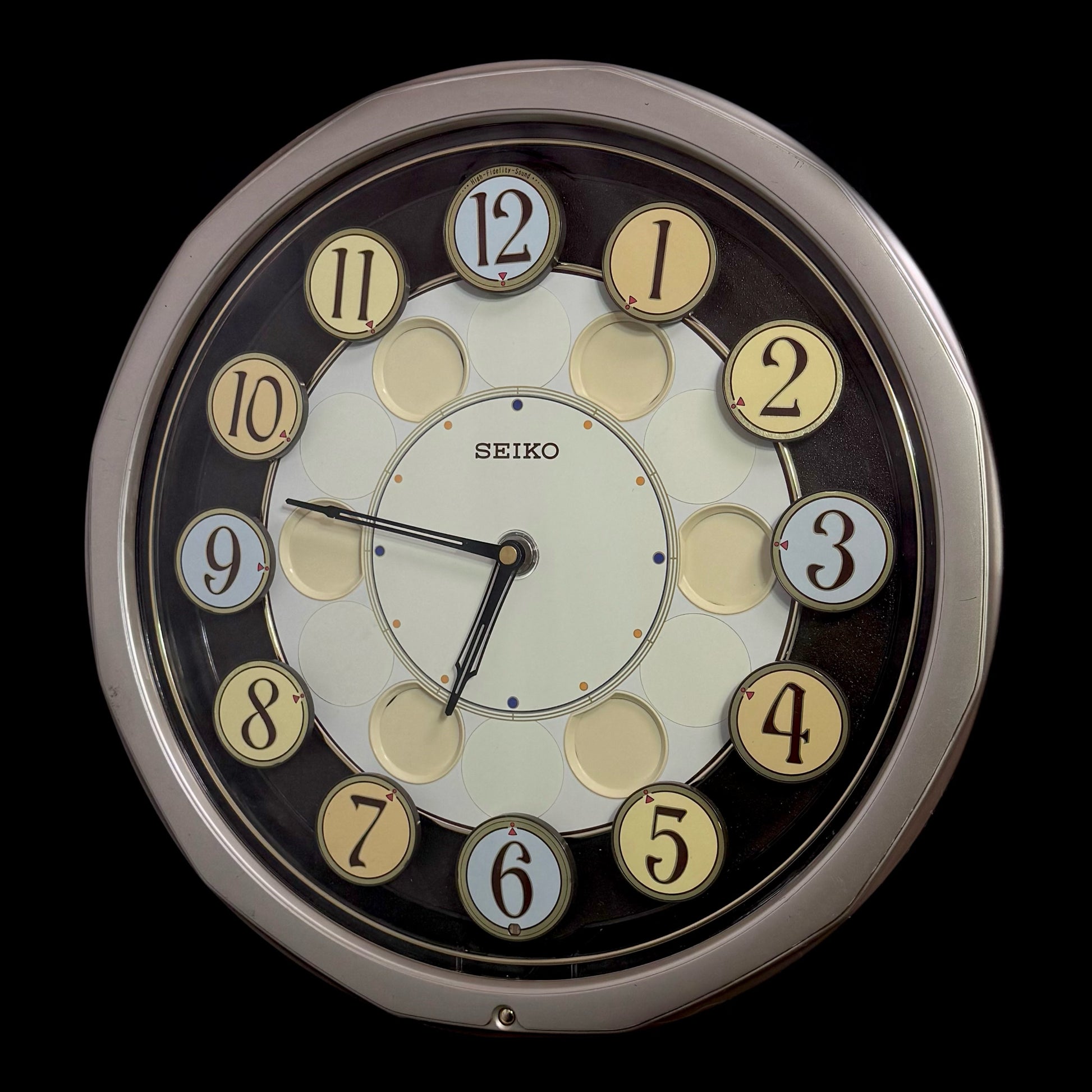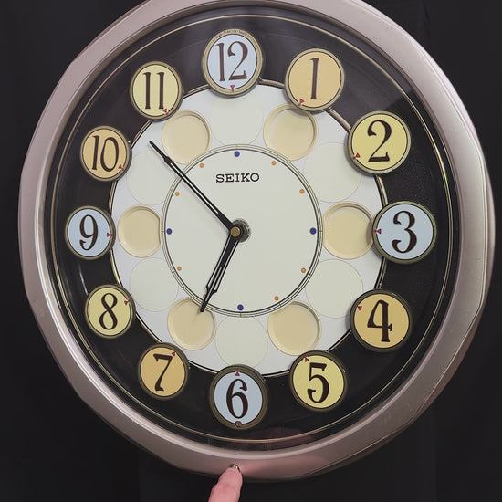 Come play and dance along with the QXM106SRH musical wall clock by Seiko. Nicknamed the “Twirling Numbers”, this model is one of the rarest and hardest-to-find Melodies in Motion clocks. Over the years, the QXM106SRH has become an all-time favorite among collectors and enthusiasts due to its fun-natured design and high-quality melodies. Over in Japan, this model was known as the RE546S and was a member of Seiko's top-of-the-line and widely-popular “Fantasia” series of Karakuri clocks. At the top of the hour or when the demonstration button is pressed, the colorful numbers begin to "twirl” along with the rotating center dial. As the center dial rotates, it reveals a plethora of hidden amusing figurines beneath. The QXM106SRH plays a total of six well-known melodies in Seiko’s stunning Hi-Fi sound, created with a variety of playful synthesizers. This clock was the only model to be sold outside of Japan with this exact melody list, making it that much more unique.
