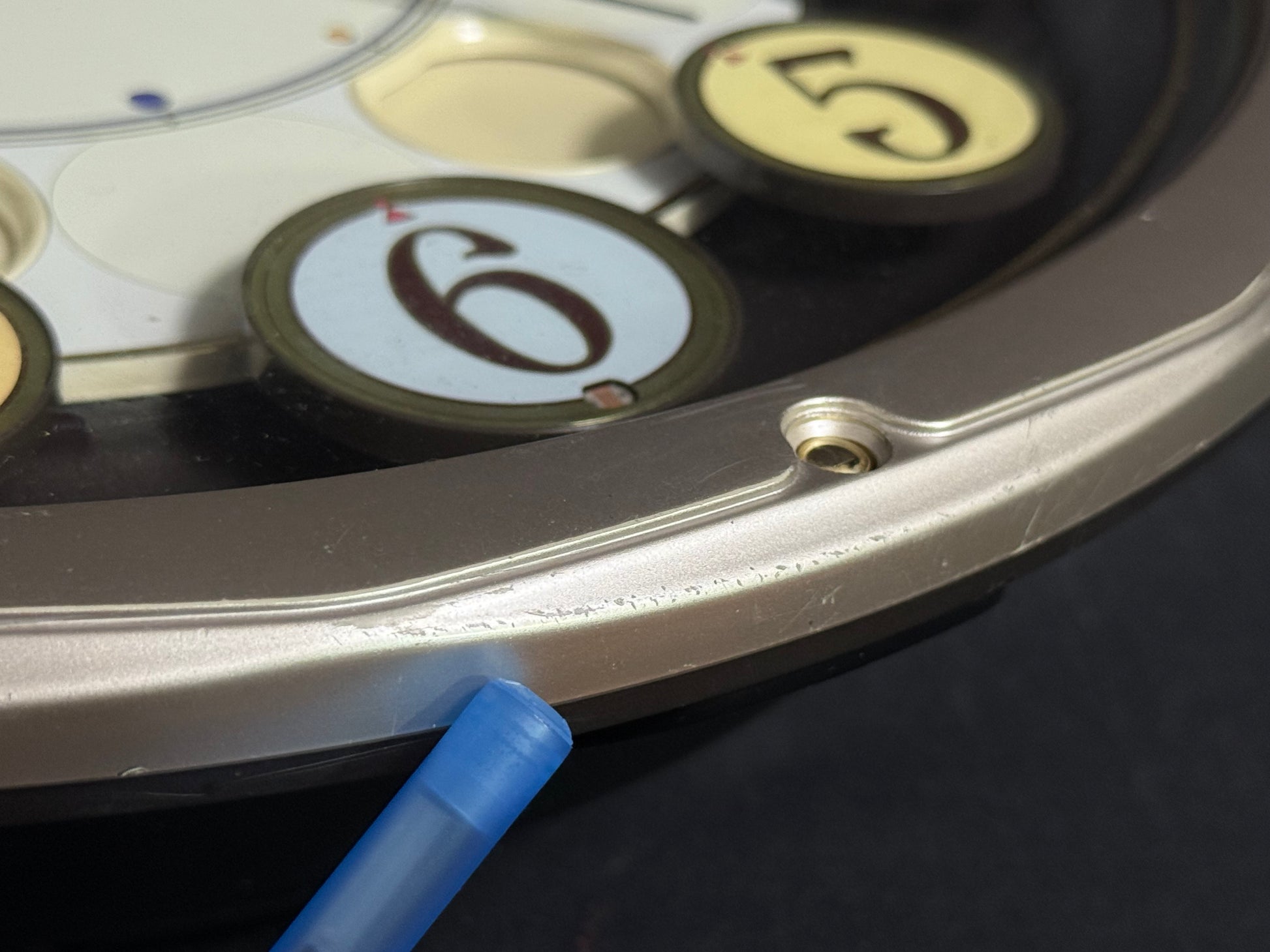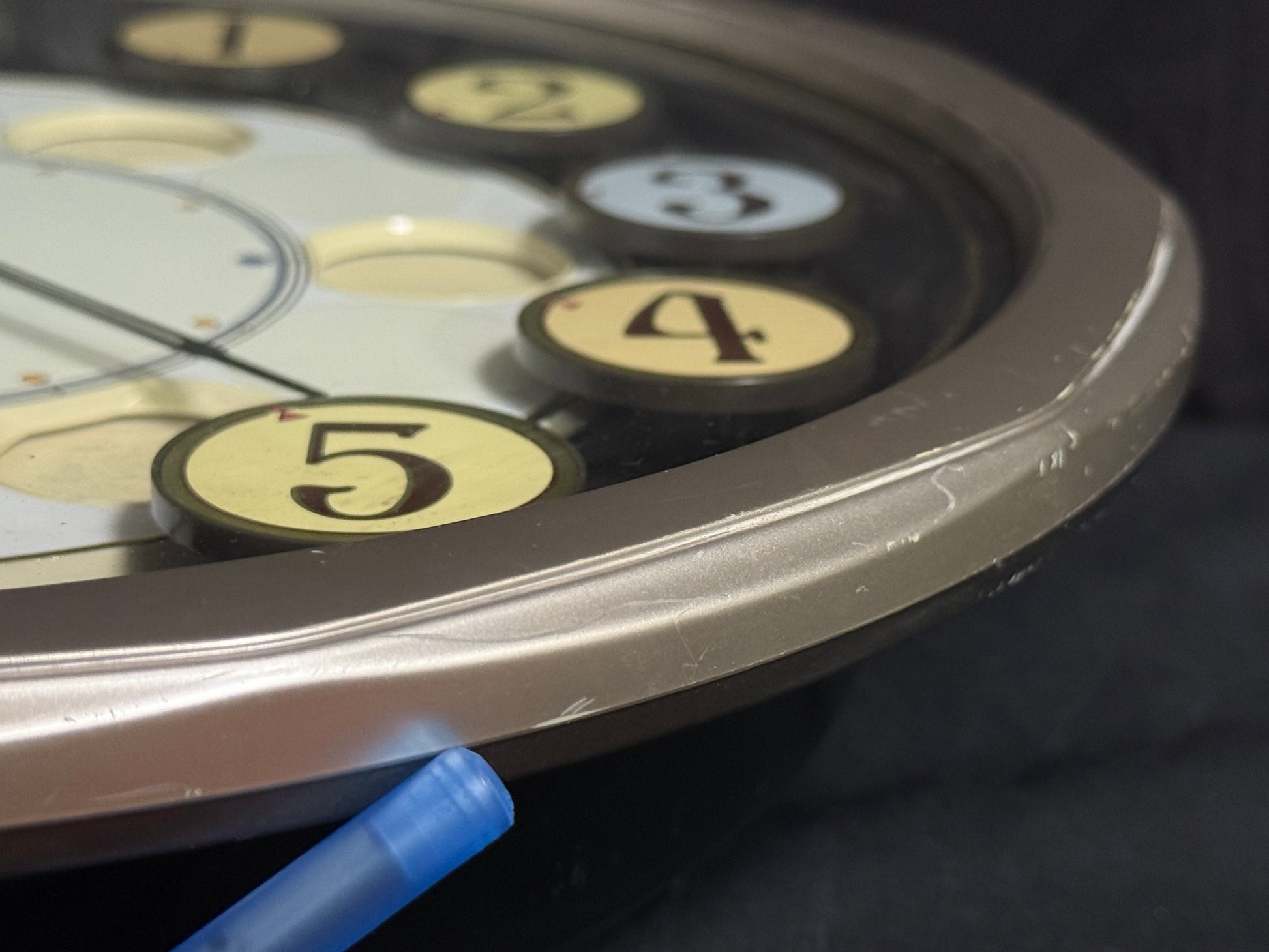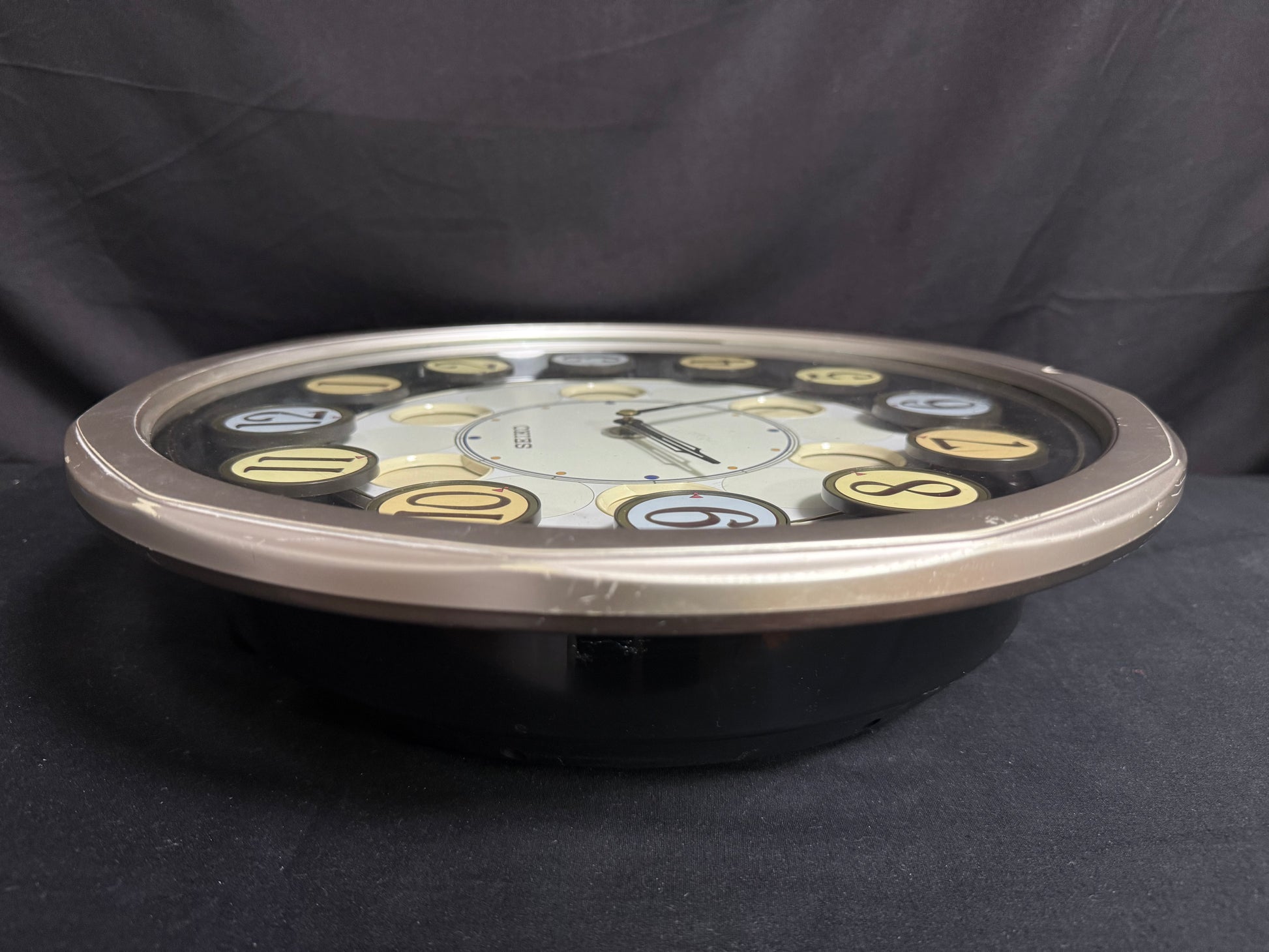 Come play and dance along with the QXM106SRH musical wall clock by Seiko. Nicknamed the “Twirling Numbers”, this model is one of the rarest and hardest-to-find Melodies in Motion clocks. Over the years, the QXM106SRH has become an all-time favorite among collectors and enthusiasts due to its fun-natured design and high-quality melodies. Over in Japan, this model was known as the RE546S and was a member of Seiko's top-of-the-line and widely-popular “Fantasia” series of Karakuri clocks. At the top of the hour or when the demonstration button is pressed, the colorful numbers begin to "twirl” along with the rotating center dial. As the center dial rotates, it reveals a plethora of hidden amusing figurines beneath. The QXM106SRH plays a total of six well-known melodies in Seiko’s stunning Hi-Fi sound, created with a variety of playful synthesizers. This clock was the only model to be sold outside of Japan with this exact melody list, making it that much more unique.