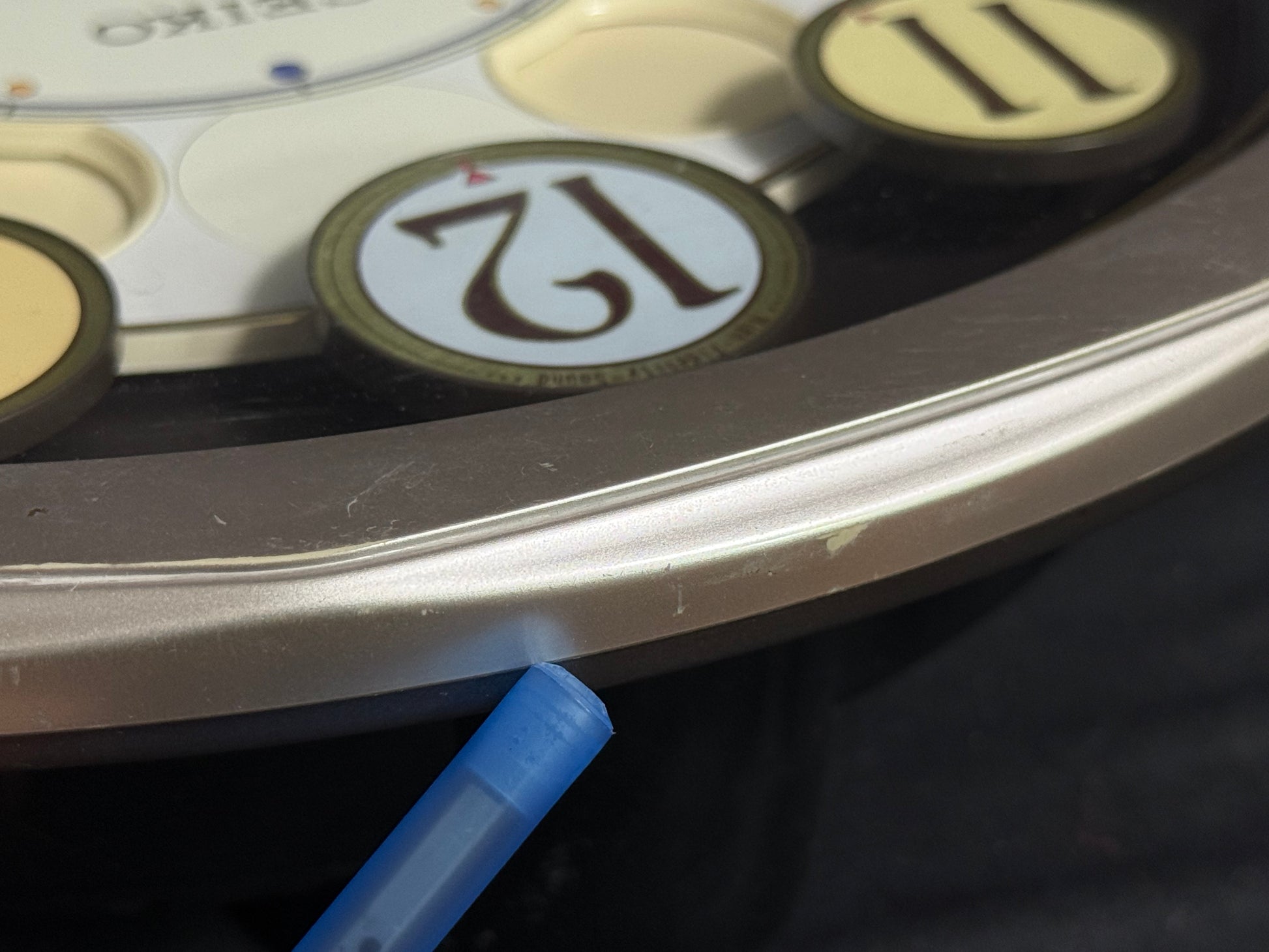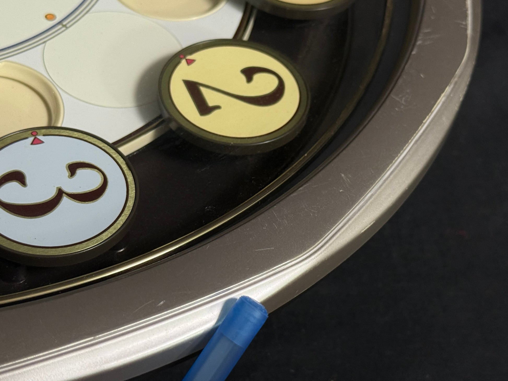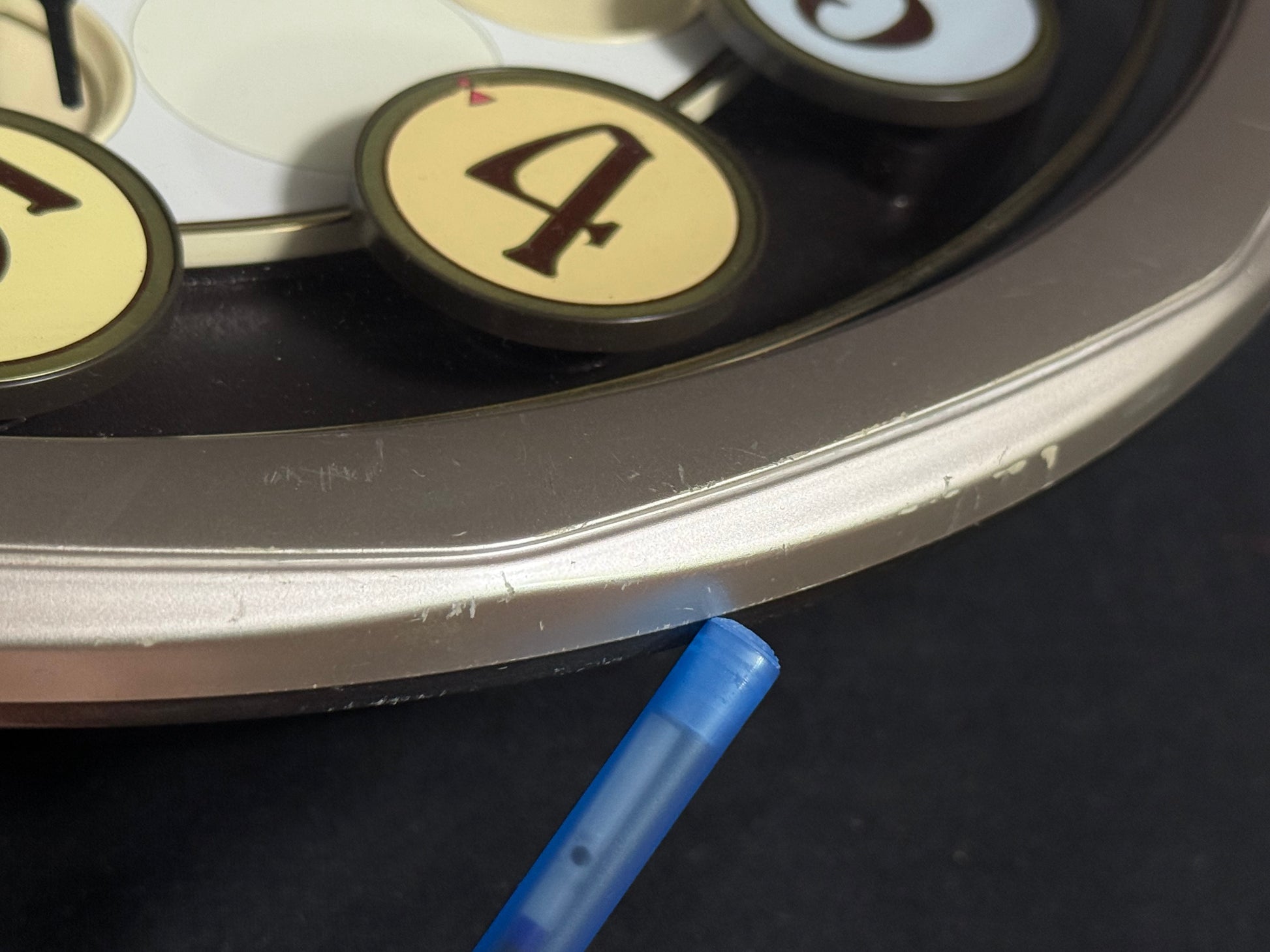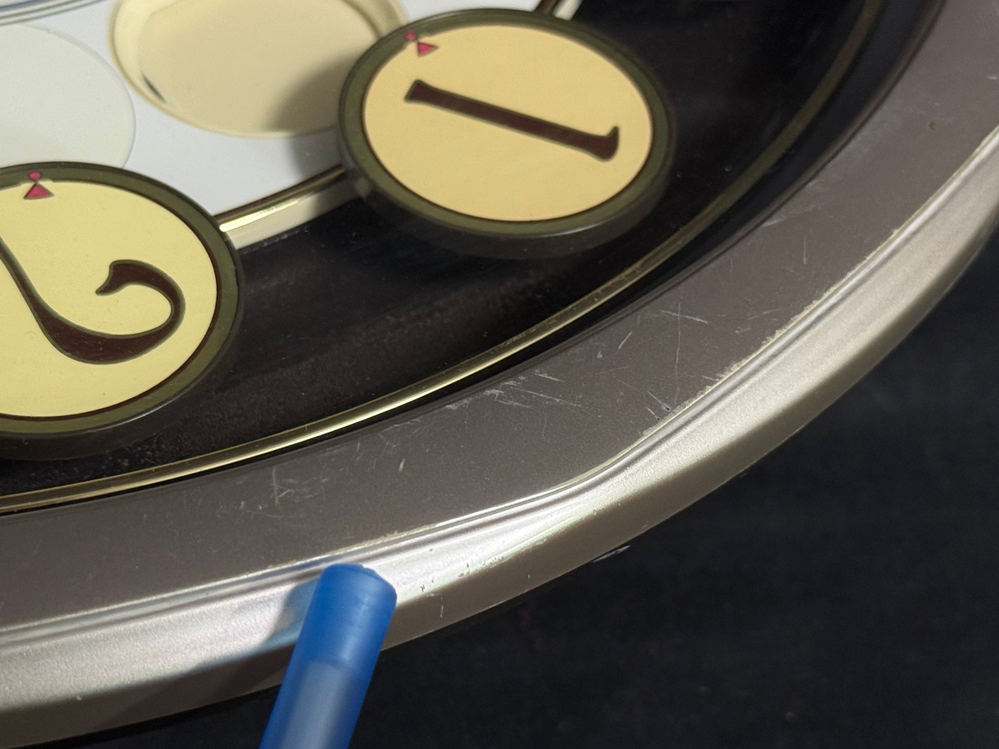 Notes: This piece has definitely seen better days physically. There are quite a few marks around the plastic frame, as shown in the photos. However, the clock still works and sounds great. Perfect for a clock collector!