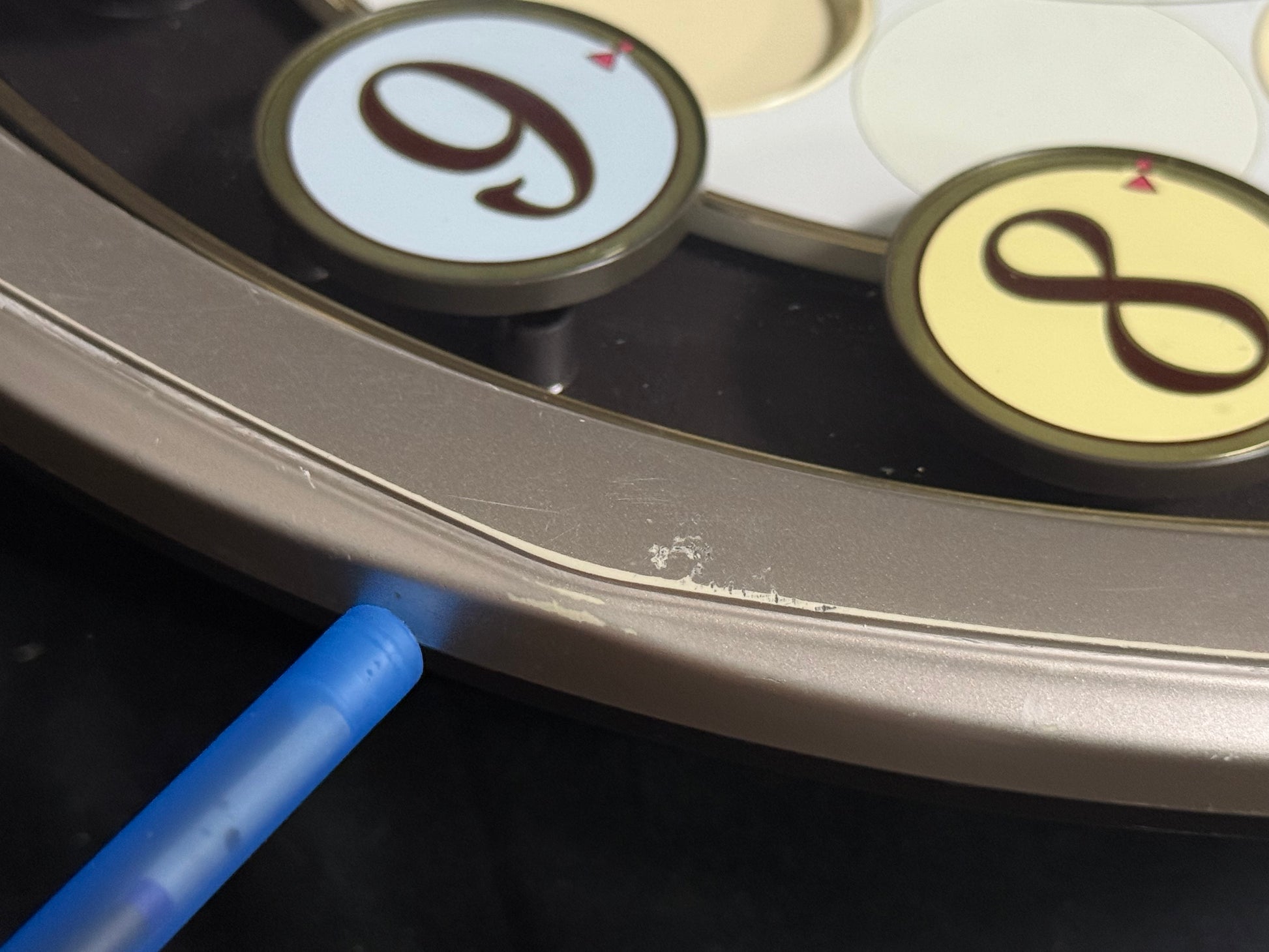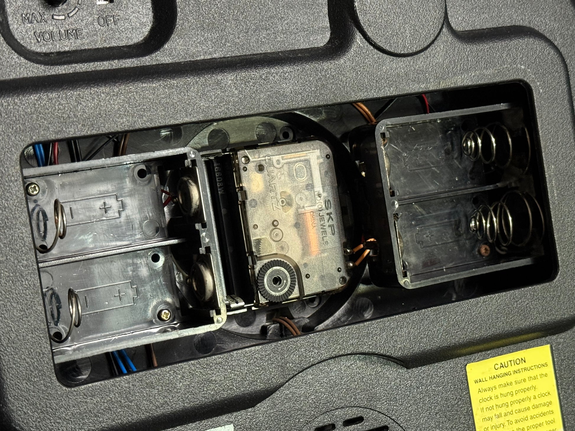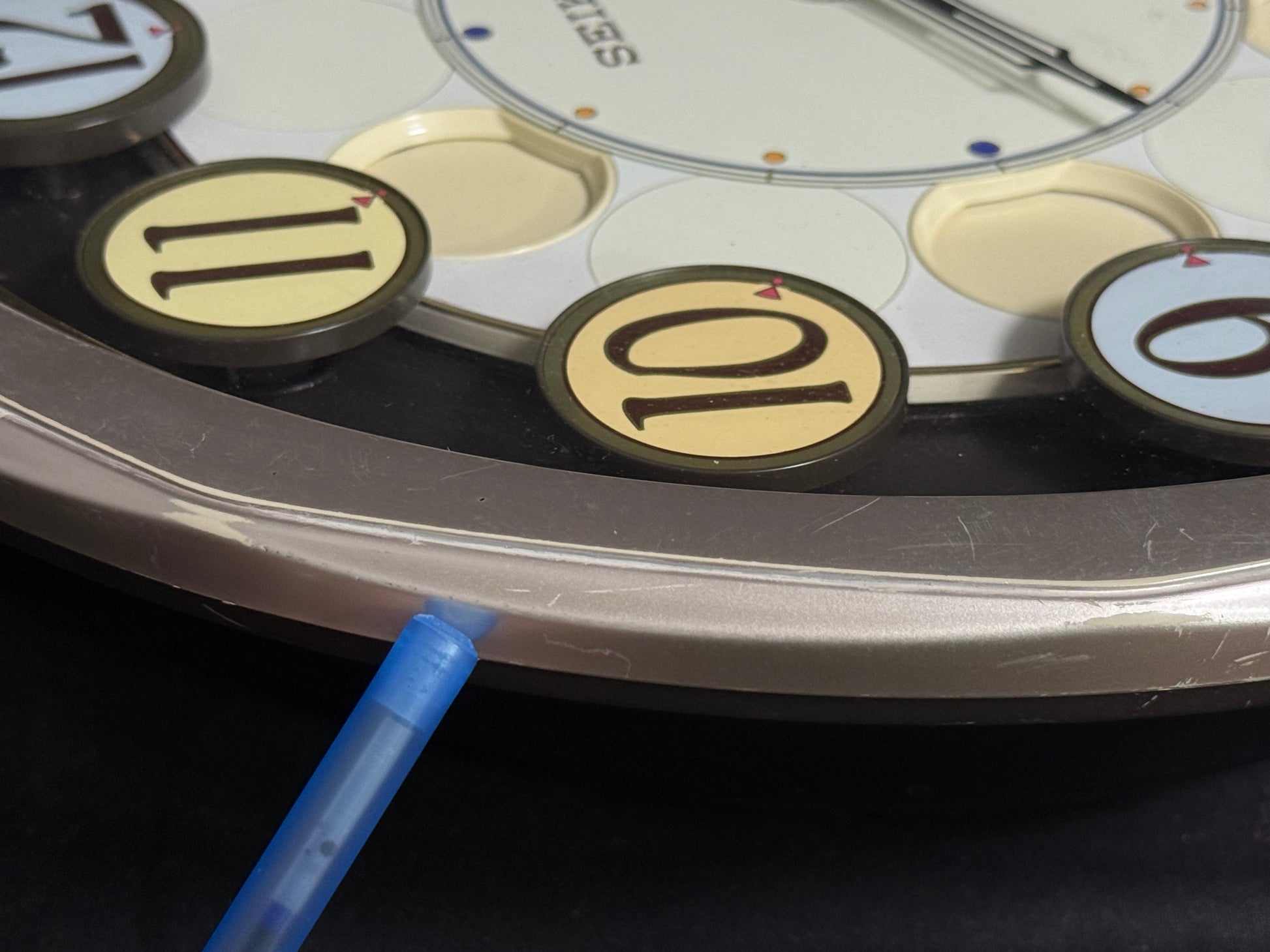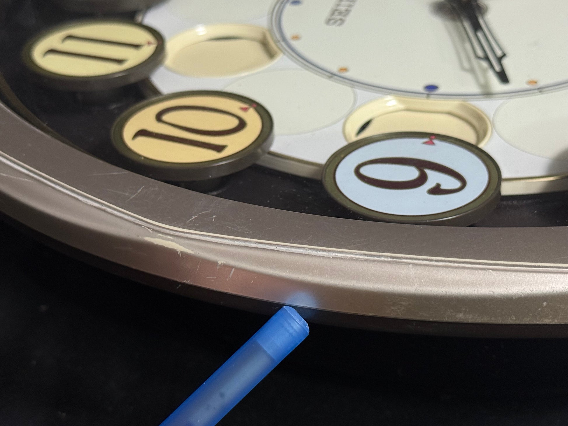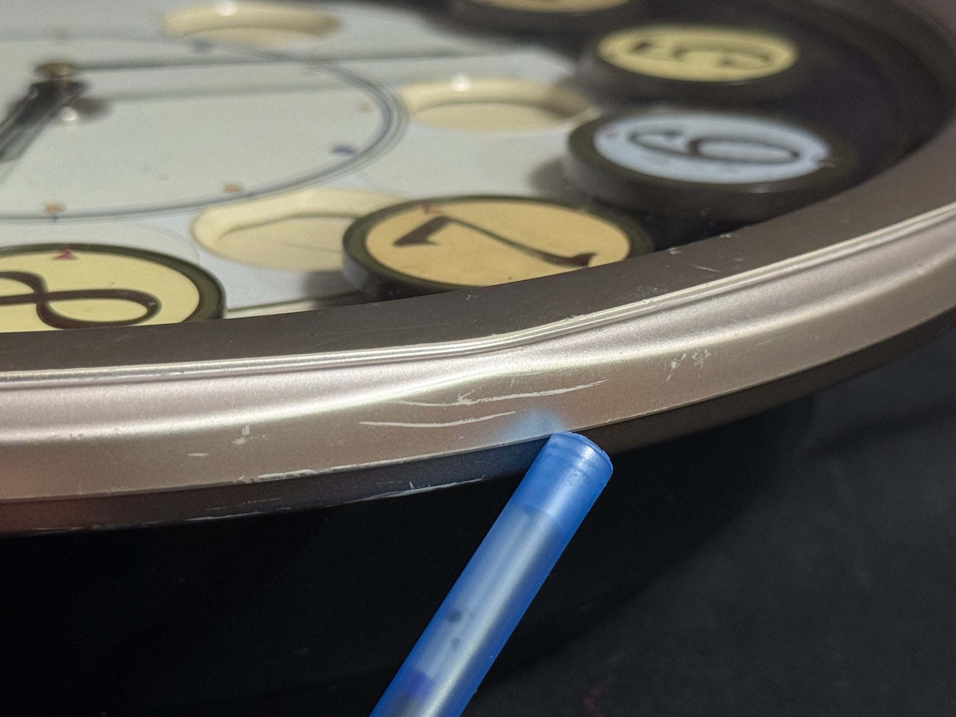 Notes: This piece has definitely seen better days physically. There are quite a few marks around the plastic frame, as shown in the photos. However, the clock still works and sounds great. Perfect for a clock collector!