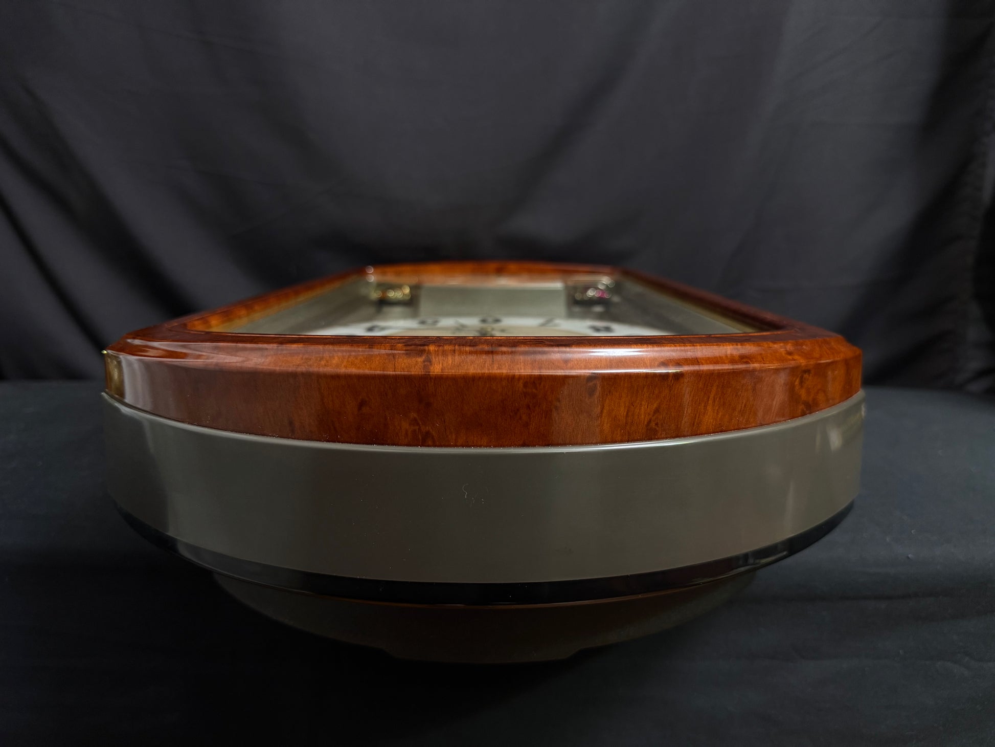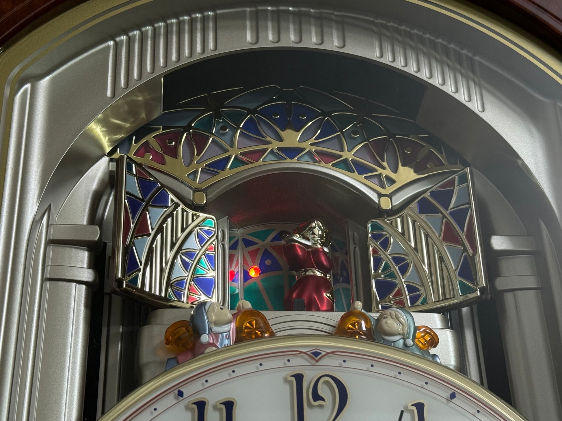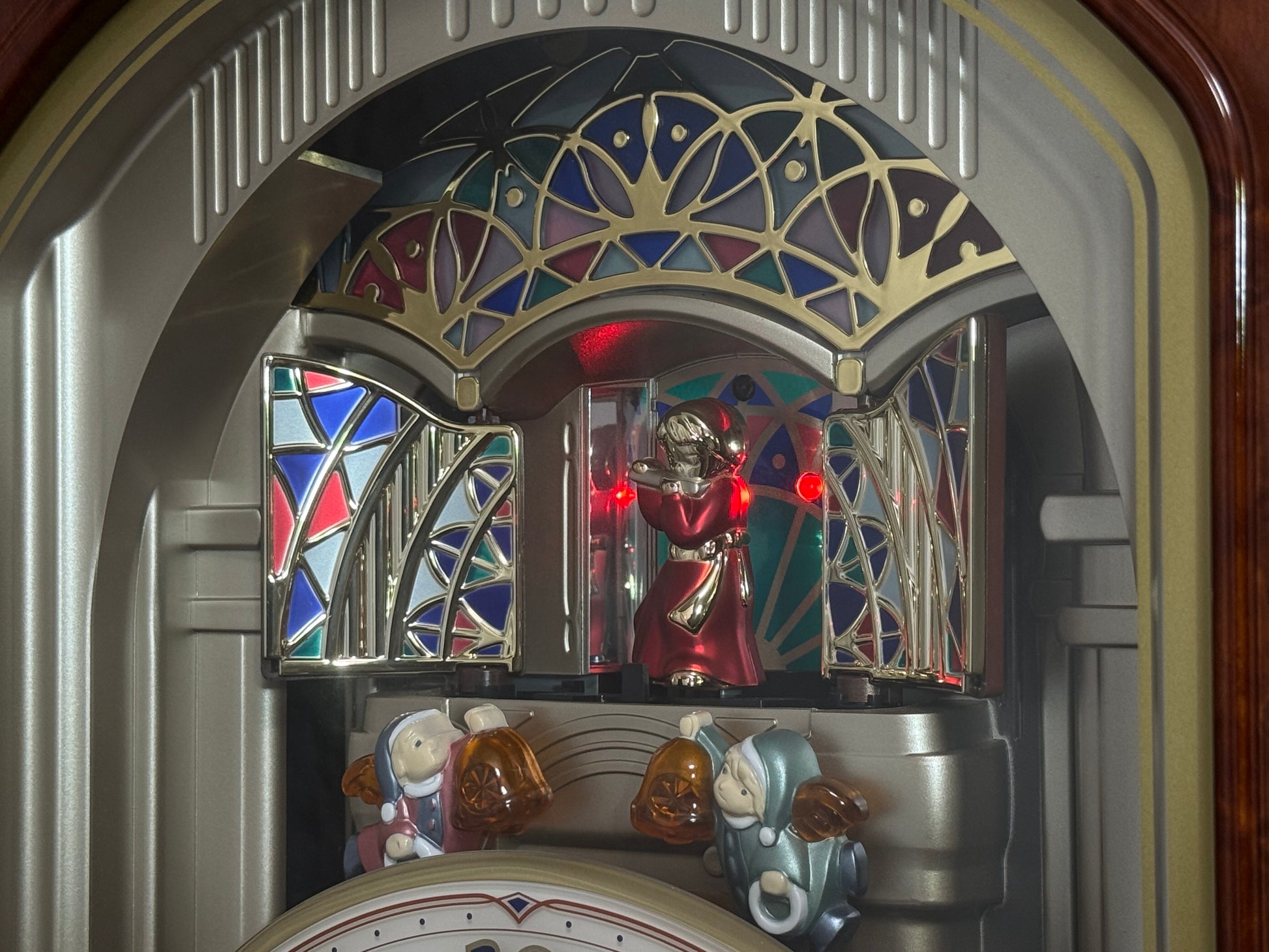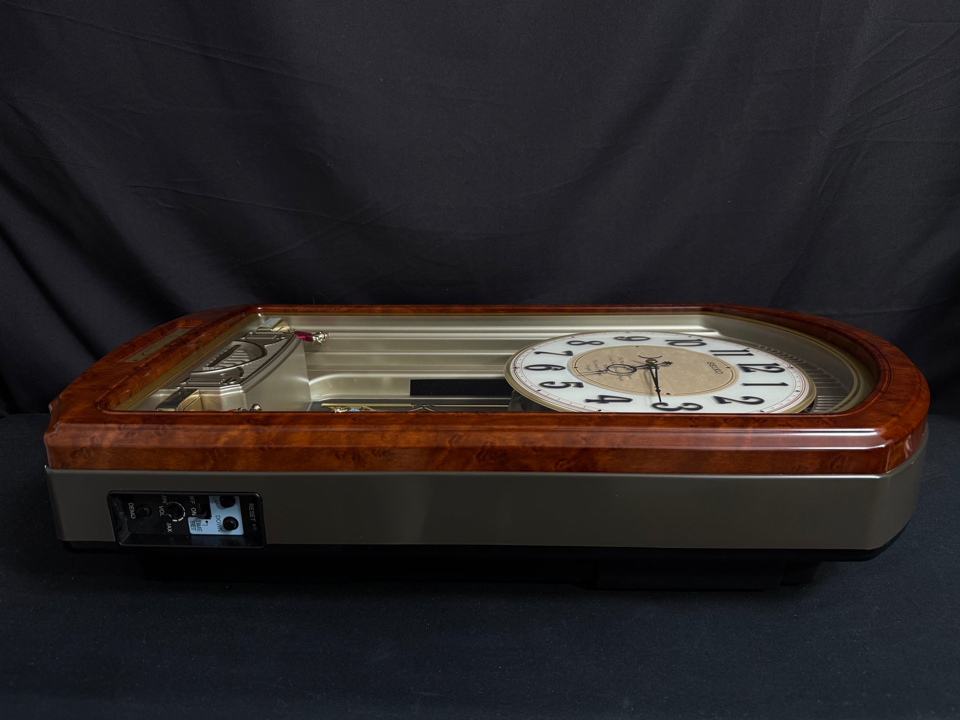 Notes: This clock is truly a masterpiece…and this one is in amazing condition for its age with only a few very small marks around the case. It even has the small Swarovski crystal sticker from when it was new (along with its original box). It’s worth noting that you can hear the motor running faintly during the introduction and ending, but it’s very normal for this specific model as it requires a stronger motor to move the dial up and down. I have cleaned the battery compartment as there was a small bit of leakage, but I have ensured that all wires have strong connections. Otherwise, the clock works and performs great! It will be shipped double boxed inside of its original packaging.