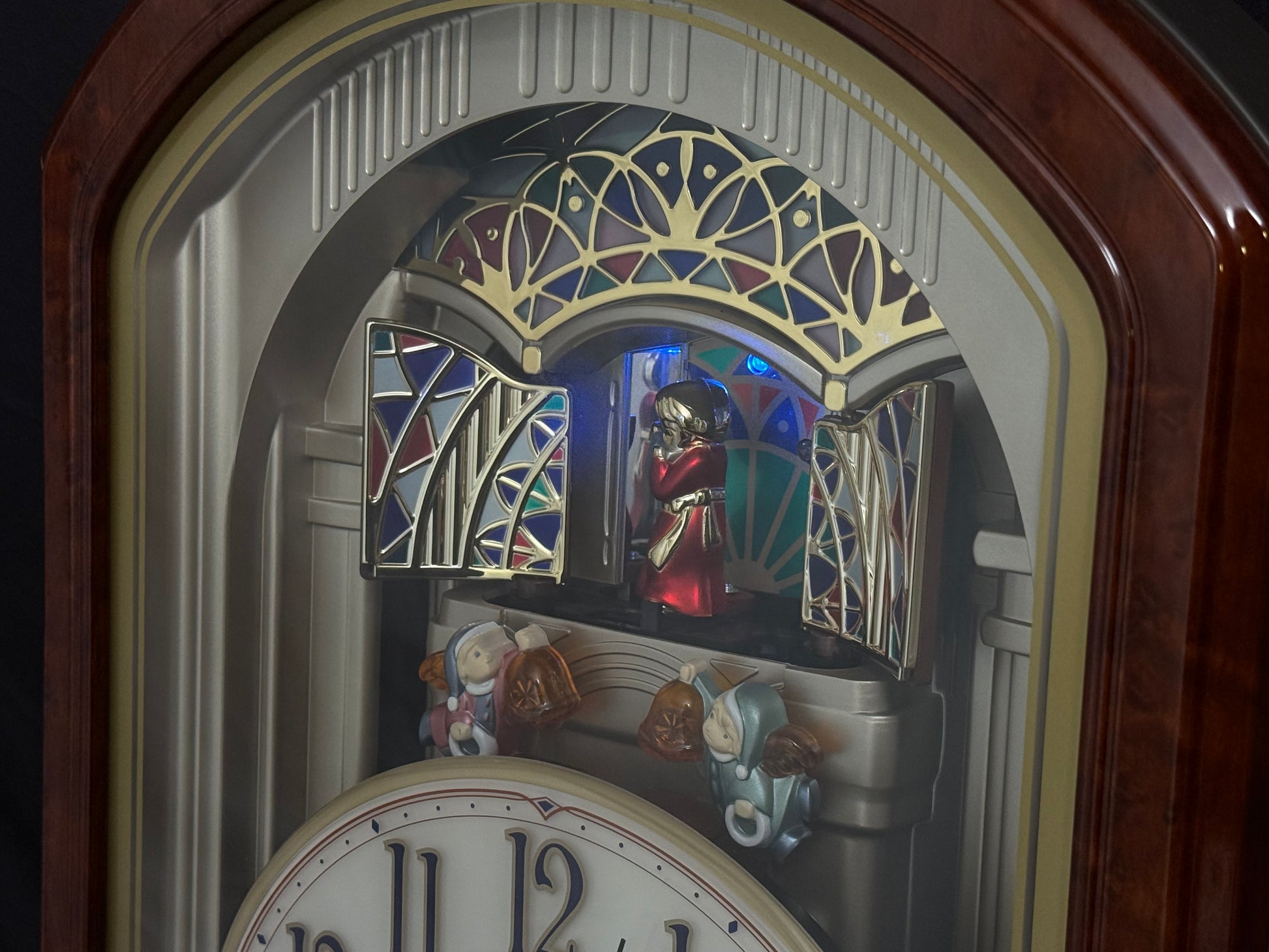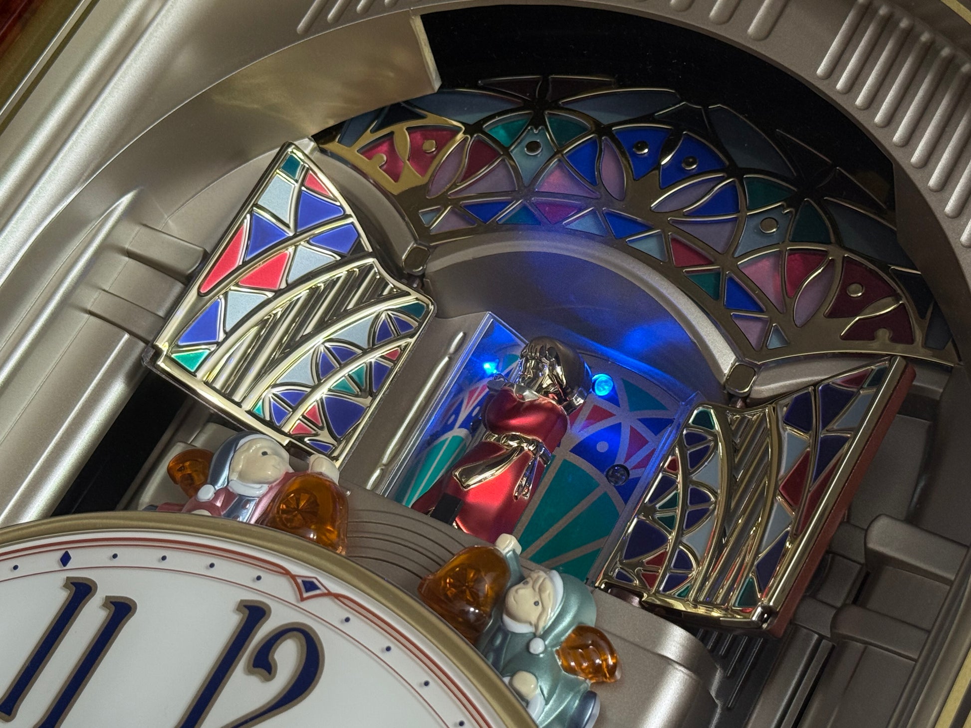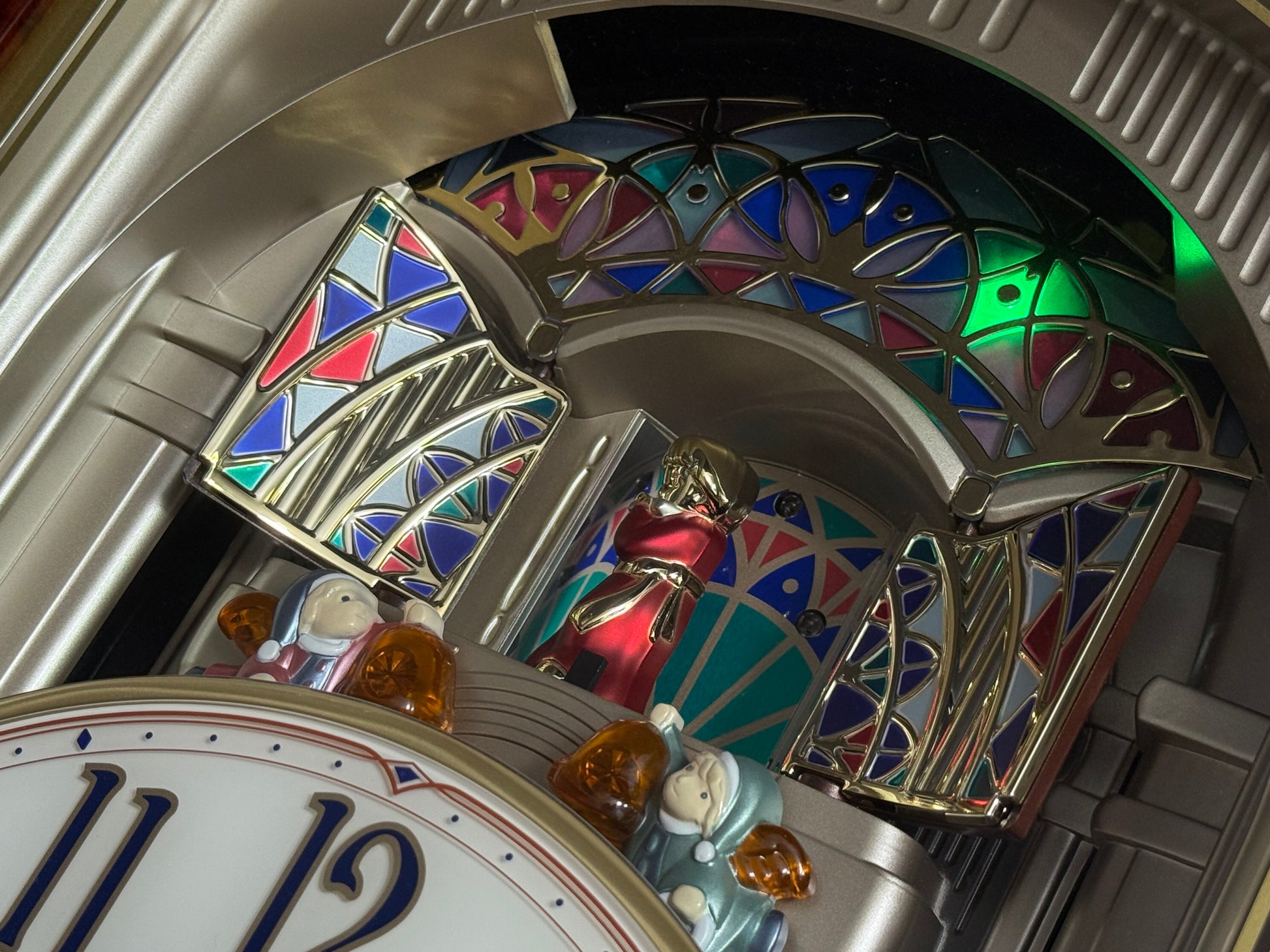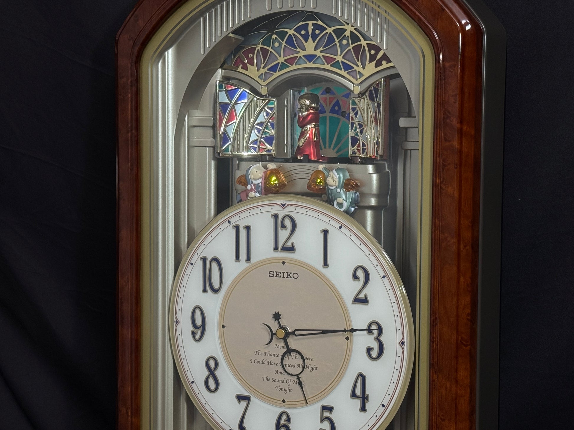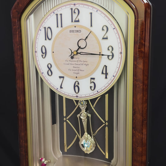 Bring the theater to your home with Seiko’s amazing QXM123BRH clock, nicknamed “Broadway Showtunes Dropping Dial.” Released in 2004, this clock was truly the star of Seiko’s early Melodies in Motion series lineup. The aesthetically-pleasing design and unusual movement of this clock make it one of the most unique Seiko clocks ever produced, and it is highly sought after by both clock collectors and theater enthusiasts alike. At the top of the hour or when the demonstration button is pressed, the clock dial drops completely down to cover the pendulum, revealing an extraordinarily captivating display of motion. The door in the center opens up, revealing a dancing flute player, while the multicolored LED lights hidden beneath the stained glass windows put on a stunning light show. It plays 6 melodies from various Broadway shows, such as “Phantom Of The Opera” and “West Side Story.” These songs are hard to find on musical clocks, as there haven't been any clocks with showtunes released since 2009 due to copyright issues. The decorative Swarovski crystal pendulum swings continuously.