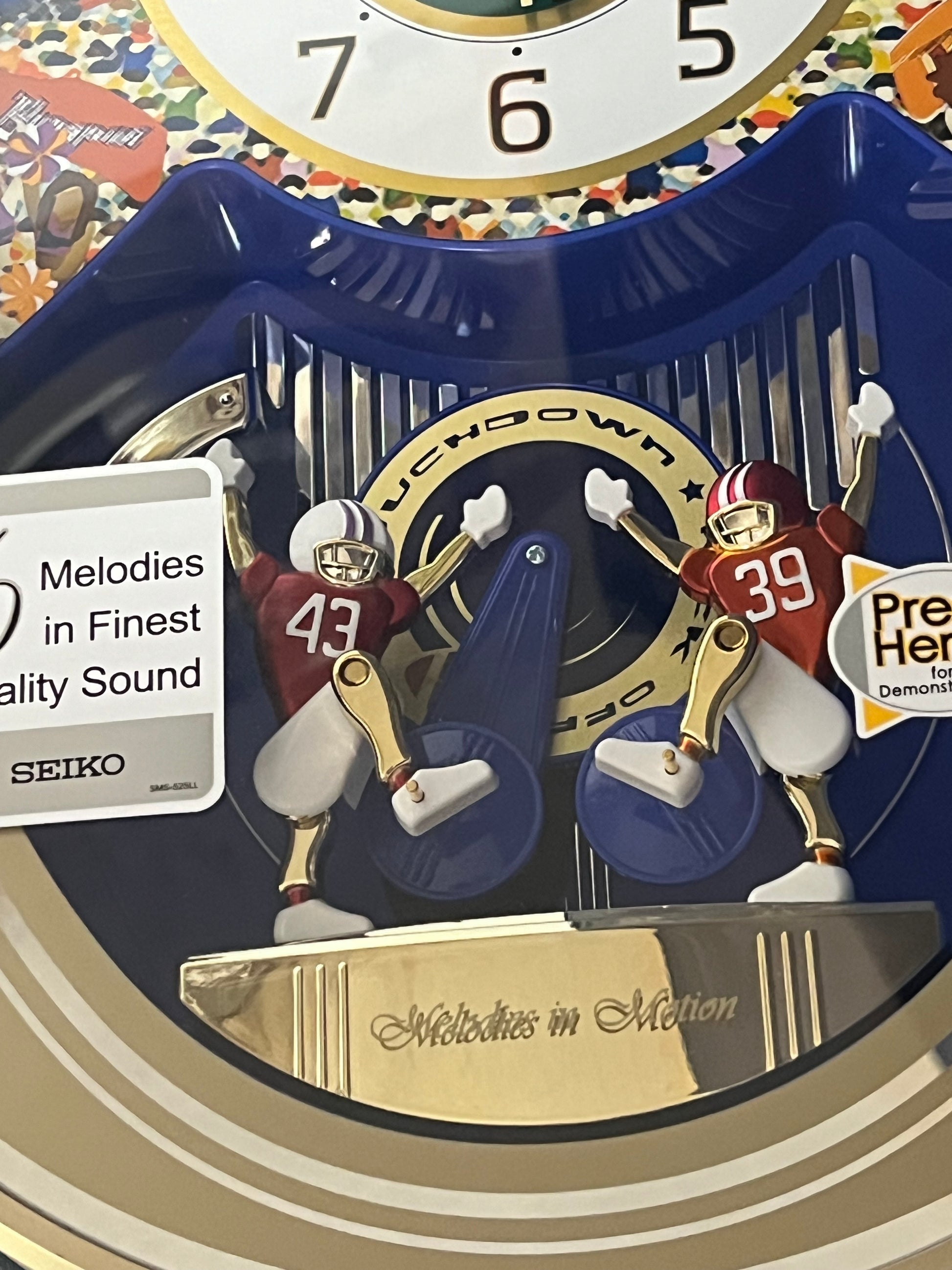Notes: This clock is in great used condition, and will come shipped double boxed inside of its original box. It also includes its original stickers and paperwork. There are some minor scratches and scuffs on the case, as shown in the photos. It’s a very interesting piece, and plays some unique songs only available on this clock and its baseball counterpart (although the baseball version has "Take Me Out To The Ball Game" instead of "Cavalry Charge"). Watch the video for a demonstration!