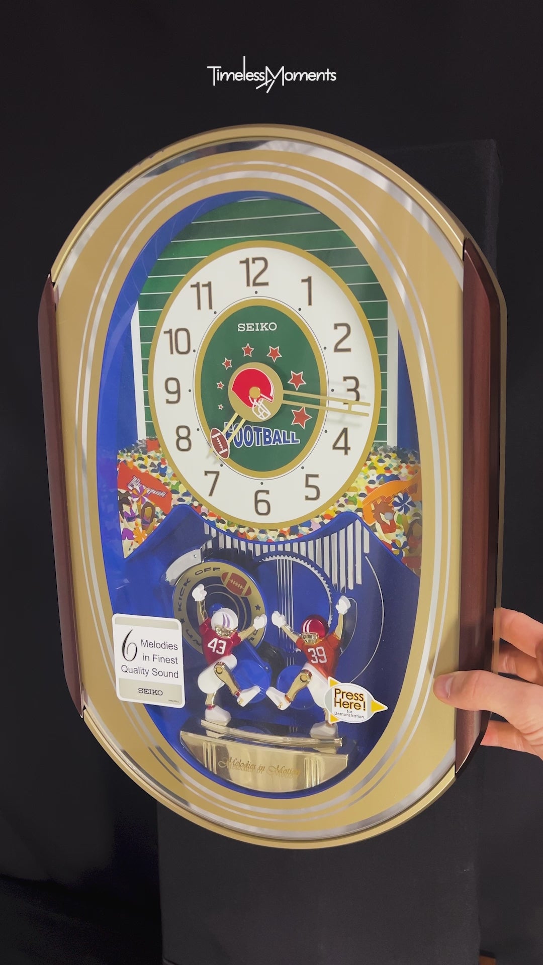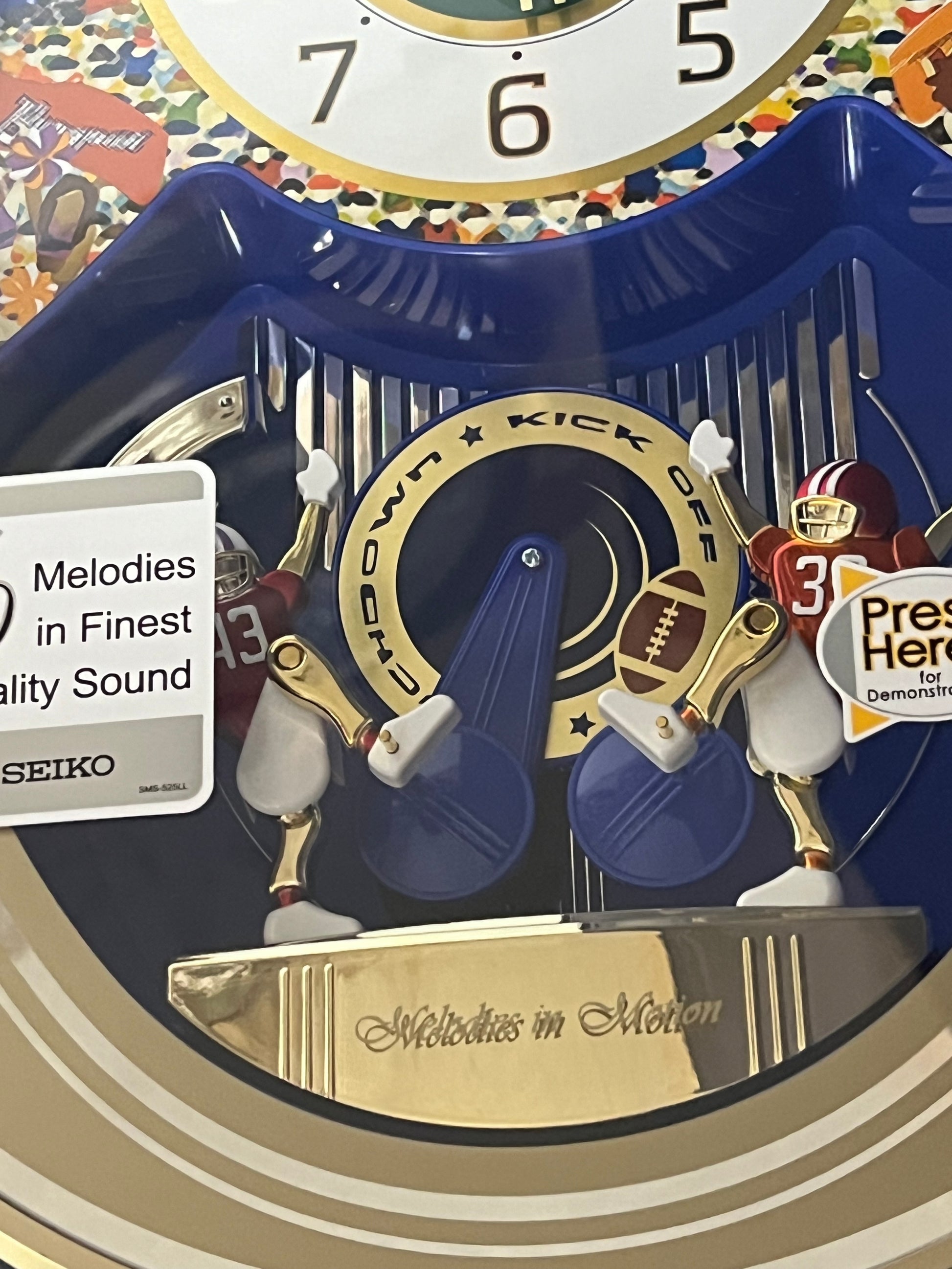 Ready, set, hut! Go long for Seiko’s QXM259GRH Football-themed Melodies in Motion wall clock. This energetic musical wall clock was released in 2009 alongside a baseball-themed version and was one of the first new faces of Seiko’s “QXM2” series of Melodies in Motion clocks. It was based off of Seiko’s QXM124GRH (and its Japanese counterpart, Diskdream RE528S) clock. The vibrant colors and lively details only begin to show the amusement behind this fun wall clock. At the top of the hour or when the demonstration button is pressed, the two football players below the clock dial move and celebrate a touchdown, as signified by the rotating disc behind them. It plays 6 historical Americana songs in Seiko’s Crystal Bell sound.