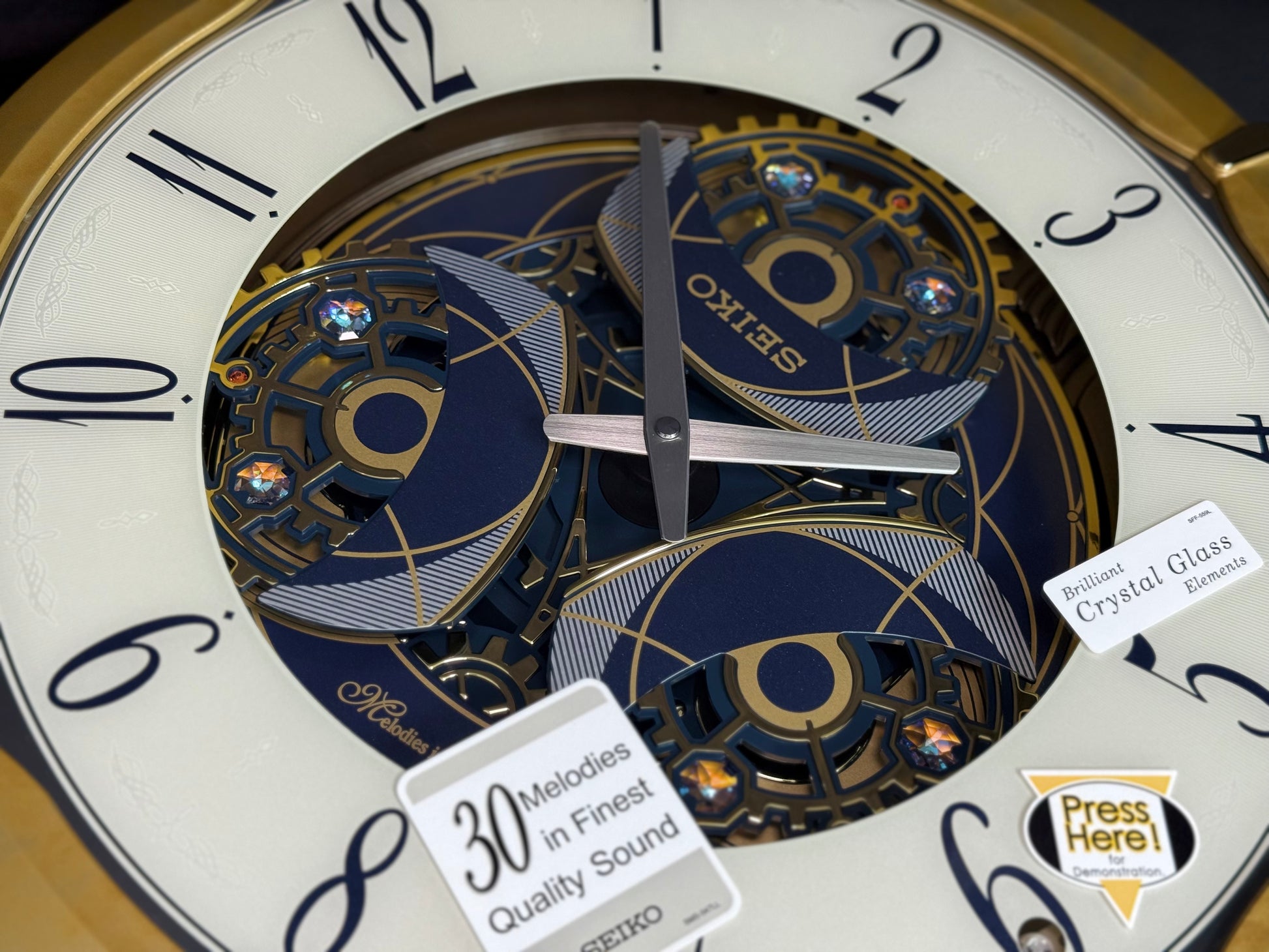 Introducing the "Kingly Mechanical"—a Melodies in Motion clock from Seiko with a touch of retrofuturism and lots of character. Spectacular three-dimensional gear motifs and bright blue crystals within the inner dial are what make this royal timepiece truly stand out. The soft gold marbled frame and navy blue accents give this design the perfect vintage flair. At the top of the hour or when the demonstration button is pressed, the golden gears begin to rotate and "dance" along to one of the clock's 30 total melodies. Music includes iconic pieces such as "Morning Mood" and "Beautiful Dreamer" performed in either Seiko's breathtaking Music Box sound or their world-renowned Crystal Bell sound. As the central dial moves, it creates a uniquely satisfying display that is sure to be a crowd-pleaser.