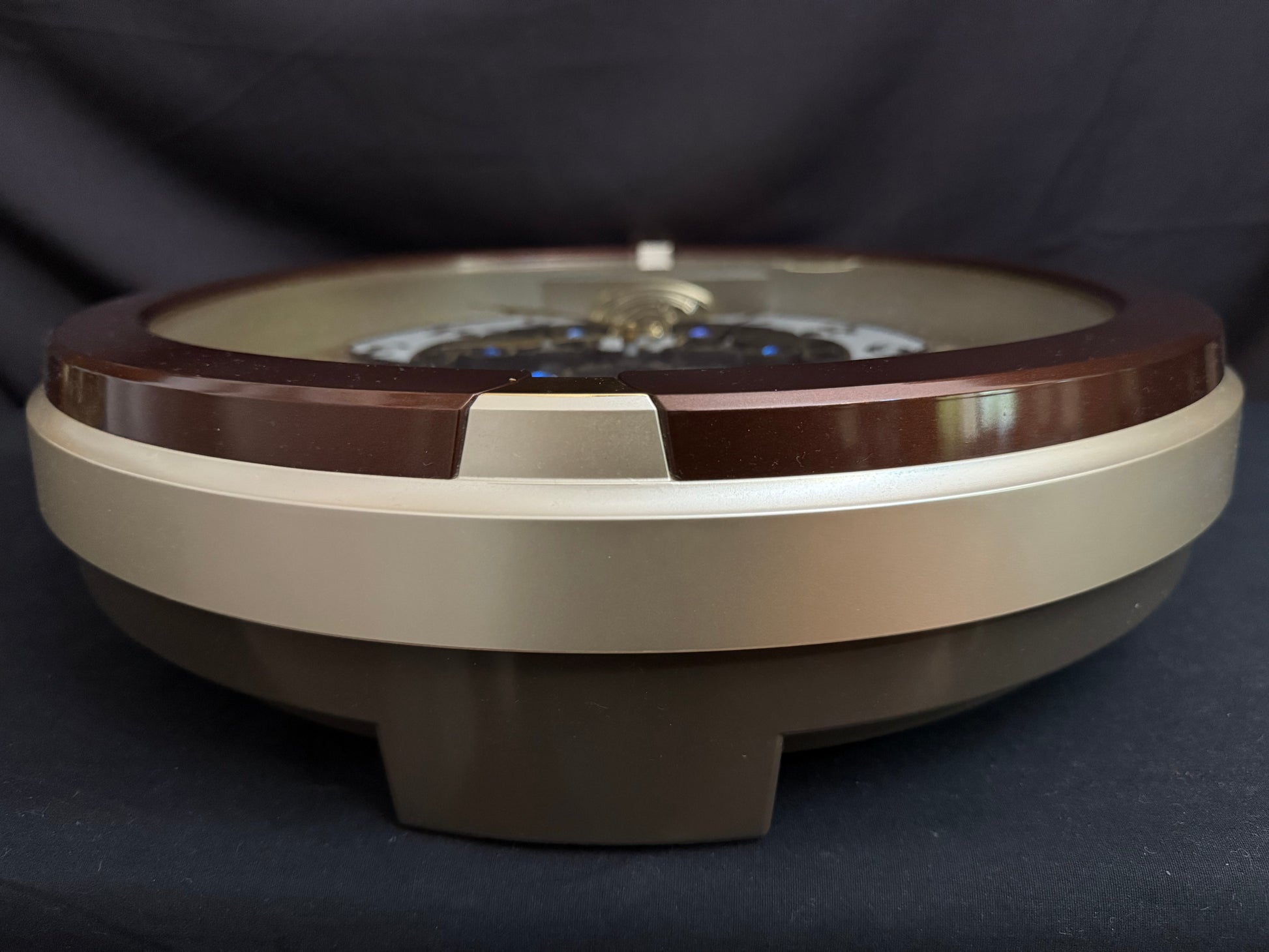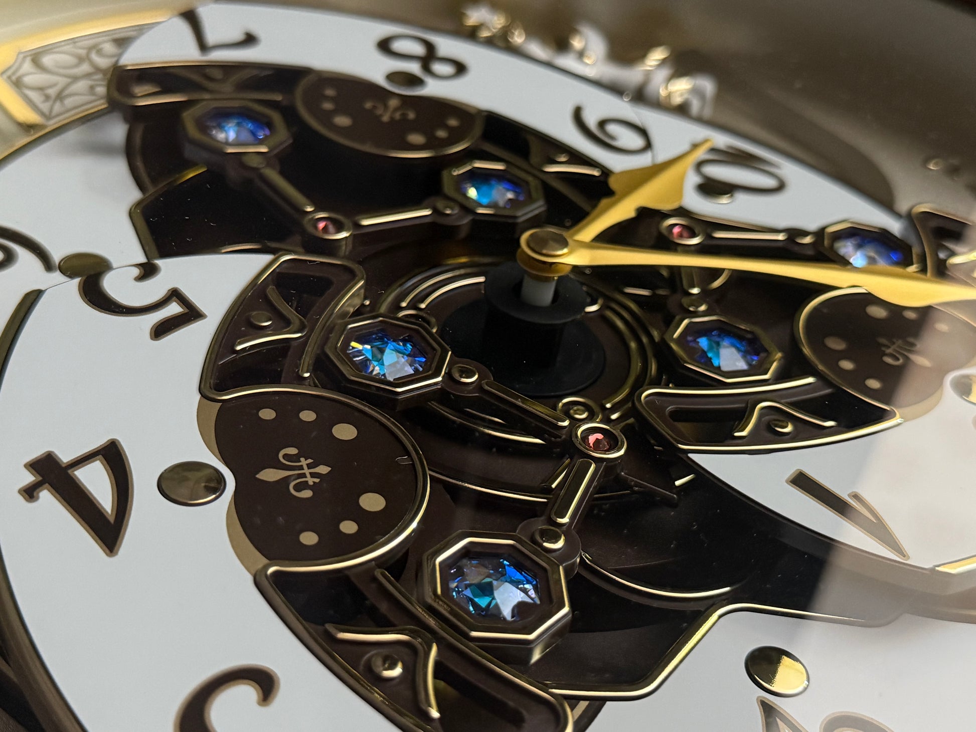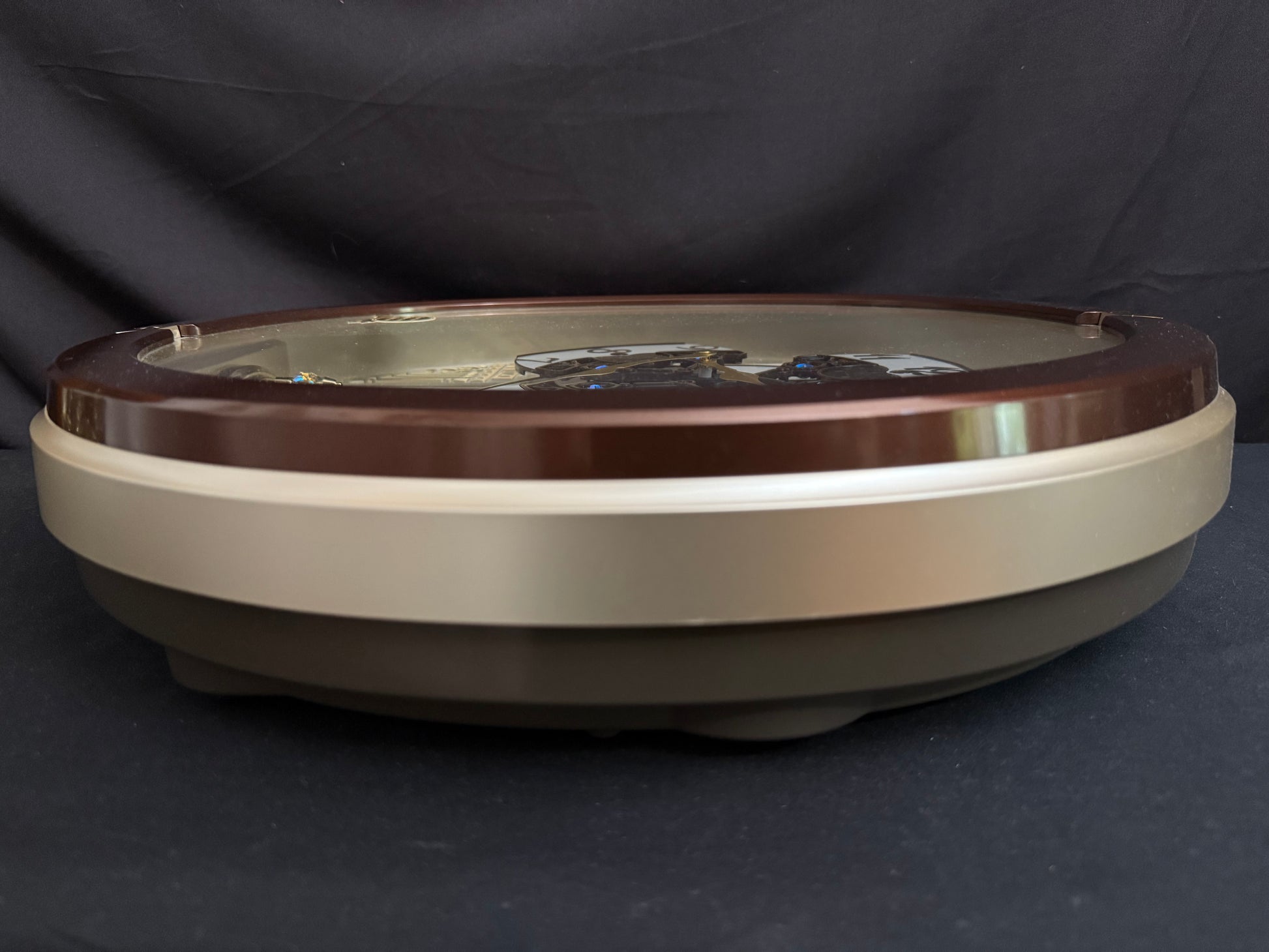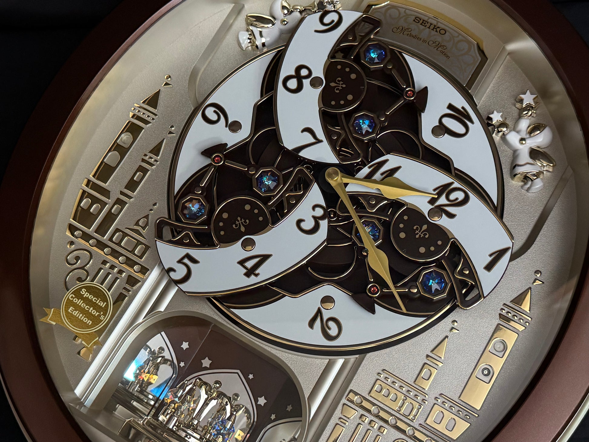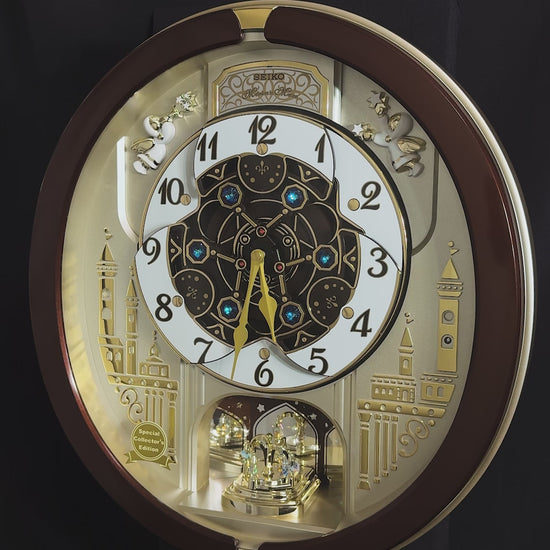 Seiko’s 2013 Collector's Edition Melodies in Motion clock brought upon a new era for the brand. This was the first of the “new-age” Collector’s Edition Melodies in Motion clocks, which featured a "dancing” dial with three rotating dial sections. Nowadays, this style has become very popular, and there have been quite a few variations…but this model was the first the world had ever seen. Every hour or when the demonstration button is pressed, the 3-piece dial comes to life and rotates along to the sound of one of 18 total melodies. 6 of these melodies are popular songs from the 1970s, which are hard to find on musical clocks nowadays due to strict copyright laws. A decorative rotating pendulum adorned with Swarovski crystals rotates below the dial continuously.