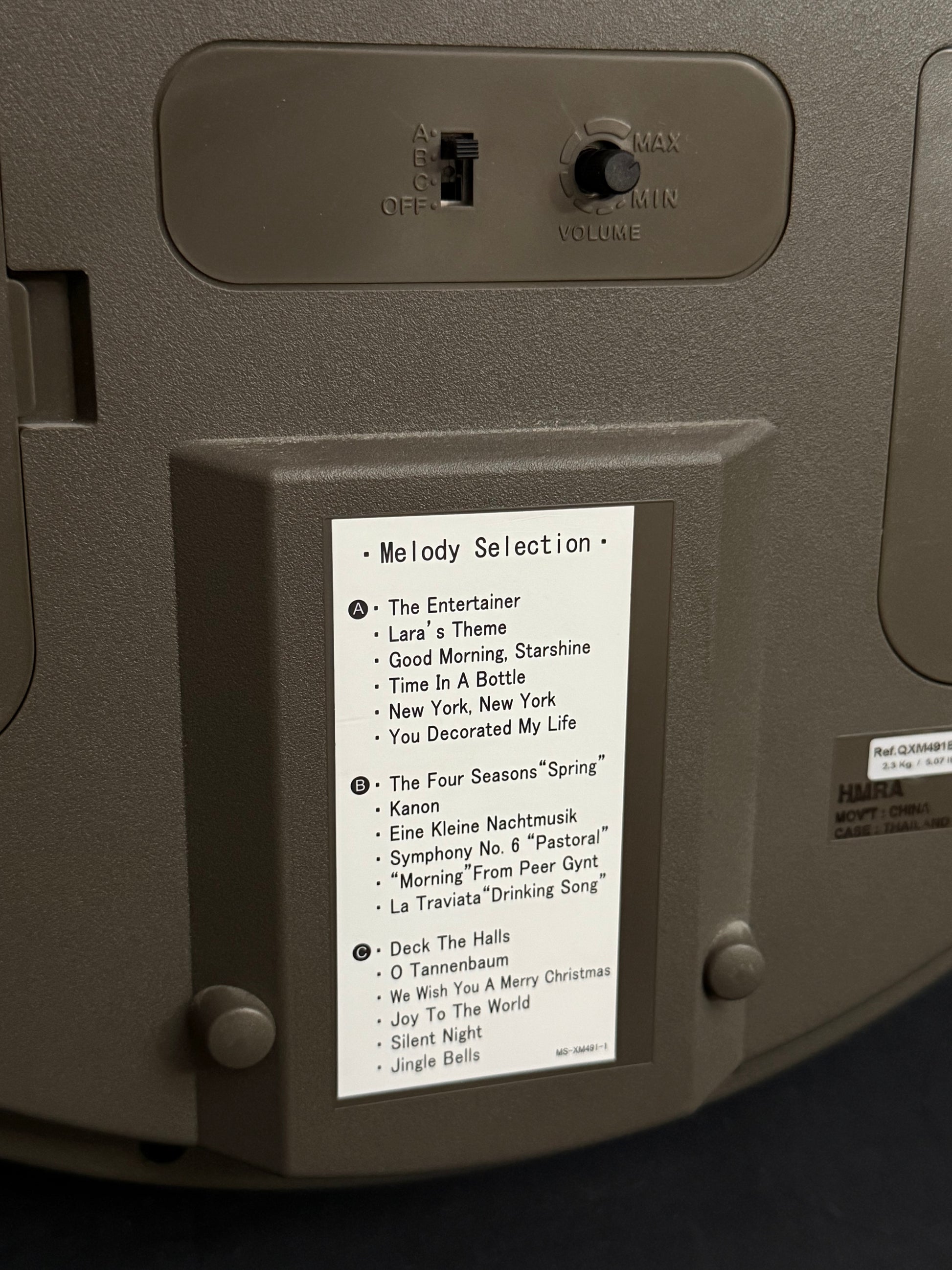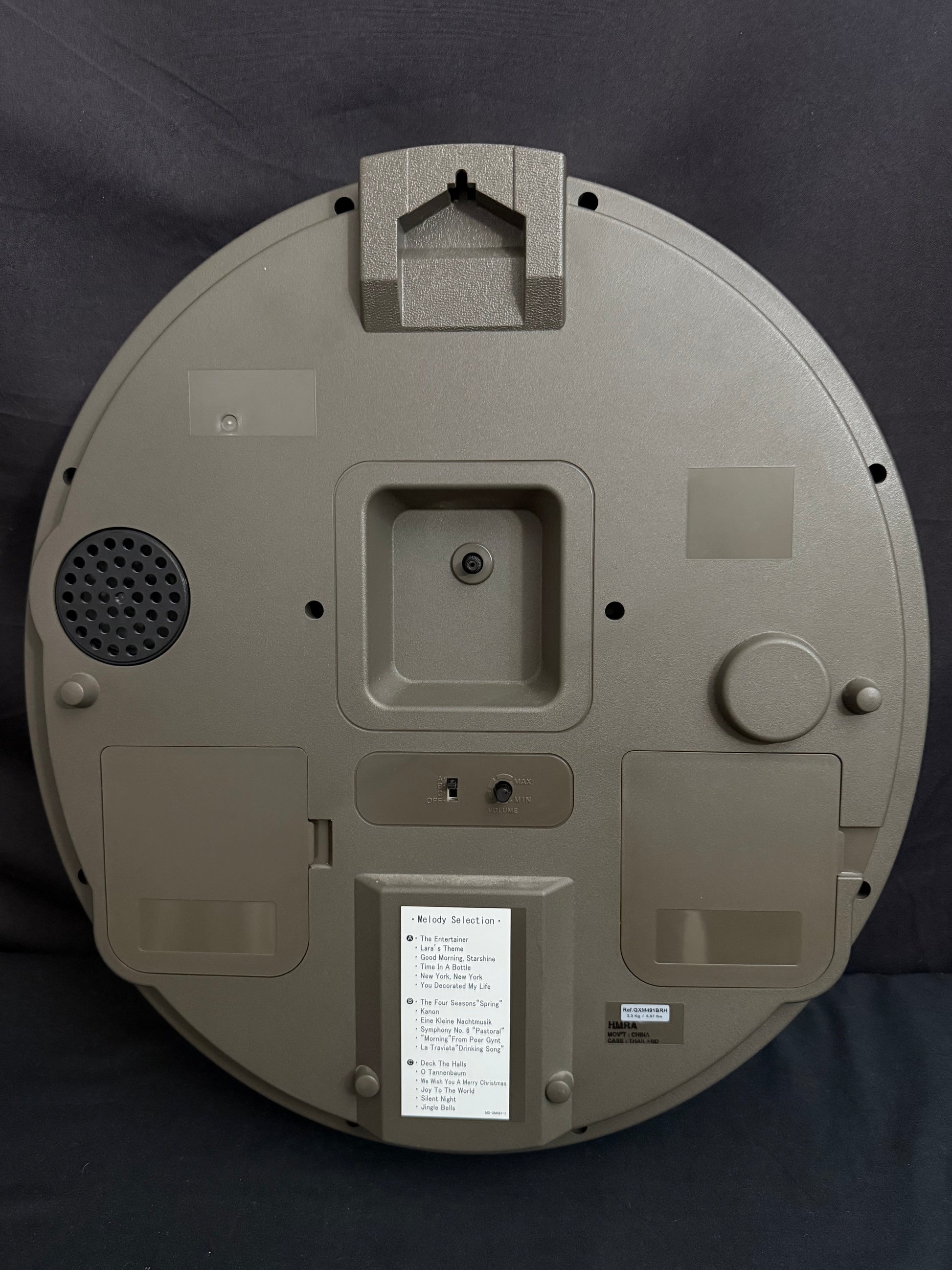 - On/off switch to turn hourly music on or off