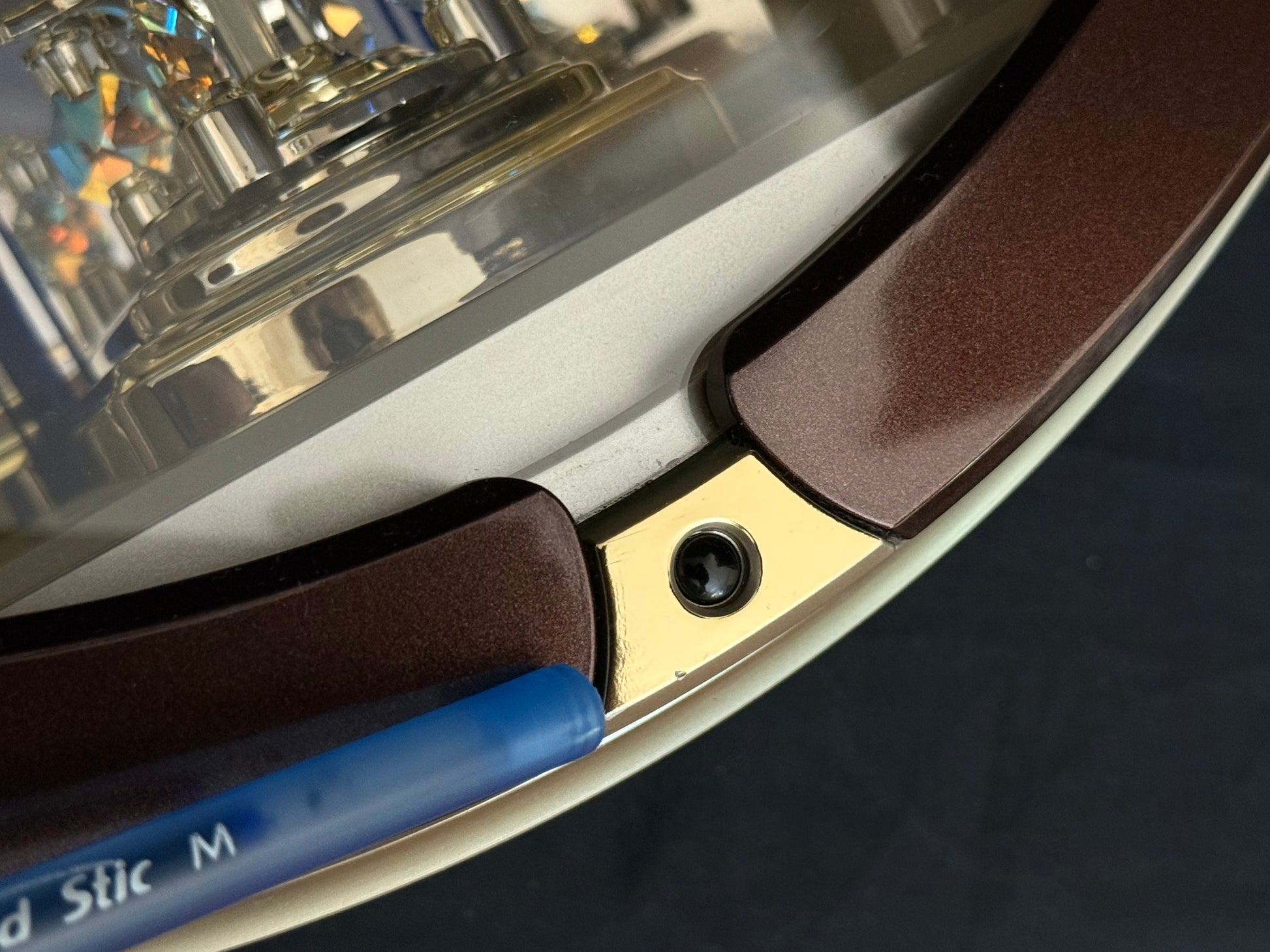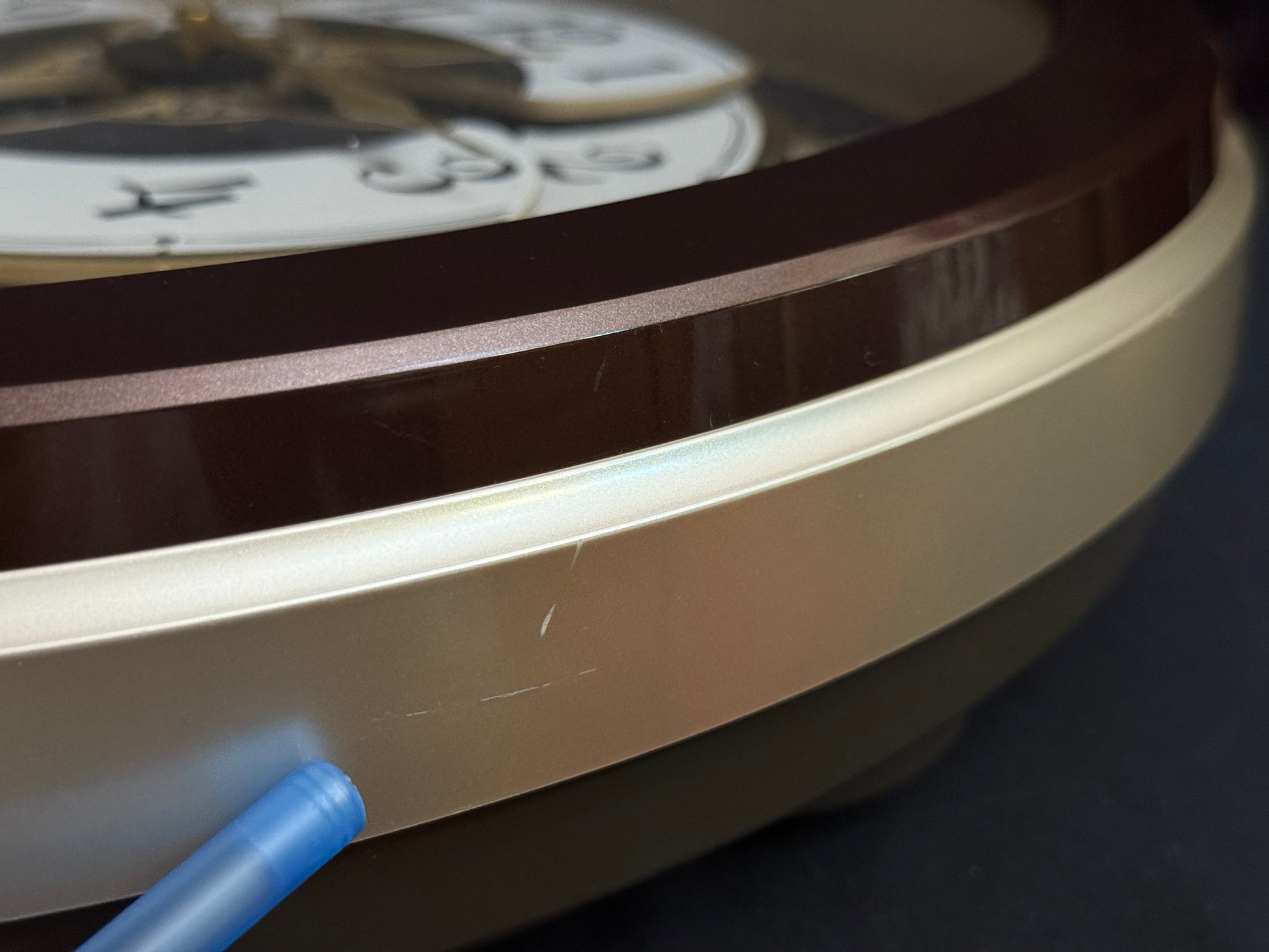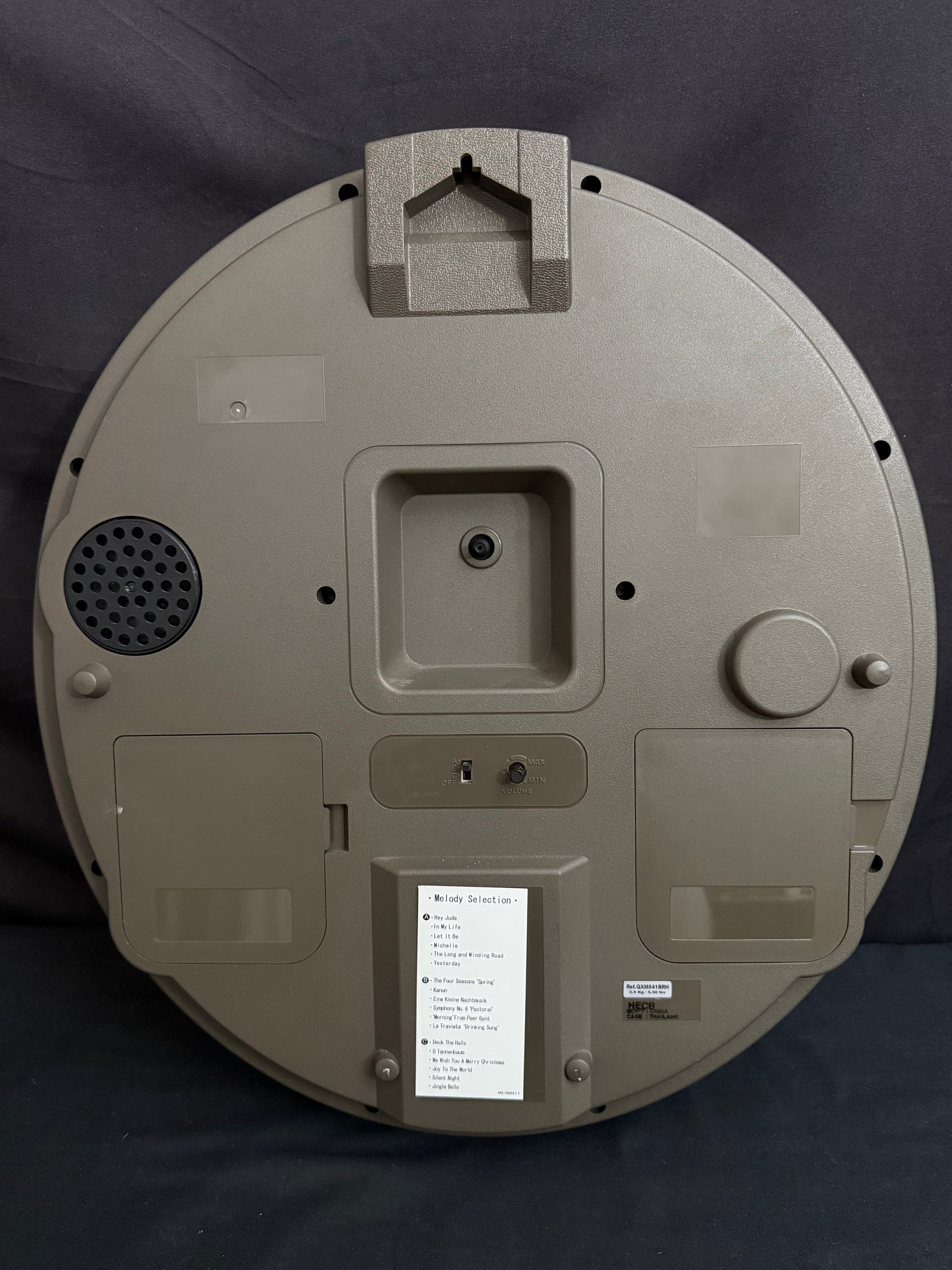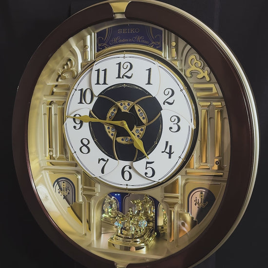 The QXM541BRH was Seiko’s yearly Special Collector’s Edition Melodies in Motion clock available exclusively at Sam’s Club in 2014. It is one of the post-2012 “new age” versions, with a magnificent 6-piece dancing dial. Every hour or when the demonstration button is pressed, the vibrant blue sections of the dial come to life and rotate to reveal stars beneath them. As they move, they pause to the beat of the music to appear as if they were dancing along. The clock plays 18 total melodies, with 6 of them being songs by The Beatles. These songs are now hard-to-find due to strict copyright laws, as the last model to be produced with them was discontinued in 2016. Below the face is a decorative rotating pendulum adorned with Swarovski crystals that rotates continuously.