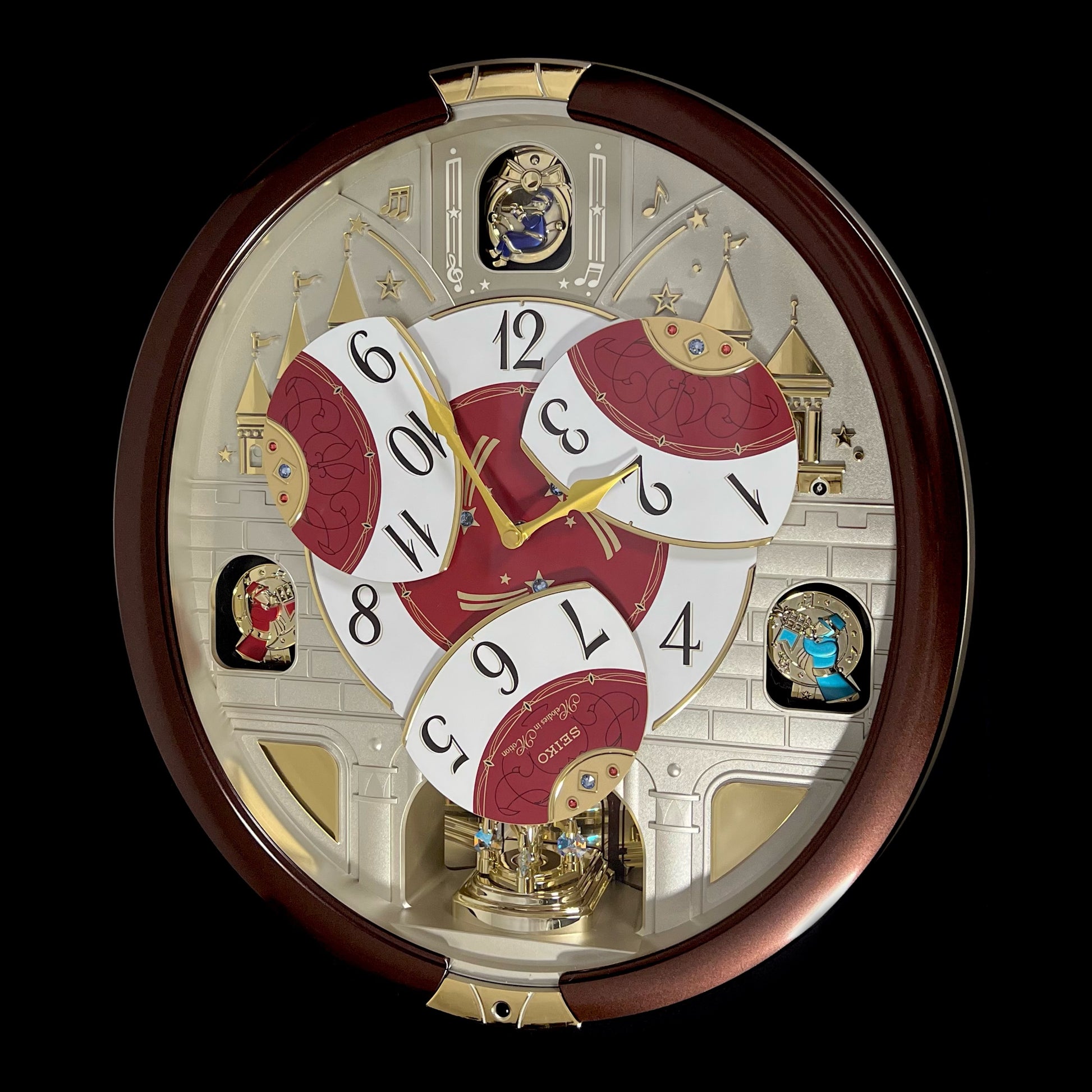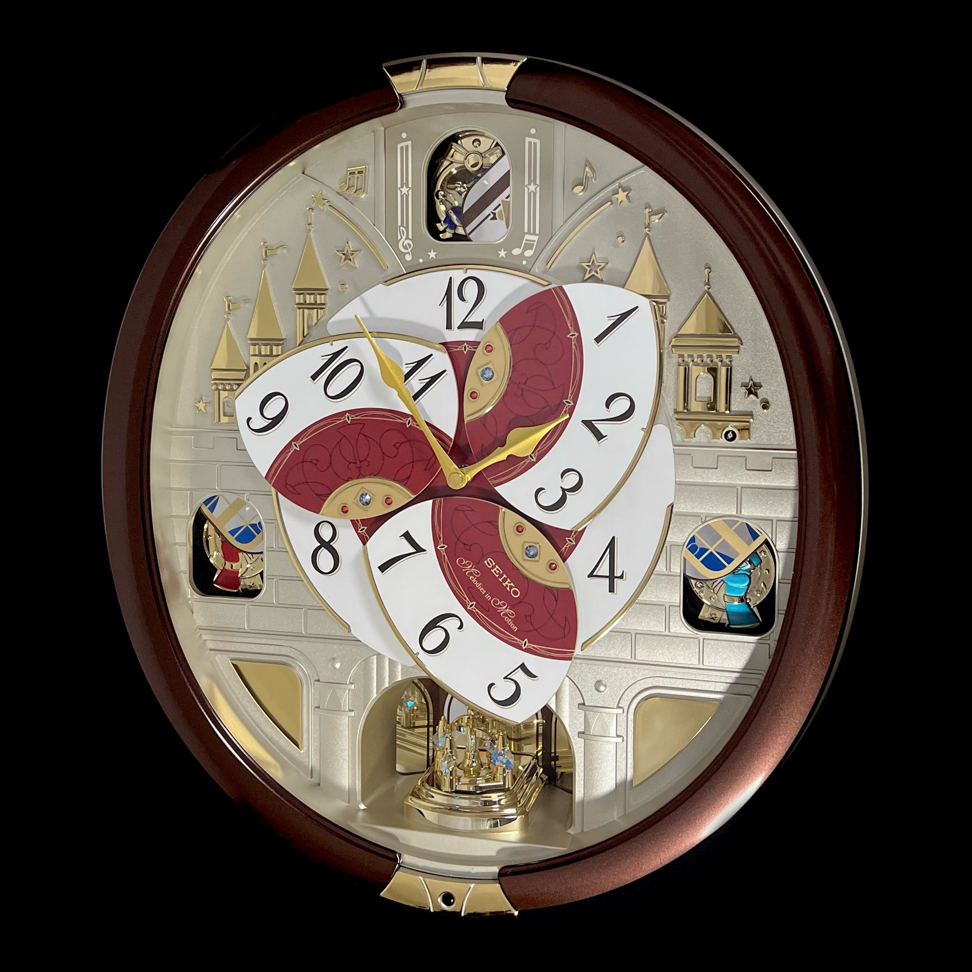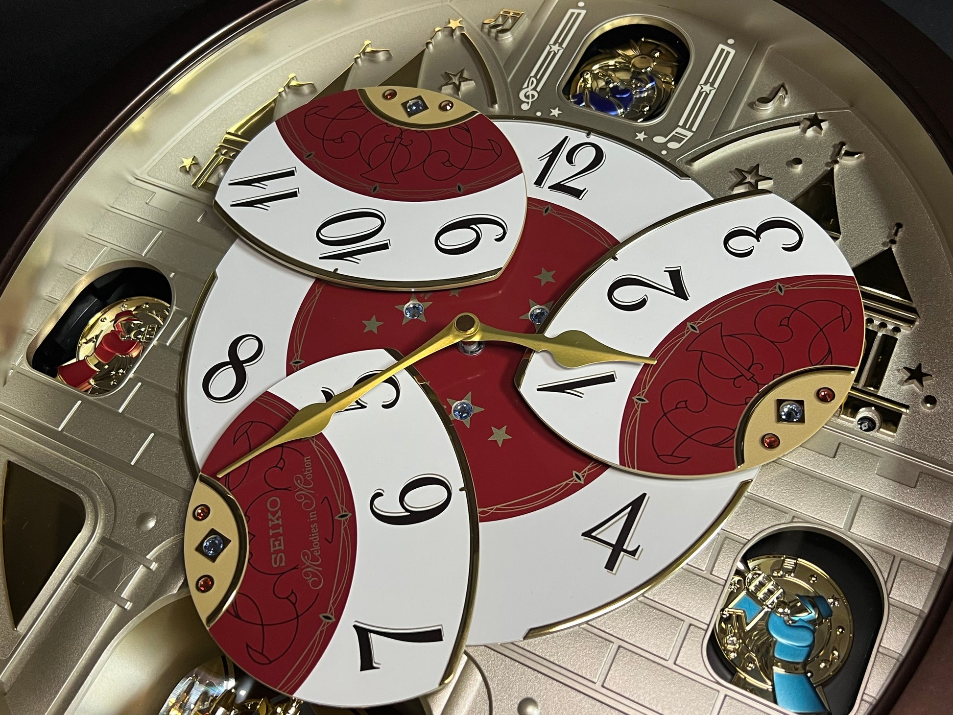2016 brought yet another one of Seiko’s yearly Special Collector’s Edition Melodies in Motion clocks available exclusively at Sam’s Club. It is one of the post-2012 “new age” models, with a rotating dial that appears to “dance” along to the music. This year, Seiko modified the design slightly to include three declarative doors. Every hour or when the demonstration button is pressed, the doors open up to reveal moving figurines while the striking red dial comes to life and dances along to the tune of one of 24 total melodies. 6 of these 24 melodies are songs by The Beatles, which are now hard-to-find on these clocks due to strict copyright laws. This was the last model to be produced with them. Below the face is a decorative rotating pendulum adorned with Swarovski crystals that rotates continuously.