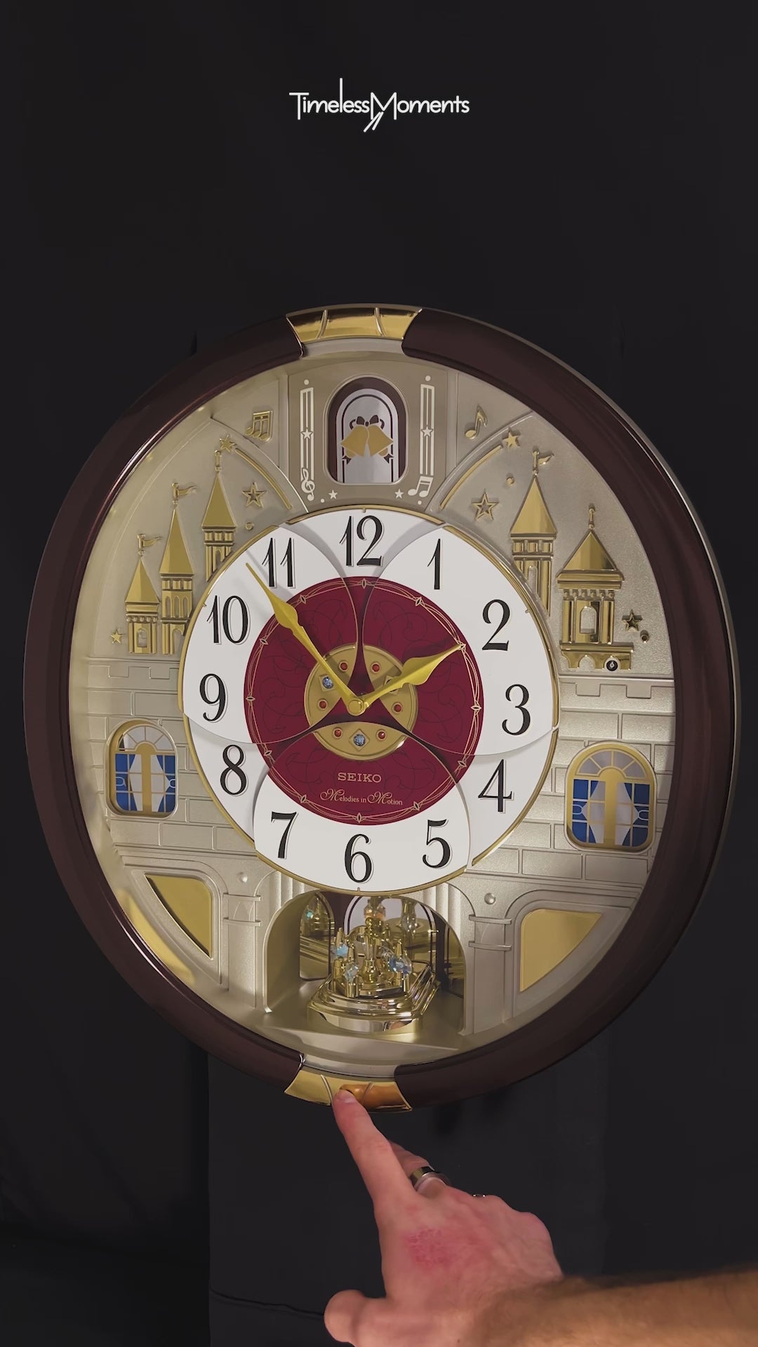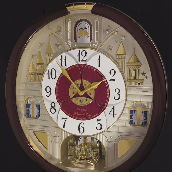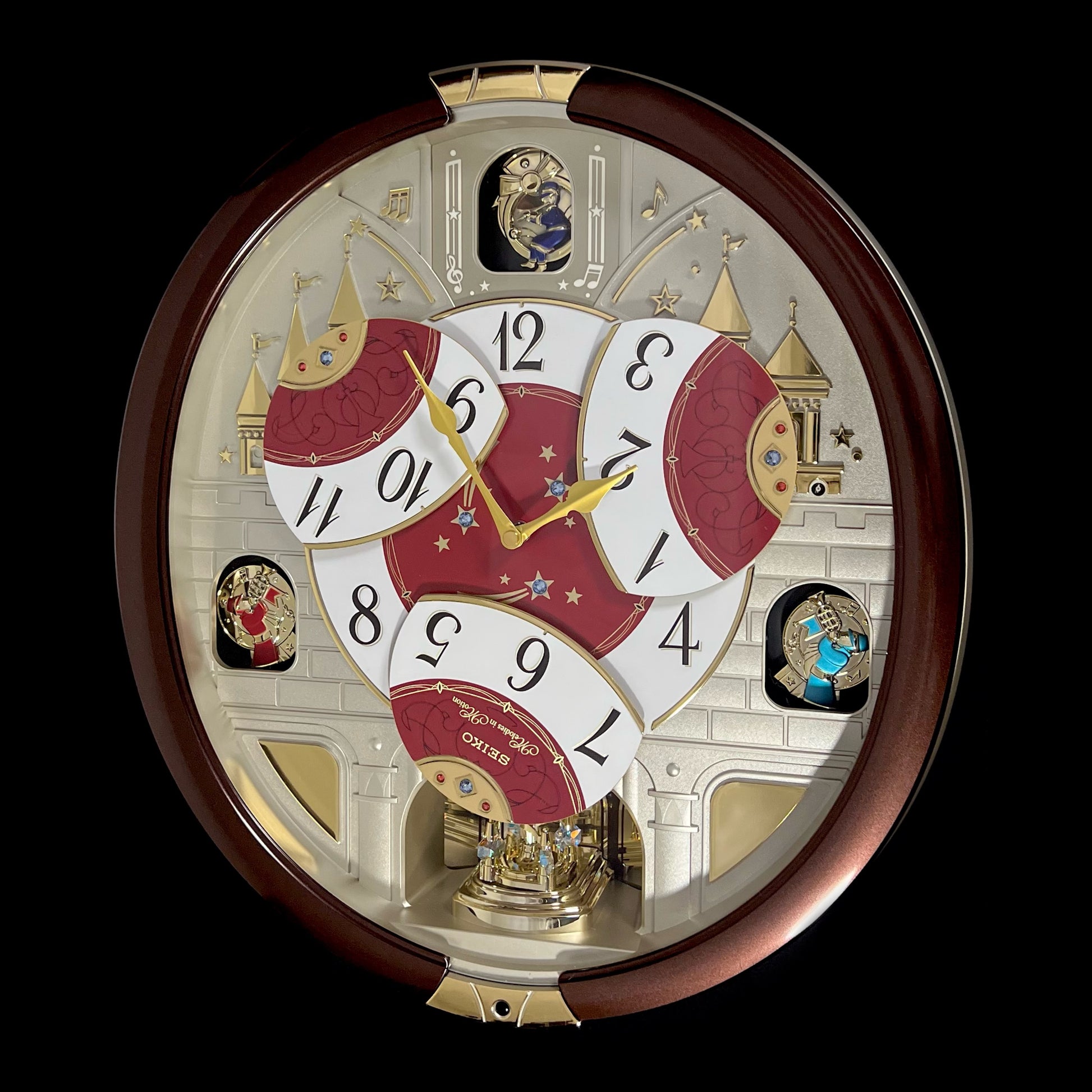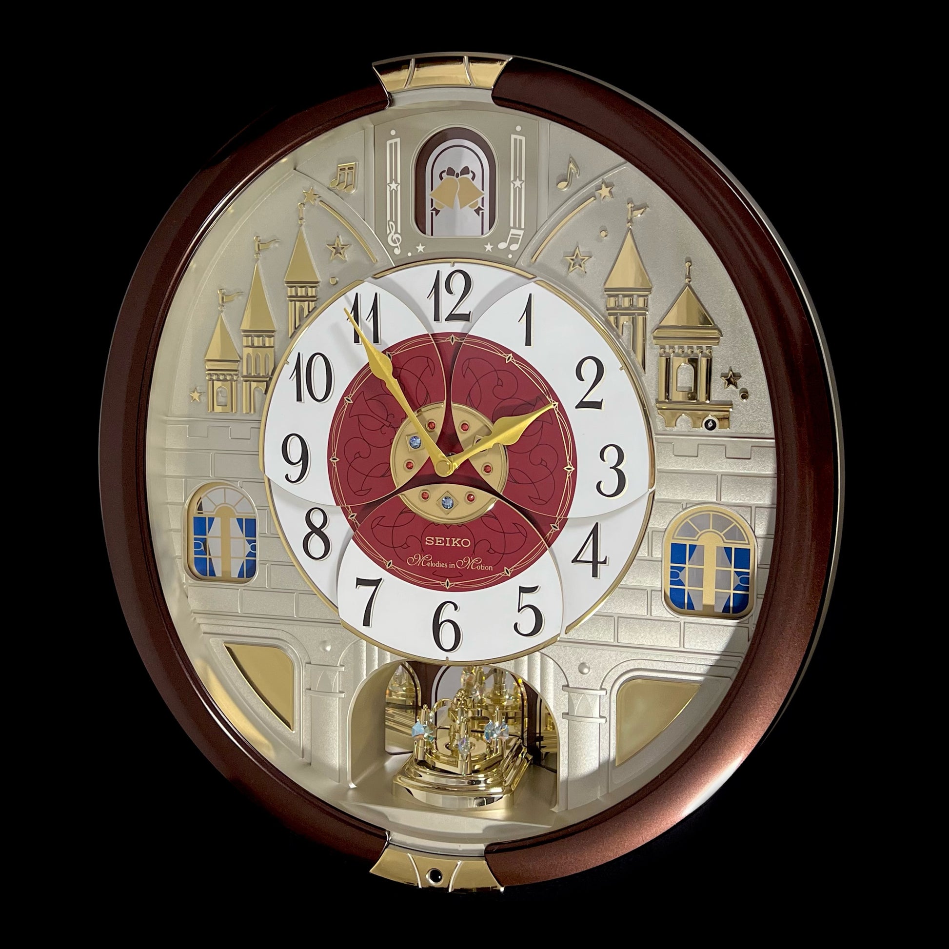 2016 brought yet another one of Seiko’s yearly Special Collector’s Edition Melodies in Motion clocks available exclusively at Sam’s Club. It is one of the post-2012 “new age” models, with a rotating dial that appears to “dance” along to the music. This year, Seiko modified the design slightly to include three declarative doors. Every hour or when the demonstration button is pressed, the doors open up to reveal moving figurines while the striking red dial comes to life and dances along to the tune of one of 24 total melodies. 6 of these 24 melodies are songs by The Beatles, which are now hard-to-find on these clocks due to strict copyright laws. This was the last model to be produced with them. Below the face is a decorative rotating pendulum adorned with Swarovski crystals that rotates continuously.