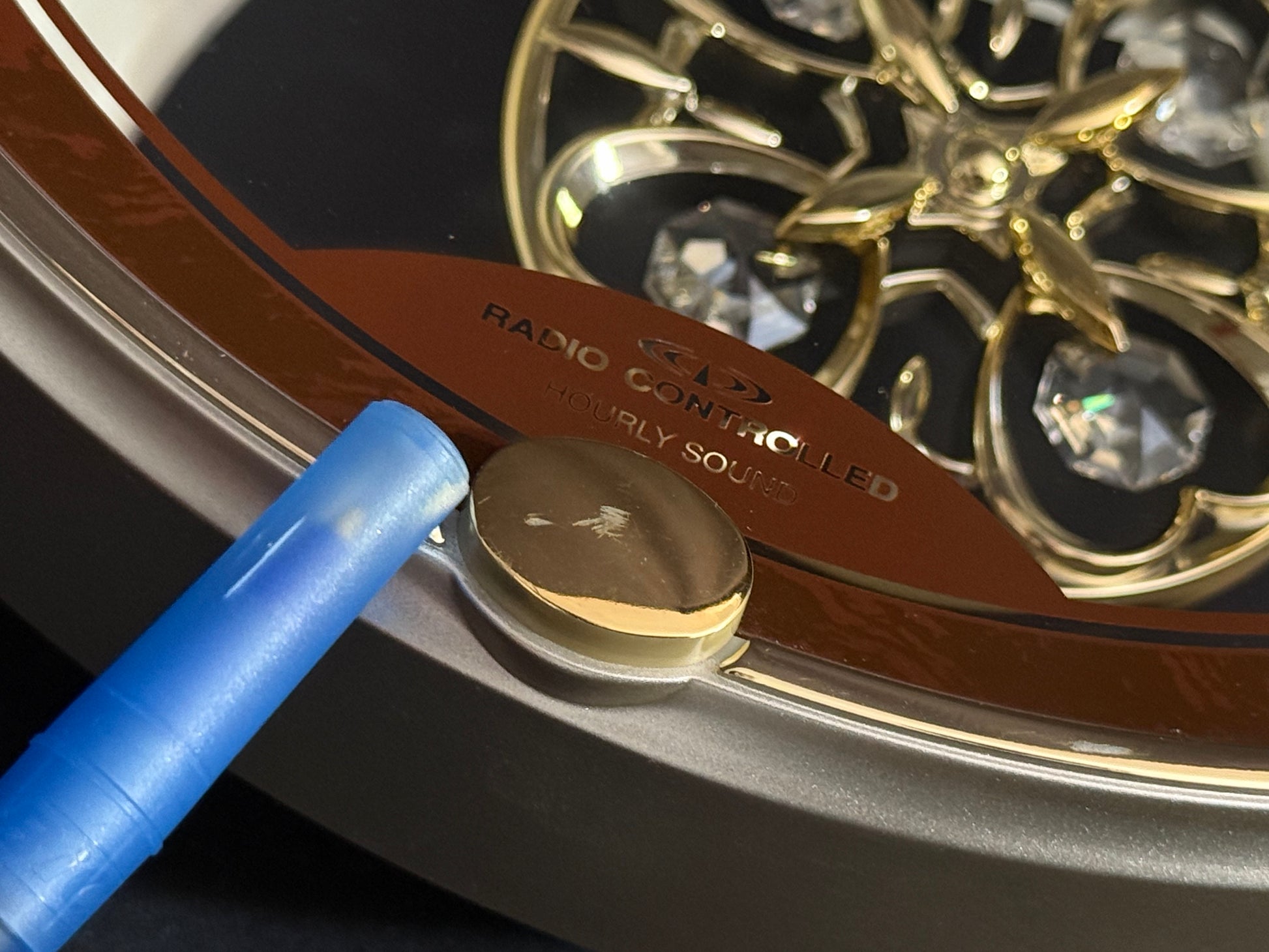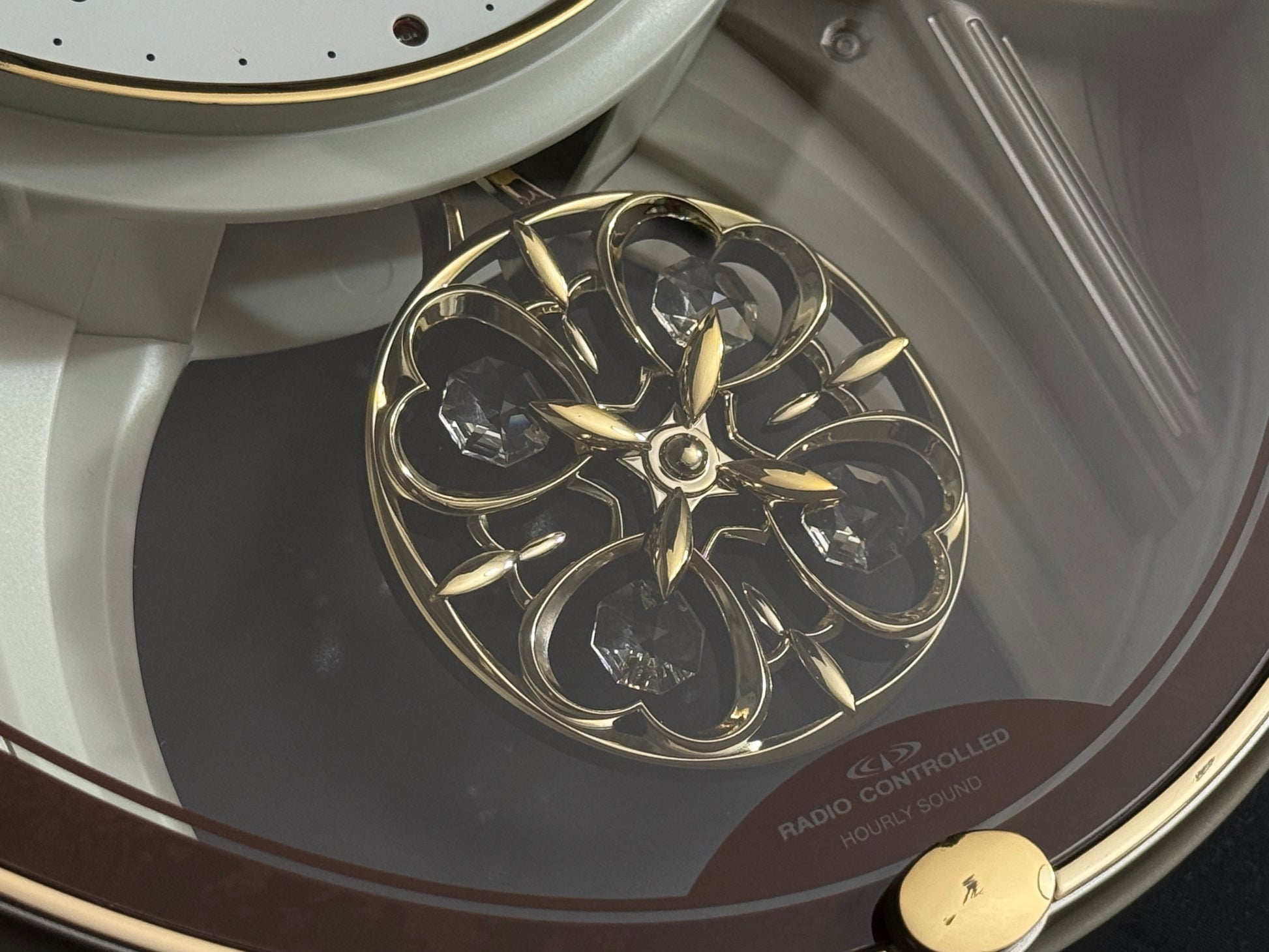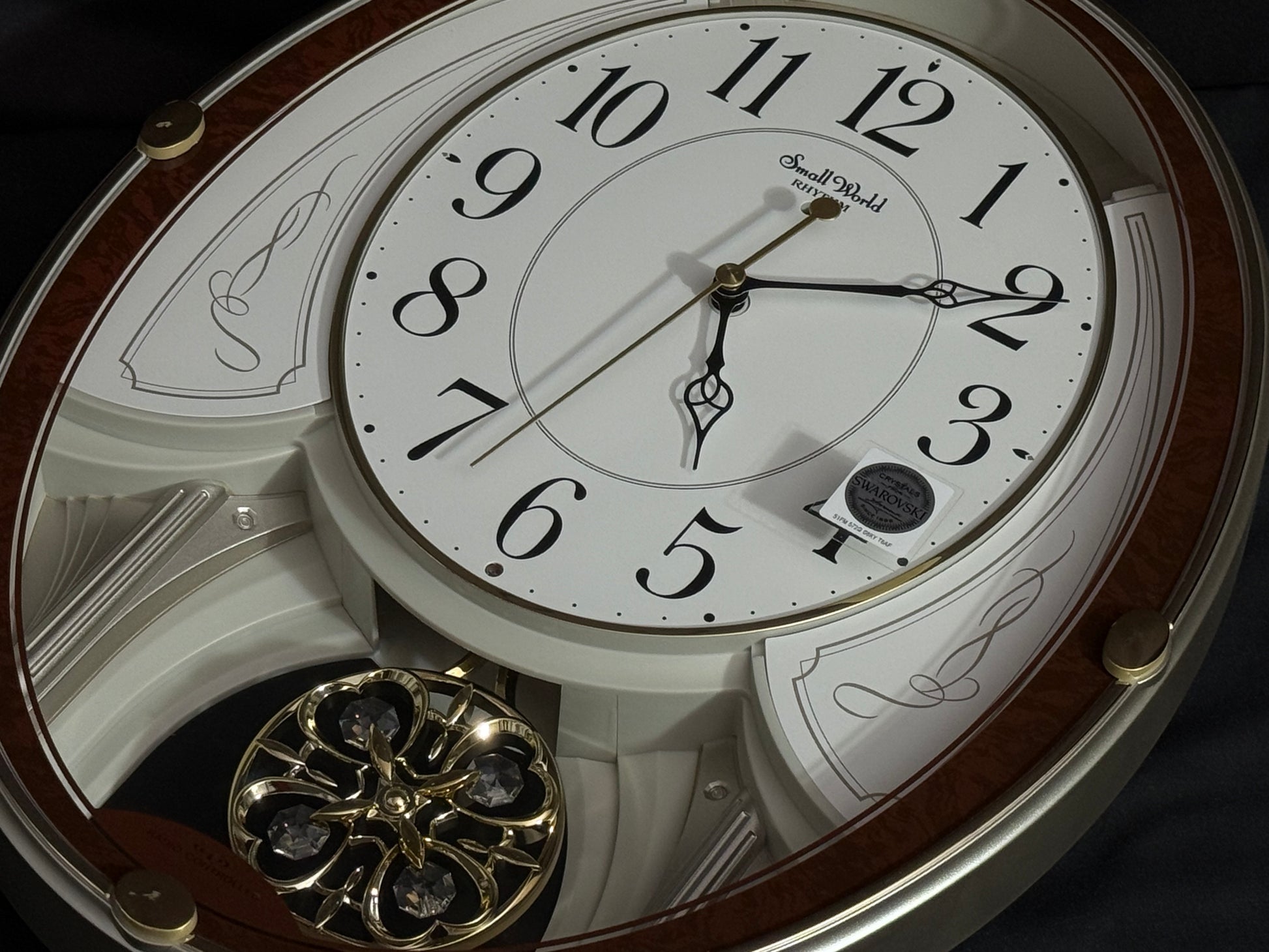 Known as “Small World Serena S” in the Japanese market, this model was imported by Rhythm USA. The Swarovski crystals on the pendulum are typically a bright blue, so I believe that this may have actually been a prototype or a sample of something they were looking into releasing outside of Japan.