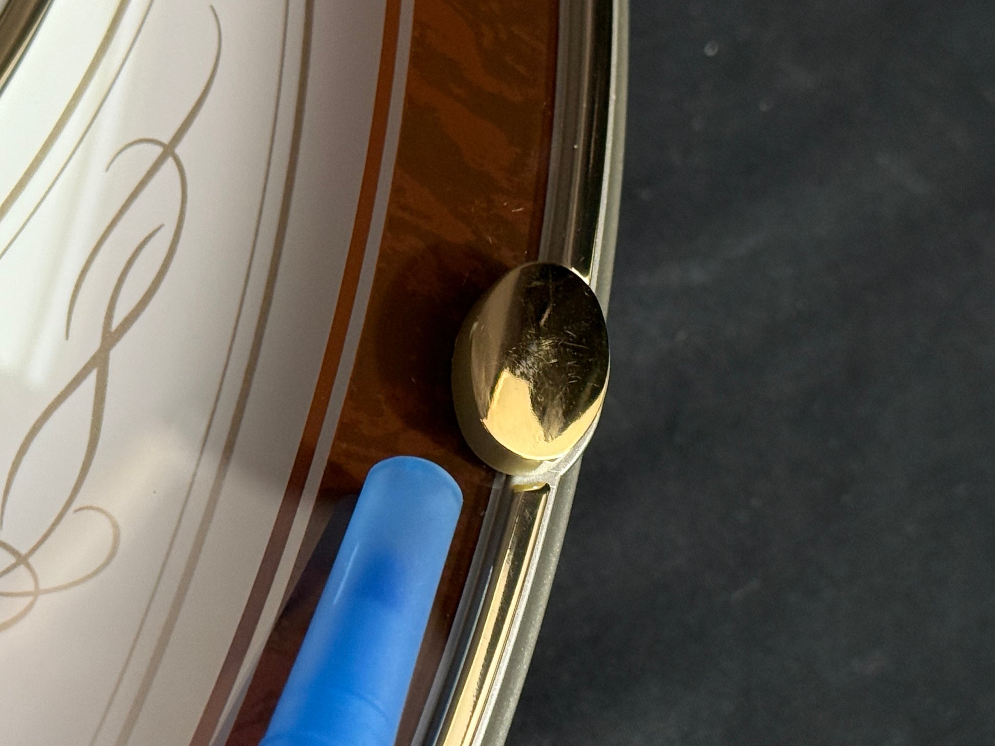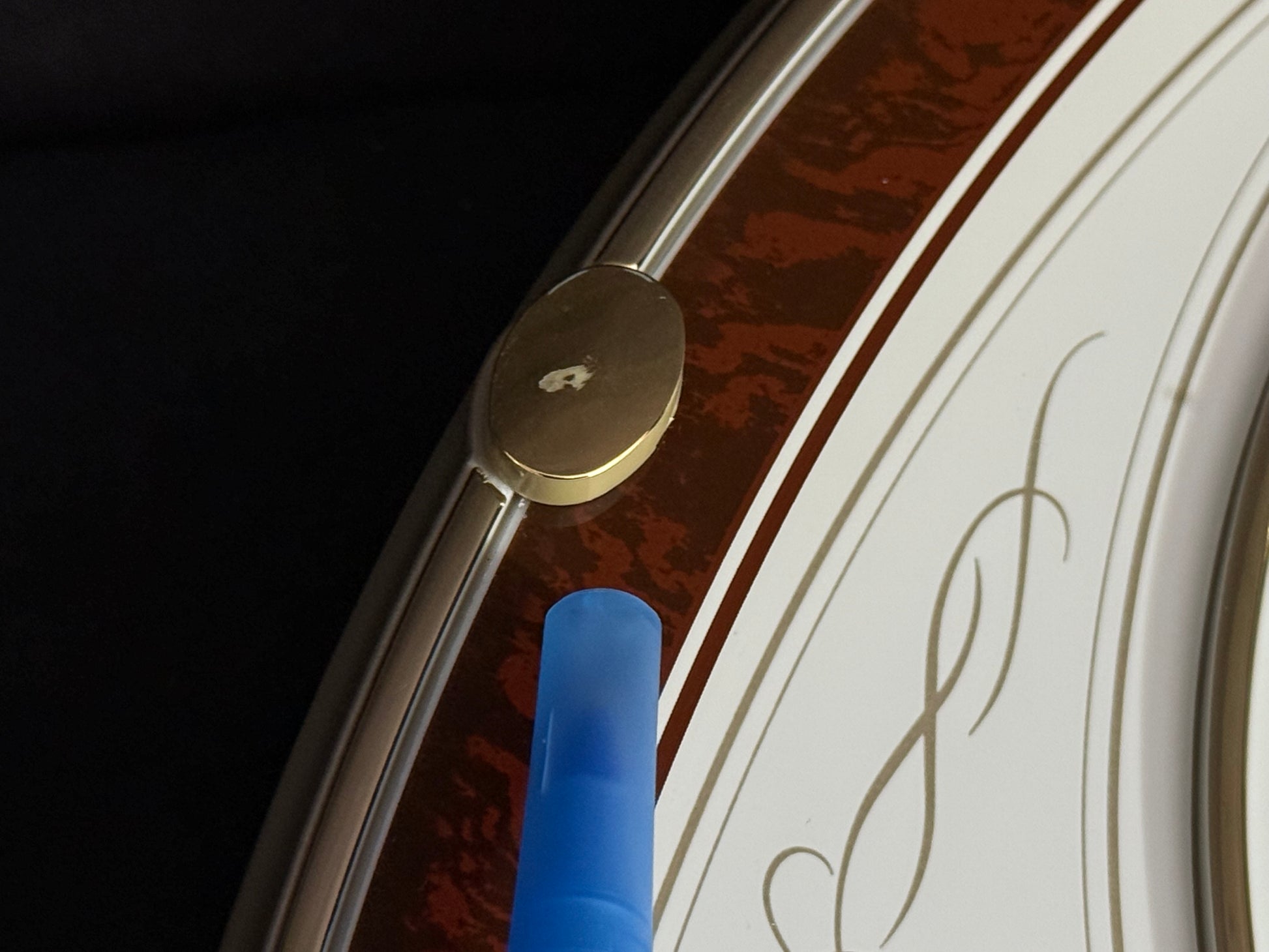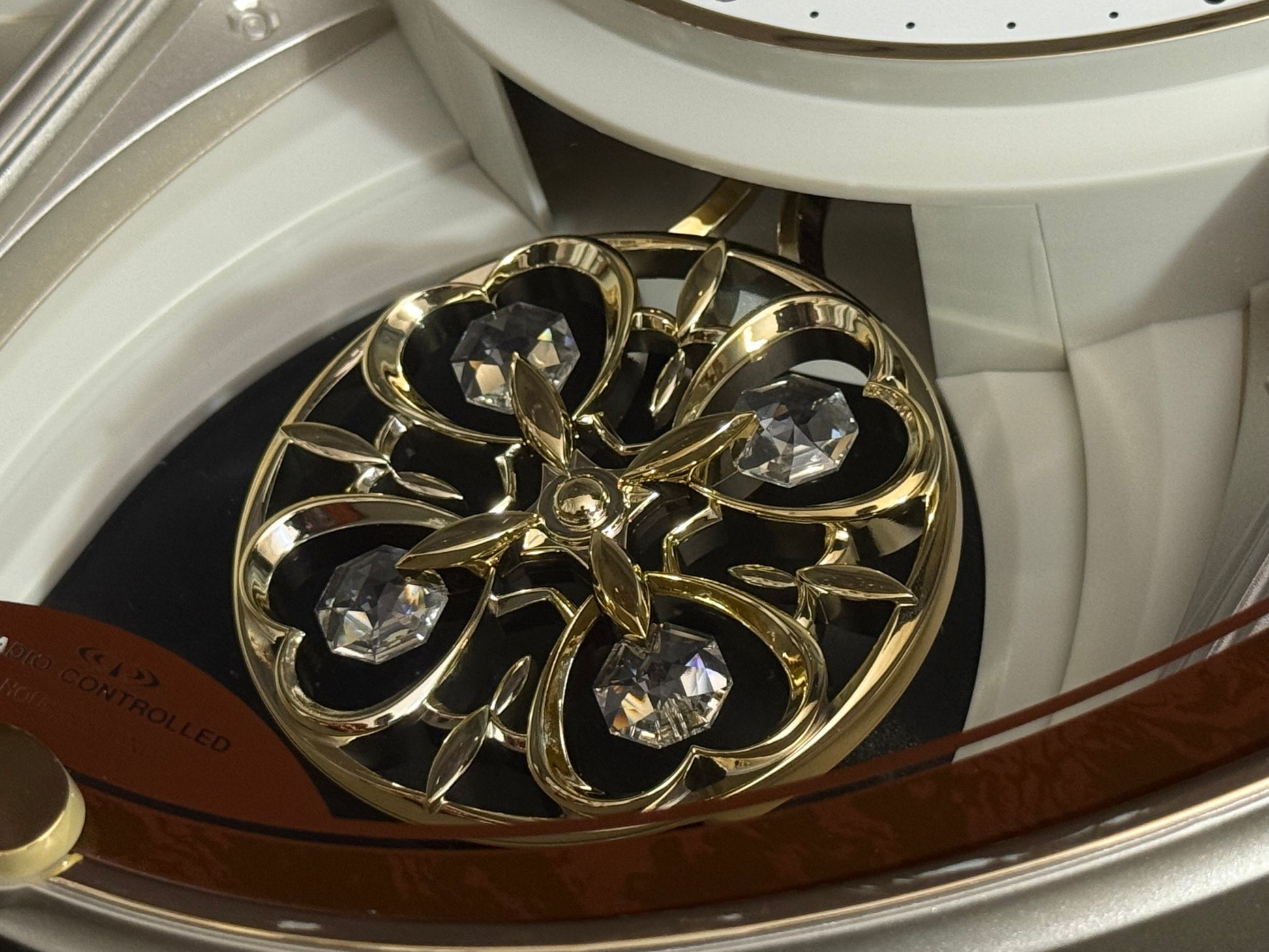 Known as “Small World Serena S” in the Japanese market, this model was imported by Rhythm USA. The Swarovski crystals on the pendulum are typically a bright blue, so I believe that this may have actually been a prototype or a sample of something they were looking into releasing outside of Japan.