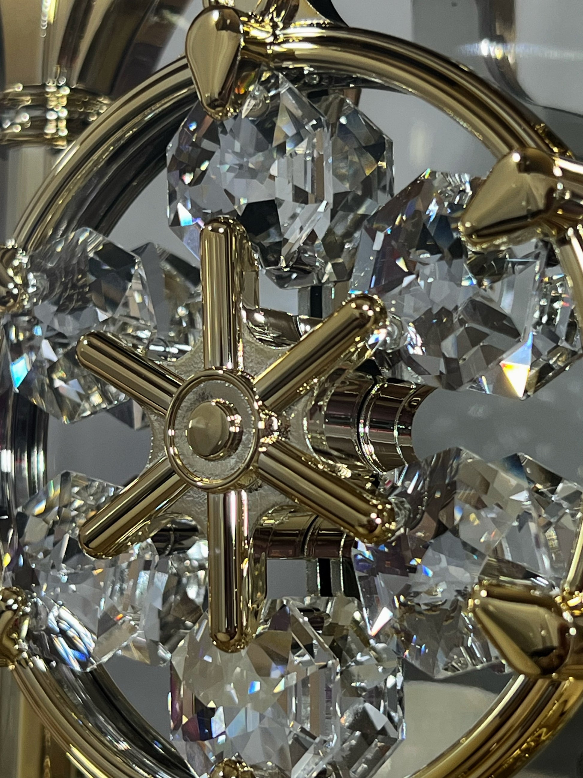 Beauty is encapsulated within the "Champagne Snowflake" musical motion wall clock from Rhythm. The radiant finish of its champagne gold frame shines as it reflects the light. The name "Snowflake" comes from its gently-swinging pendulum adorned with decorative crystals, as it resembles a sparkling snowflake that glistens as it moves back and forth. The overall simplistic design of this clock allows it to blend in with any decor and brings a welcoming presence to your home. At the top of the hour or when the demonstration button is pressed, LED lights twinkle with one of the 18 hourly melodies, split into three genre selections to choose between.