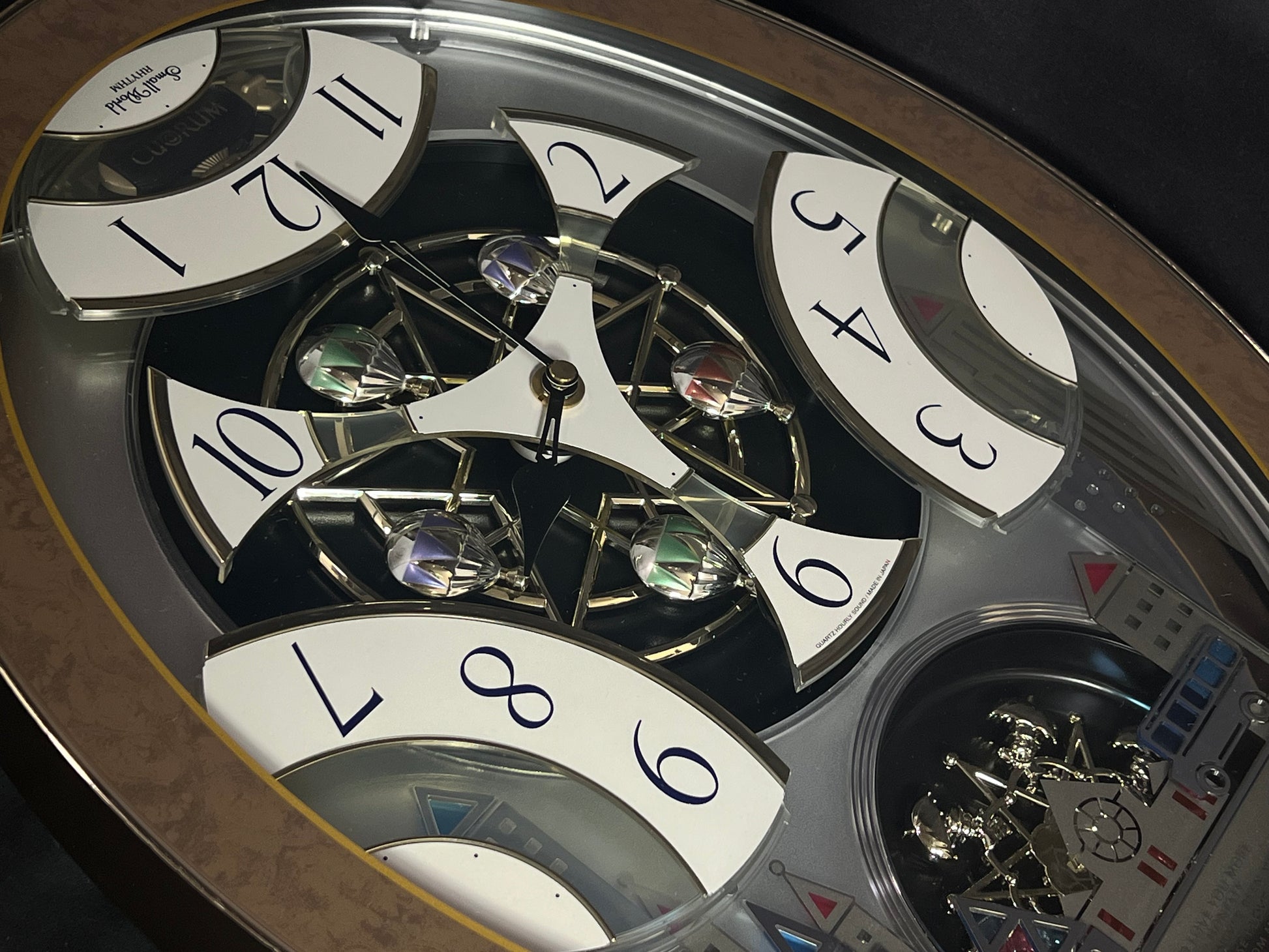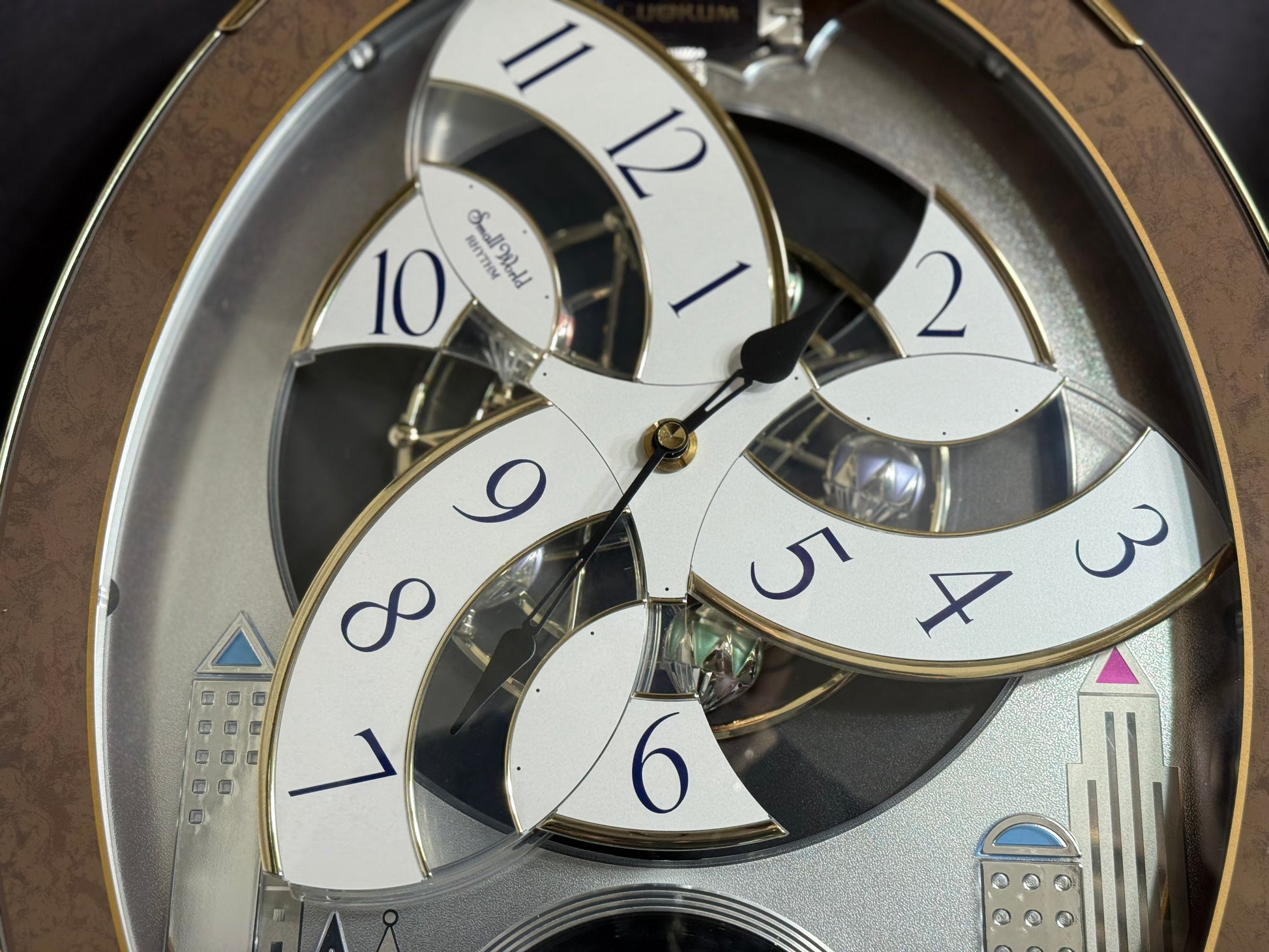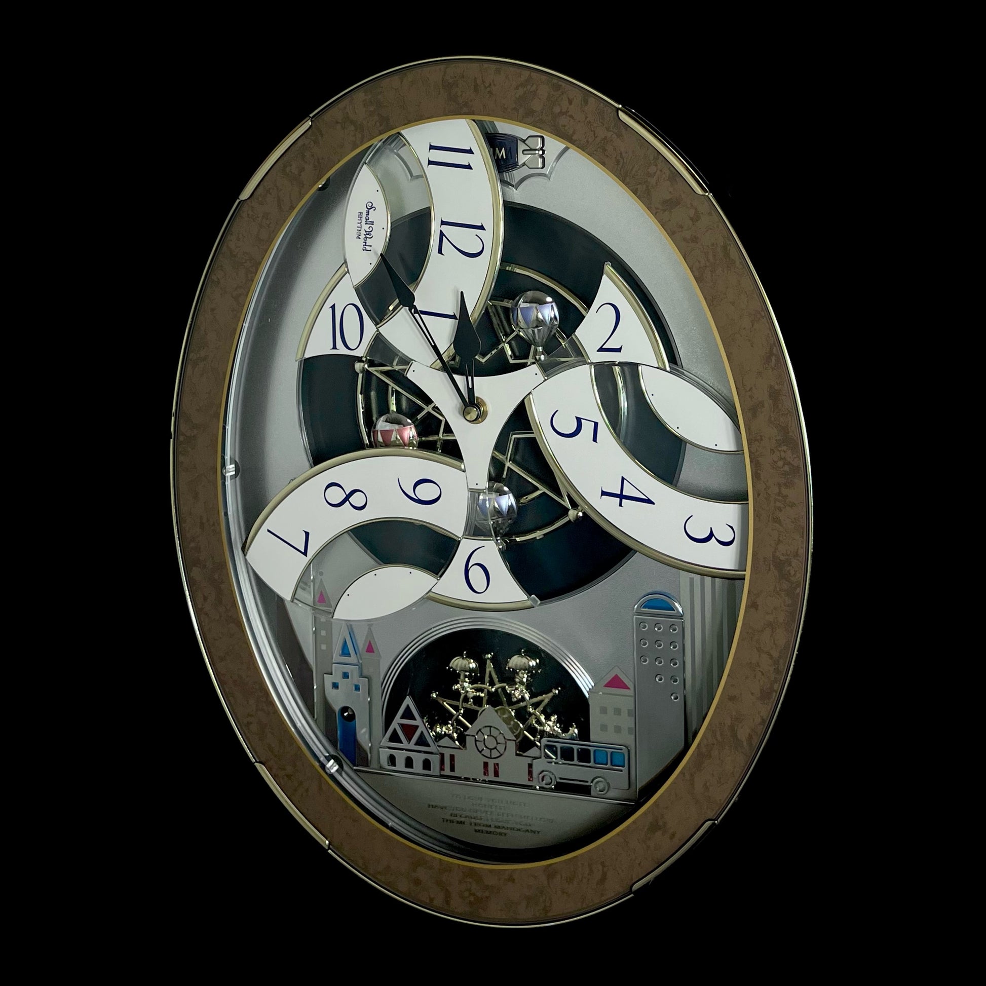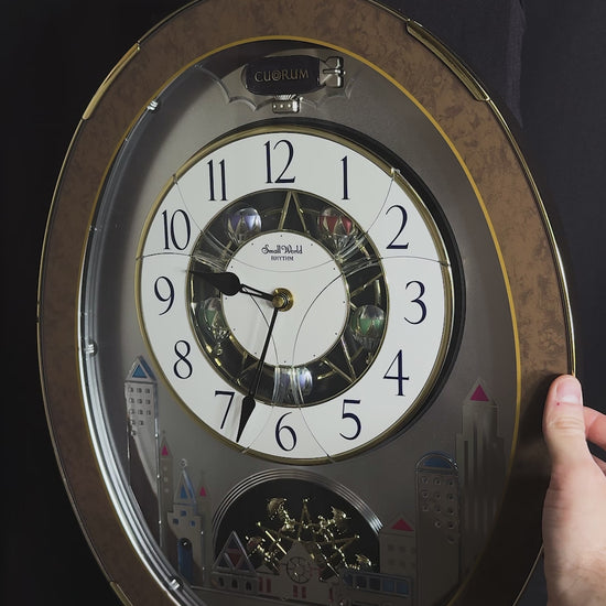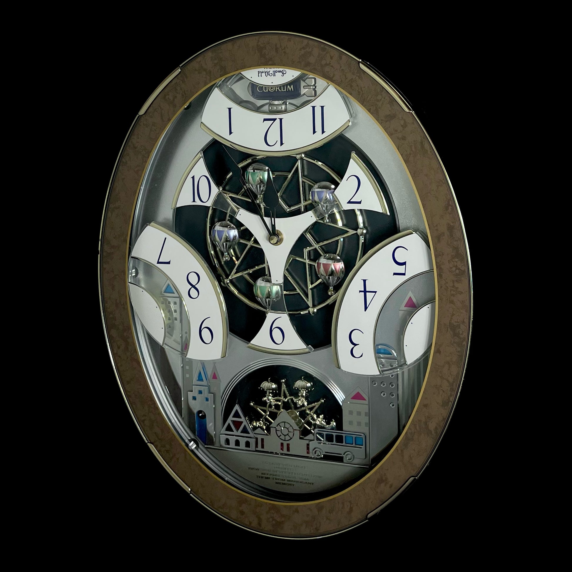Rhythm’s “Tri-Cracker” takes you to a retro view of city festivities. This iconic Magic Motion clock was released in 2000 as an addition to the widely-recognized “Timecracker” family of clocks, but would later become its own series since it had a completely new motion. Today, they are known as the “Glory” series, and they each feature partially transparent 3-piece dials. At the top of the hour or when the demonstration is activated, the dial pieces slide apart and the balloons beneath move as one of 6 popular tunes play in Rhythm’s euphoric Dynamic Wave Sound (DWS), featuring hits like “Honesty” by Billy Joel and the theme from “Mahogany”. This exact song list was only available on three different models, making it difficult to find since two of them (including this one) were retired in 2005. It is encased in a thin metallic gray frame with a brown and gold pattern on the glass. The multi-layered design of the city buildings beneath the dial partially hide a continuously-rotating decorative wheel.