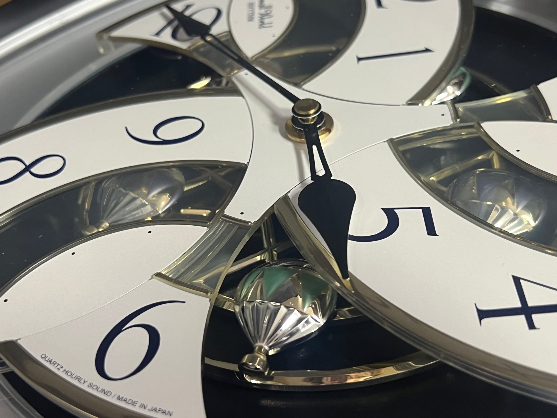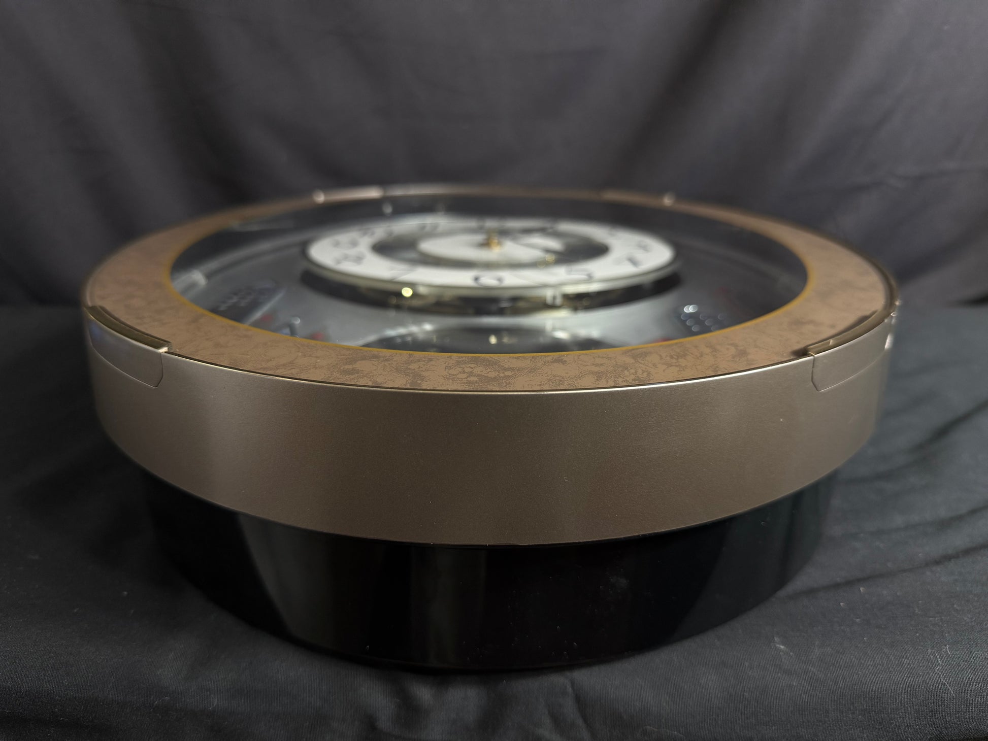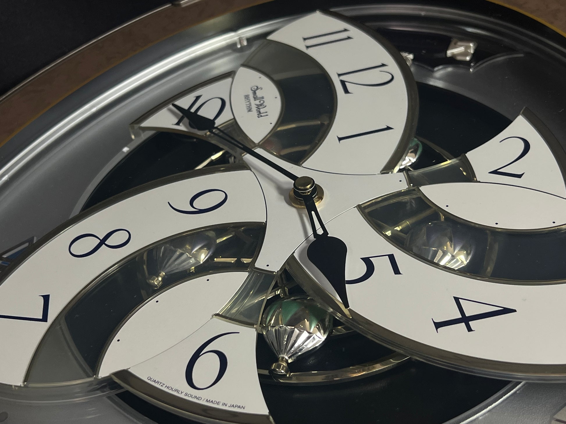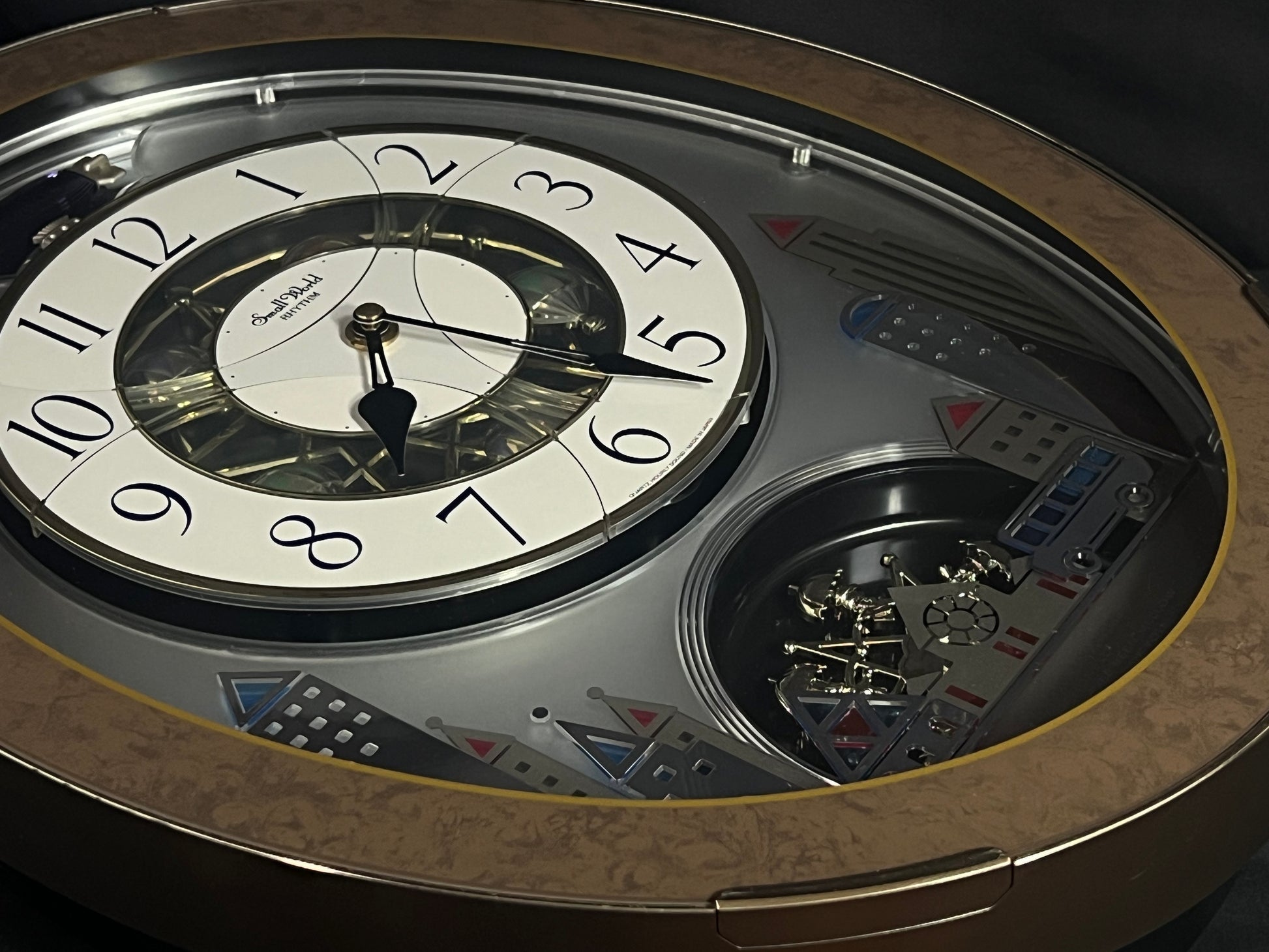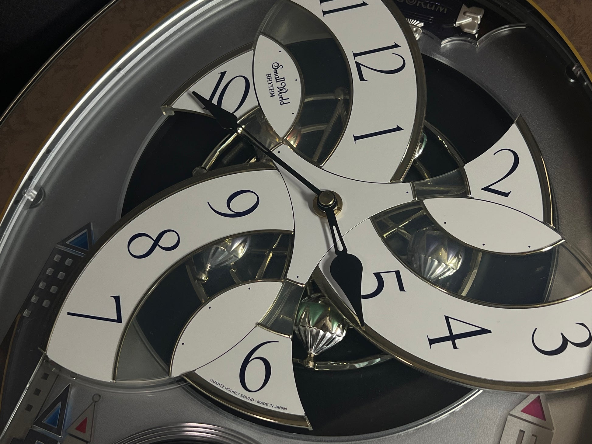 Rhythm’s “Tri-Cracker” takes you to a retro view of city festivities. This iconic Magic Motion clock was released in 2000 as an addition to the widely-recognized “Timecracker” family of clocks, but would later become its own series since it had a completely new motion. Today, they are known as the “Glory” series, and they each feature partially transparent 3-piece dials. At the top of the hour or when the demonstration is activated, the dial pieces slide apart and the balloons beneath move as one of 6 popular tunes play in Rhythm’s euphoric Dynamic Wave Sound (DWS), featuring hits like “Honesty” by Billy Joel and the theme from “Mahogany”. This exact song list was only available on three different models, making it difficult to find since two of them (including this one) were retired in 2005. It is encased in a thin metallic gray frame with a brown and gold pattern on the glass. The multi-layered design of the city buildings beneath the dial partially hide a continuously-rotating decorative wheel.