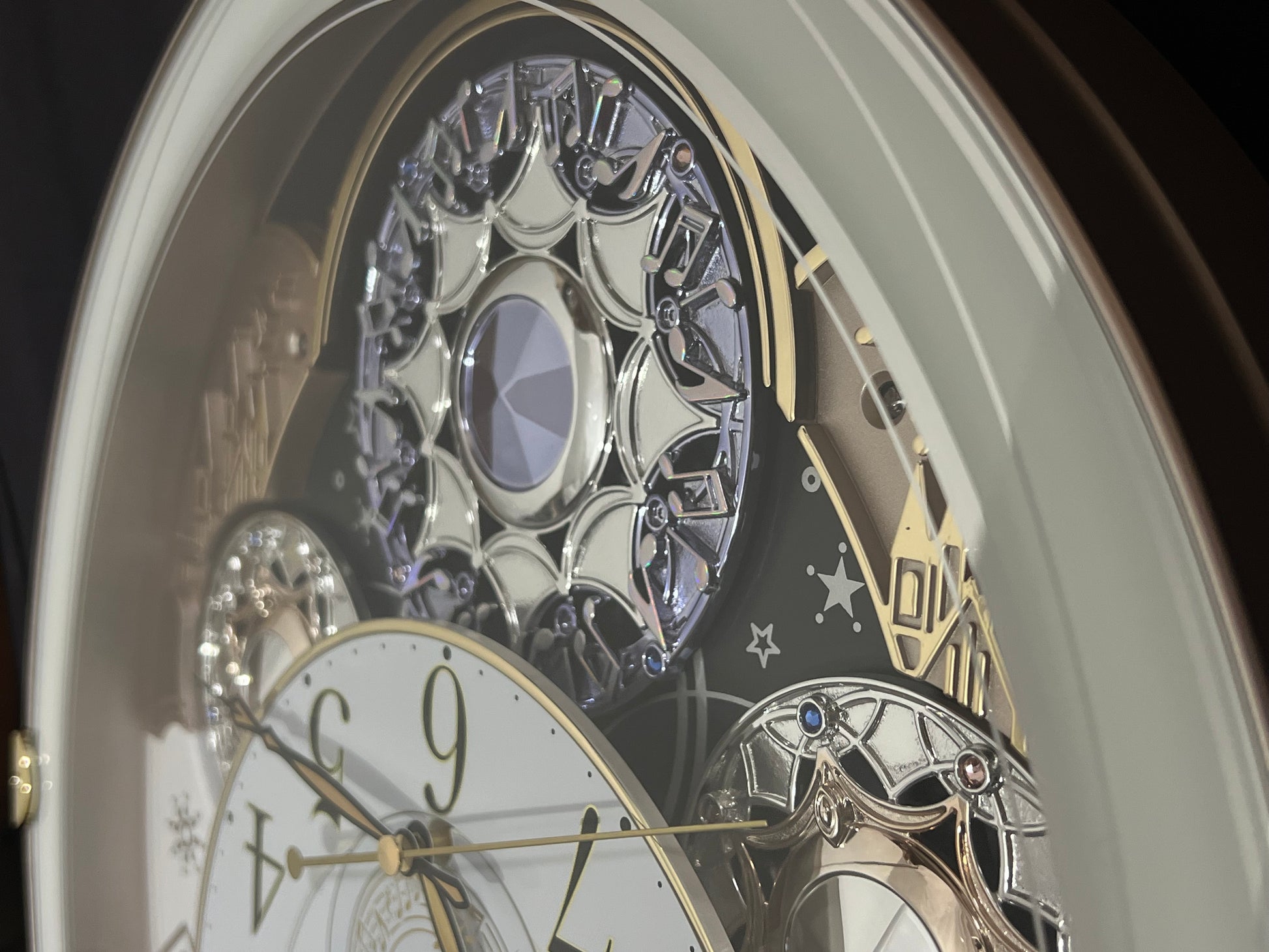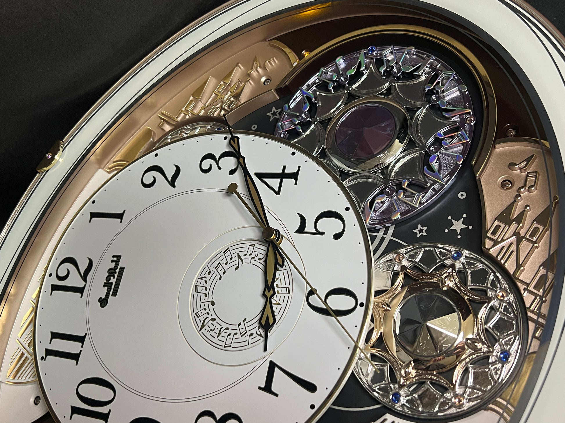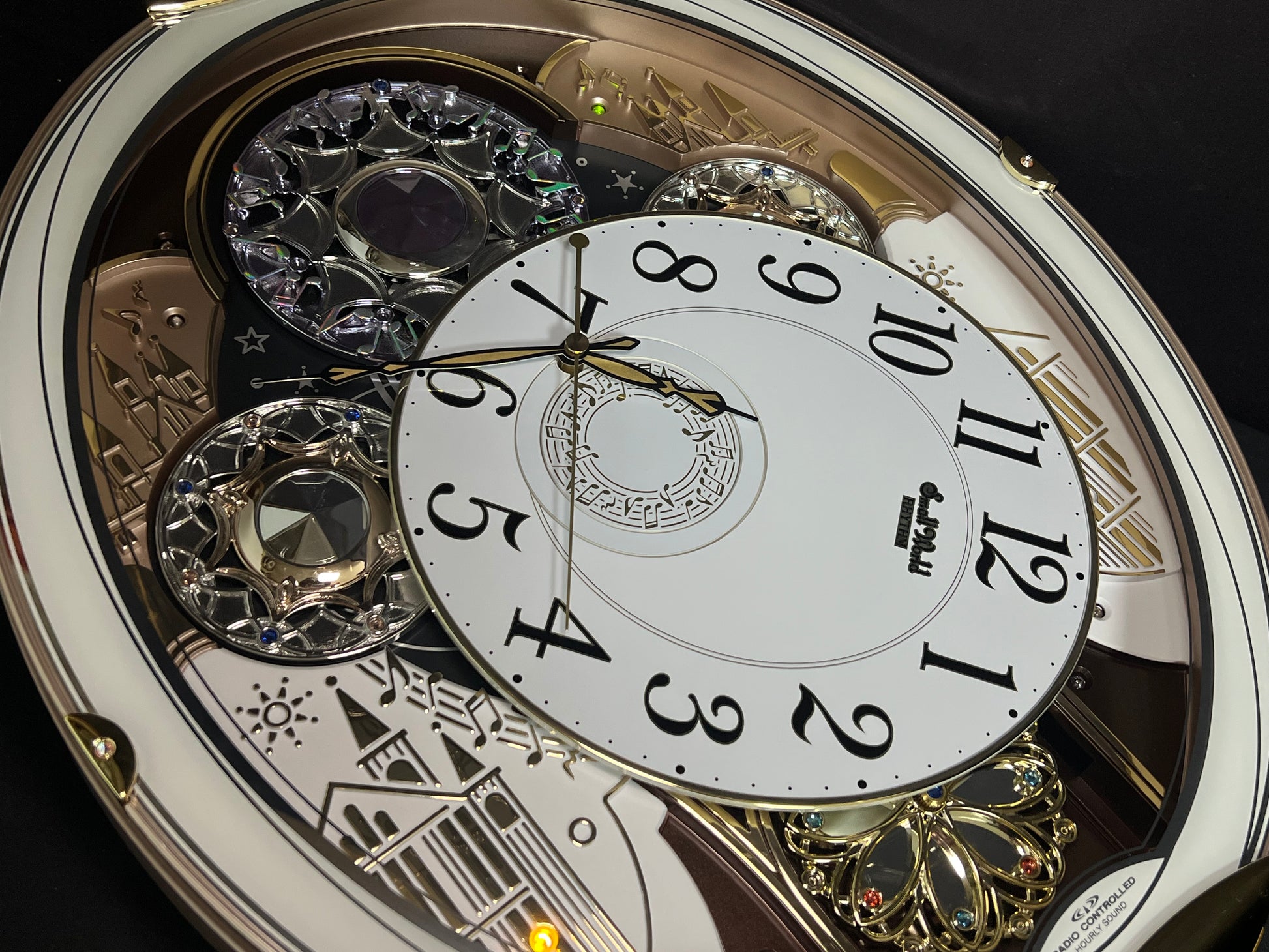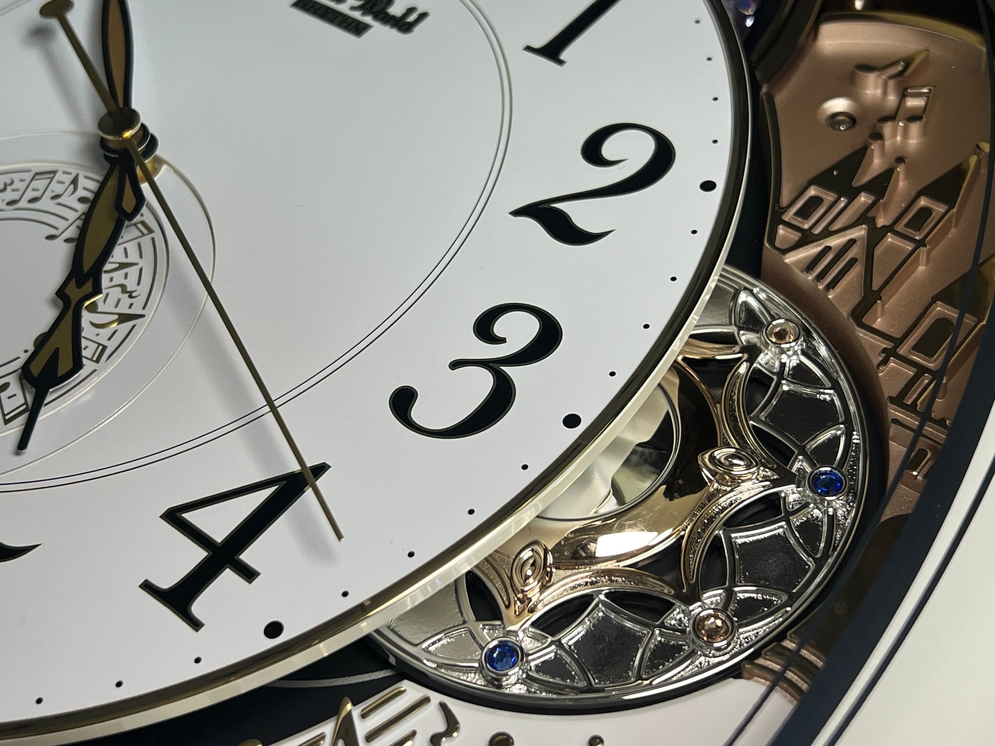 Embrace the festive spirit of Rhythm’s “Small World Noel” Karakuri clock. Released in 2012, this Japanese version of the “Gala” Magic Motion clock was available in two colors: brown and white. On the hour or when the demonstration button is pressed, 1 of 30 melodies play as the dial rotates 360 degrees to reveal three rotating discs underneath. As they rotate, the discs shimmer and glisten with their iridescent finish, especially the large blue one near the top. Although the Japanese and American models look similar in appearance, their movement slightly differs from one another. The dials on the Japanese versions pause every 90 degrees, whereas the American versions do not. The Japanese version also features the addition of introductory and closing melodies, which were exempt from the American versions. The decorative Swarovski crystal wheel below the face rotates continuously.