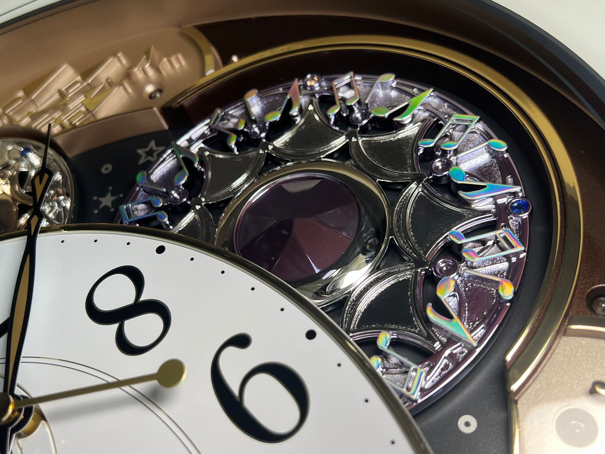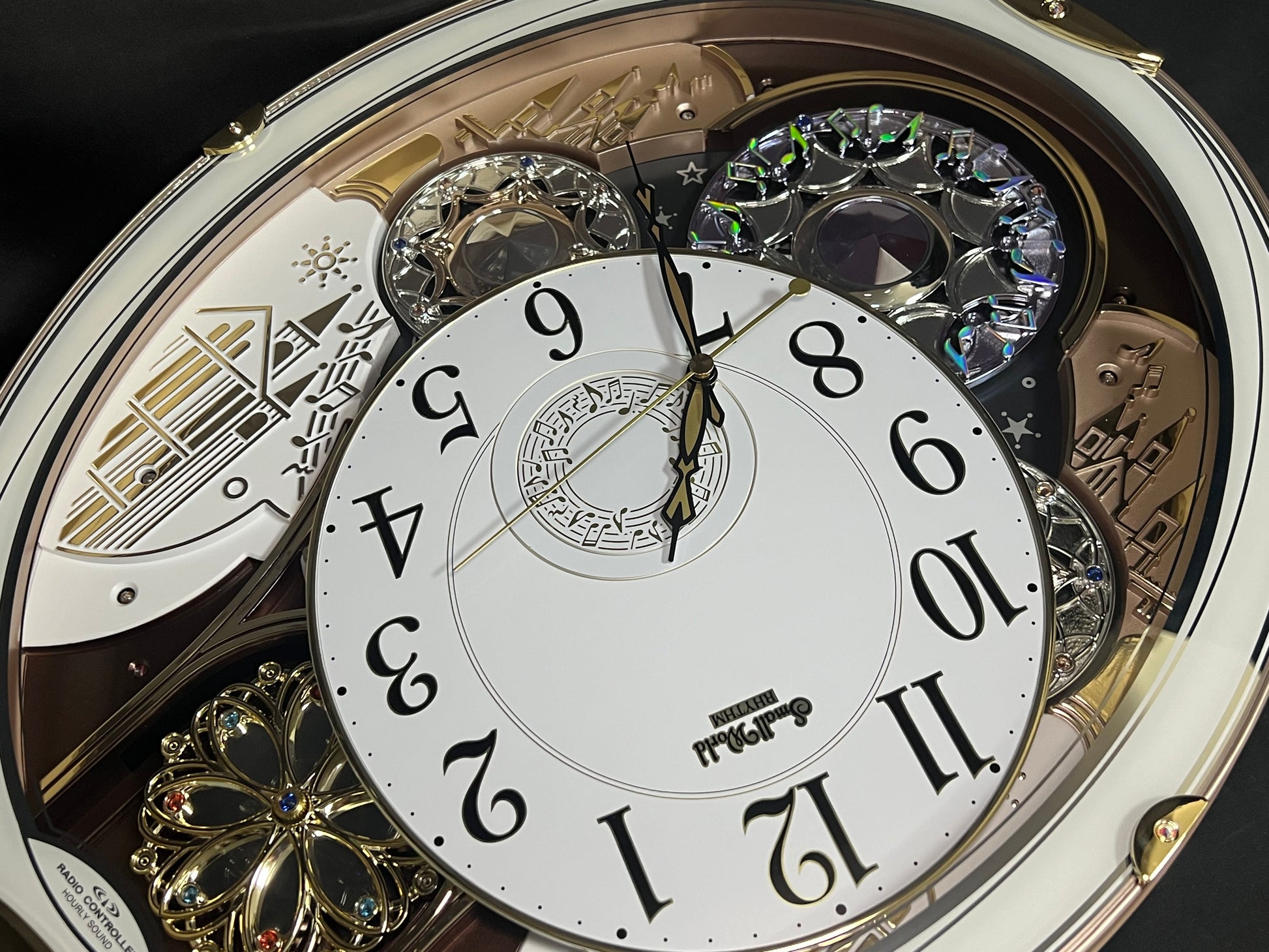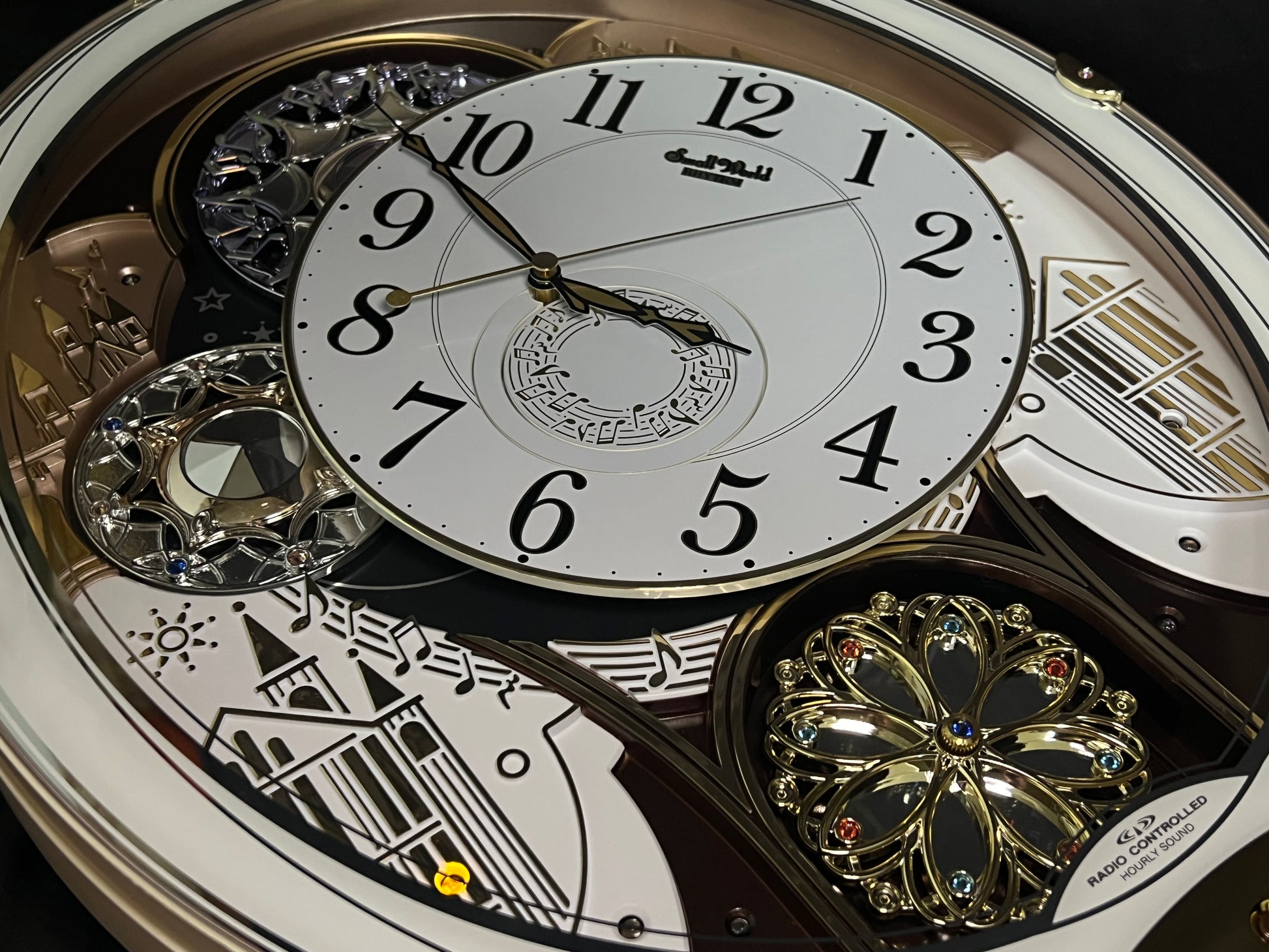 Embrace the festive spirit of Rhythm’s “Small World Noel” Karakuri clock. Released in 2012, this Japanese version of the “Gala” Magic Motion clock was available in two colors: brown and white. On the hour or when the demonstration button is pressed, 1 of 30 melodies play as the dial rotates 360 degrees to reveal three rotating discs underneath. As they rotate, the discs shimmer and glisten with their iridescent finish, especially the large blue one near the top. Although the Japanese and American models look similar in appearance, their movement slightly differs from one another. The dials on the Japanese versions pause every 90 degrees, whereas the American versions do not. The Japanese version also features the addition of introductory and closing melodies, which were exempt from the American versions. The decorative Swarovski crystal wheel below the face rotates continuously.