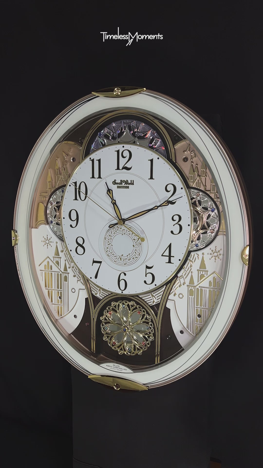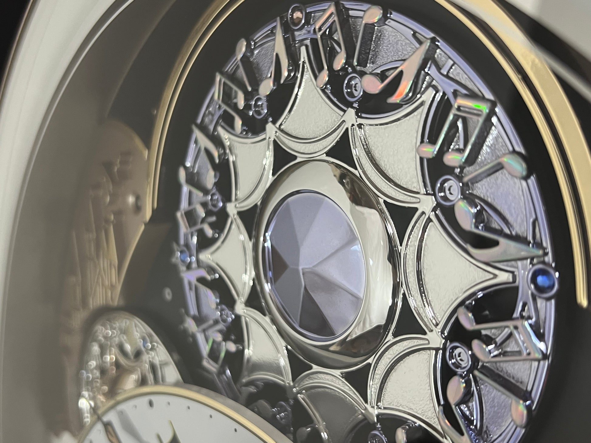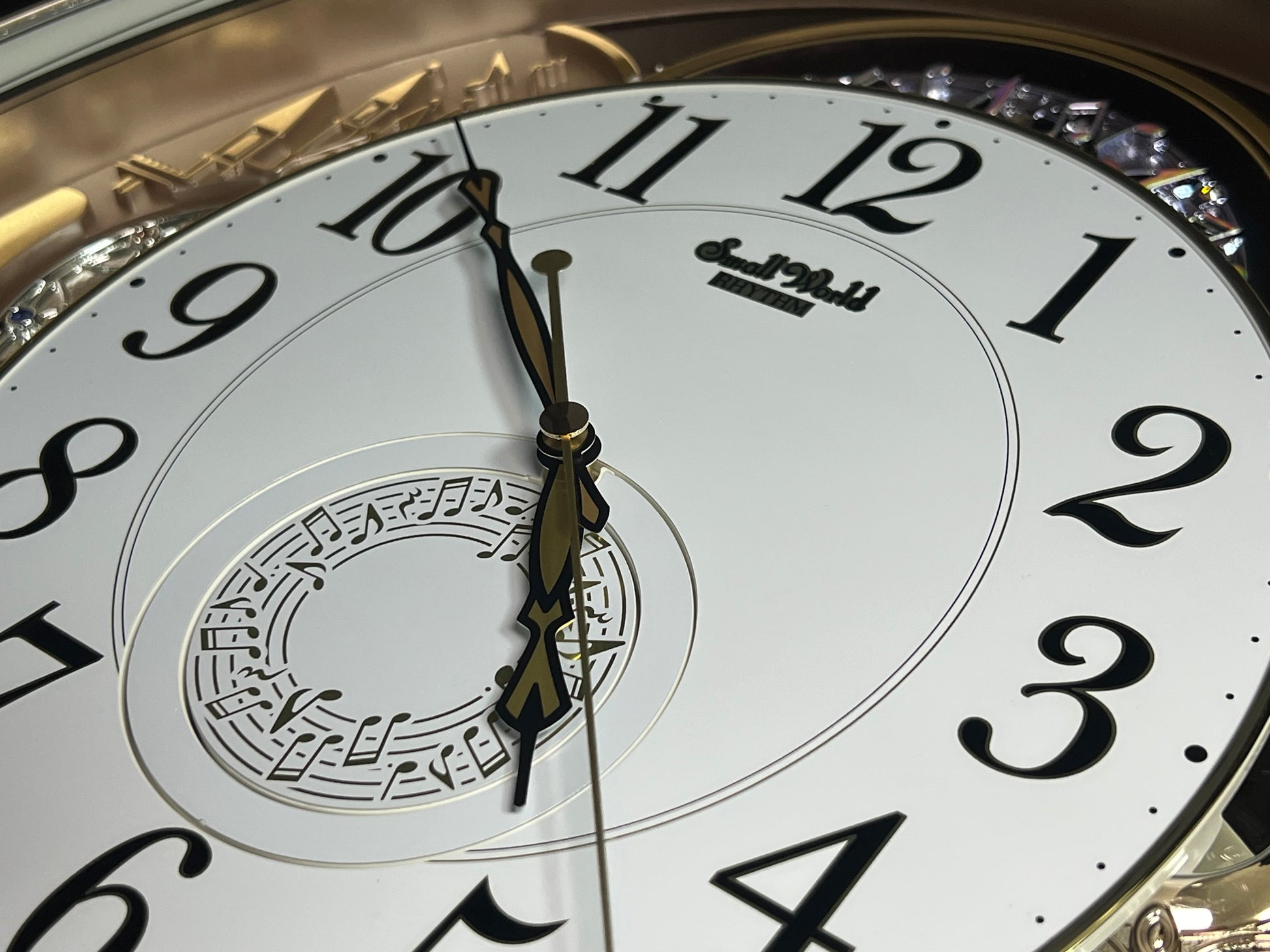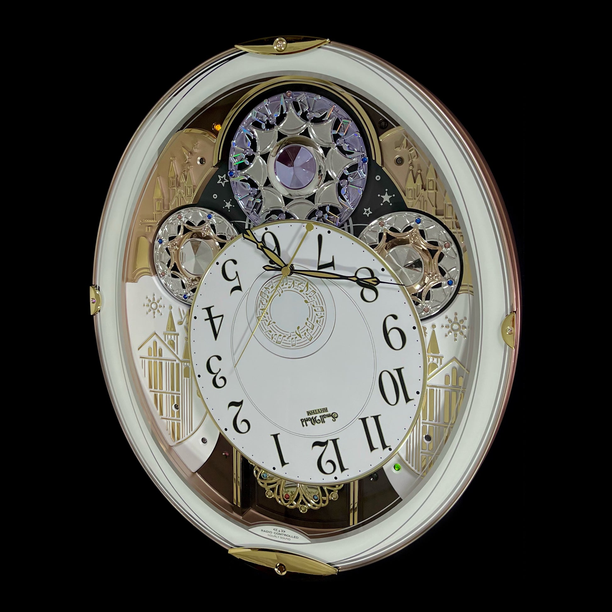 Embrace the festive spirit of Rhythm’s “Small World Noel” Karakuri clock. Released in 2012, this Japanese version of the “Gala” Magic Motion clock was available in two colors: brown and white. On the hour or when the demonstration button is pressed, 1 of 30 melodies play as the dial rotates 360 degrees to reveal three rotating discs underneath. As they rotate, the discs shimmer and glisten with their iridescent finish, especially the large blue one near the top. Although the Japanese and American models look similar in appearance, their movement slightly differs from one another. The dials on the Japanese versions pause every 90 degrees, whereas the American versions do not. The Japanese version also features the addition of introductory and closing melodies, which were exempt from the American versions. The decorative Swarovski crystal wheel below the face rotates continuously.